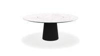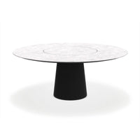 The Materic table features a luxurious white Carrera marble top  with a rotating central disc. The base, created from 12 black stained solid ash boards masterfully turned and connected to one another using finger joints, forms a perfect truncated cone, highlighted with a gorgeous wood grain pattern.