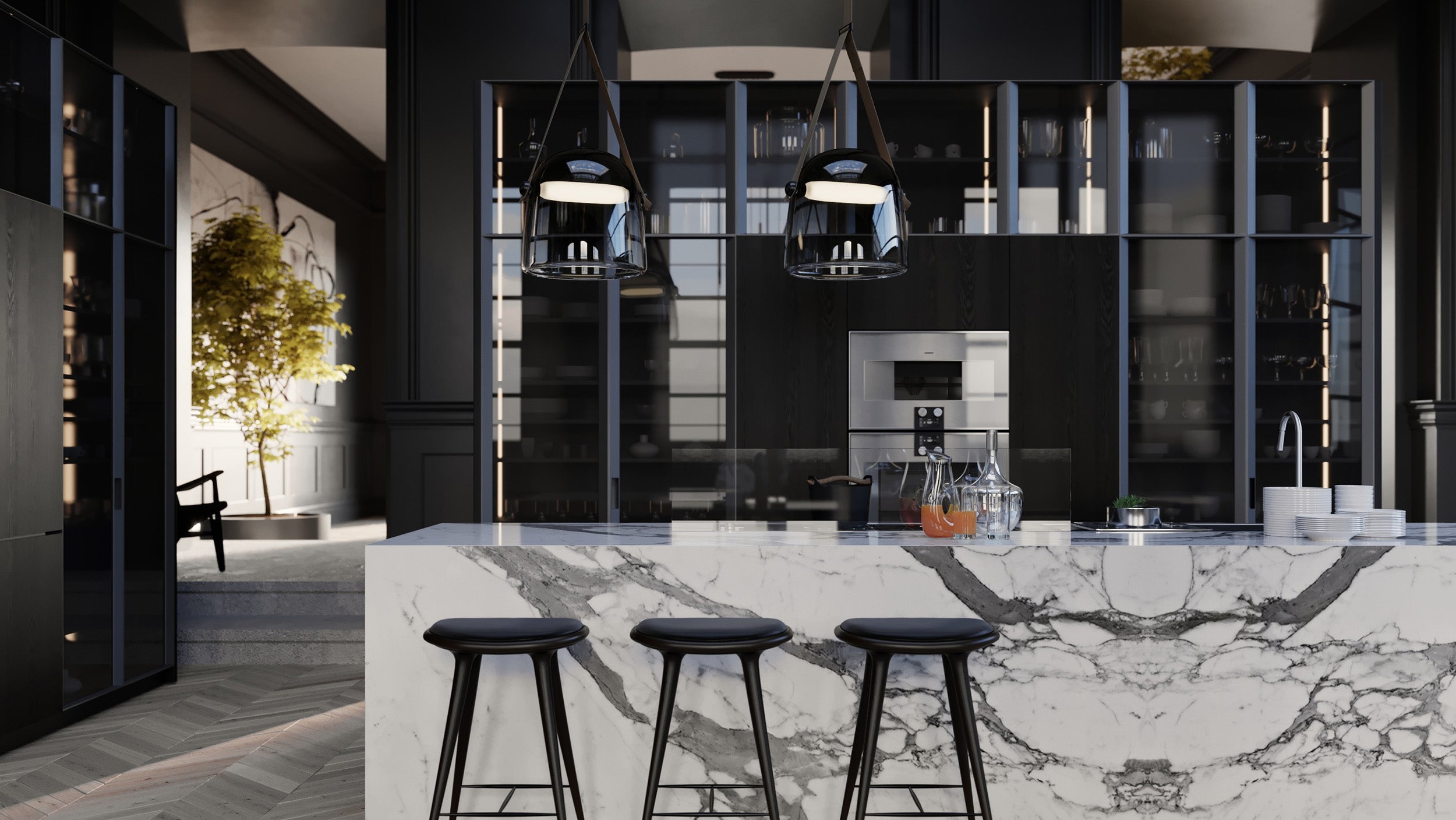 • Crafted from glass, metal, and leather with options for customization in finishes and materials