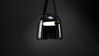 • Hand-blown glass shade with a minimalist LED light source traversing its center