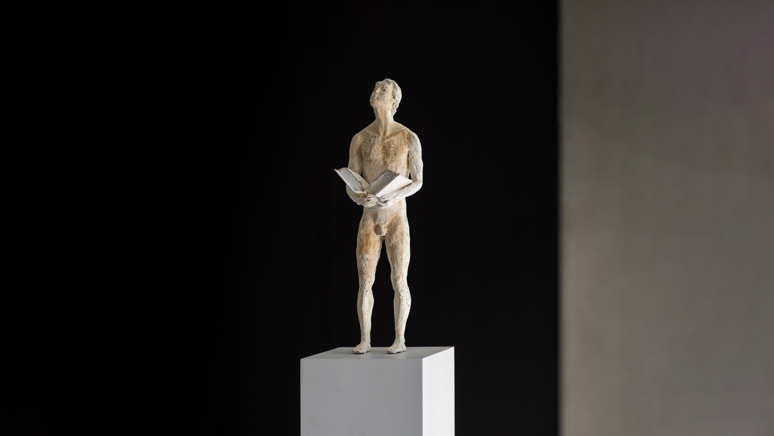 - Depicts a stylised figure holding an open book, symbolising knowledge, introspection and human thought
