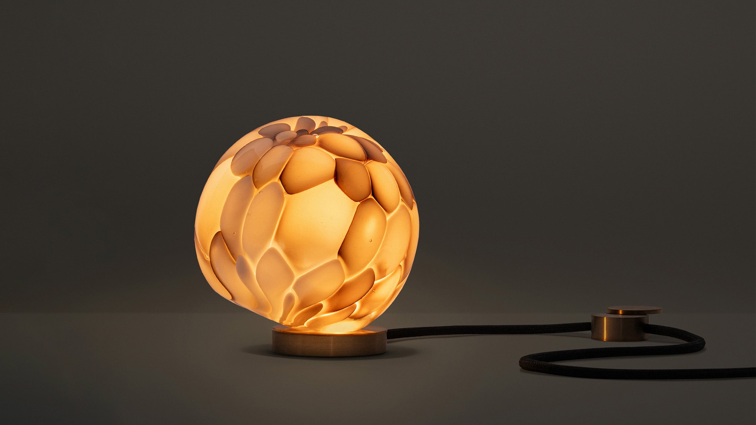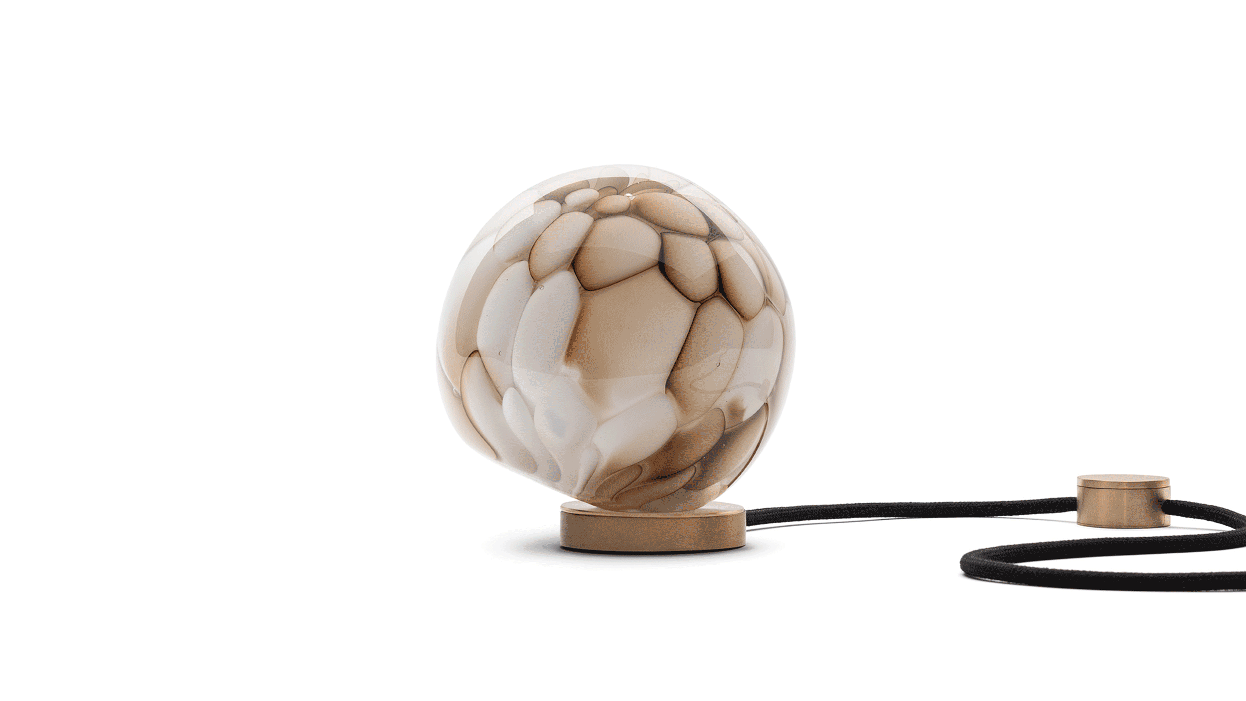 The 118t Table Lamp, designed by Omer Arbel for Bocci, captures delicate detail and glowing warmth in a compact, expressive form. Dozens of feather-like impressions are frozen in opal glass, which come alive when illuminated to reveal intricate natural motifs. A slim brass cylinder houses the dimmer on its cable, offering tactile brightness control while preserving a clean aesthetic. Lightweight yet richly textured, this lamp is ideal for nightstands, desks, or intimate corners where craftsmanship is foregrounded.