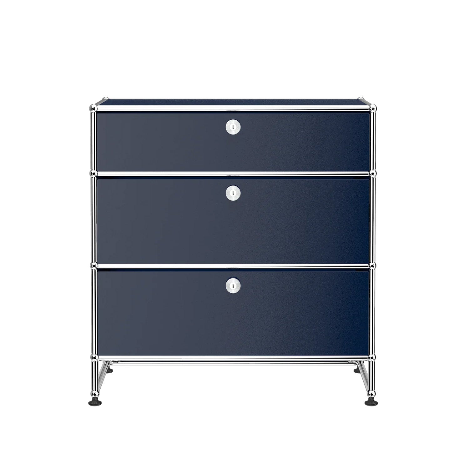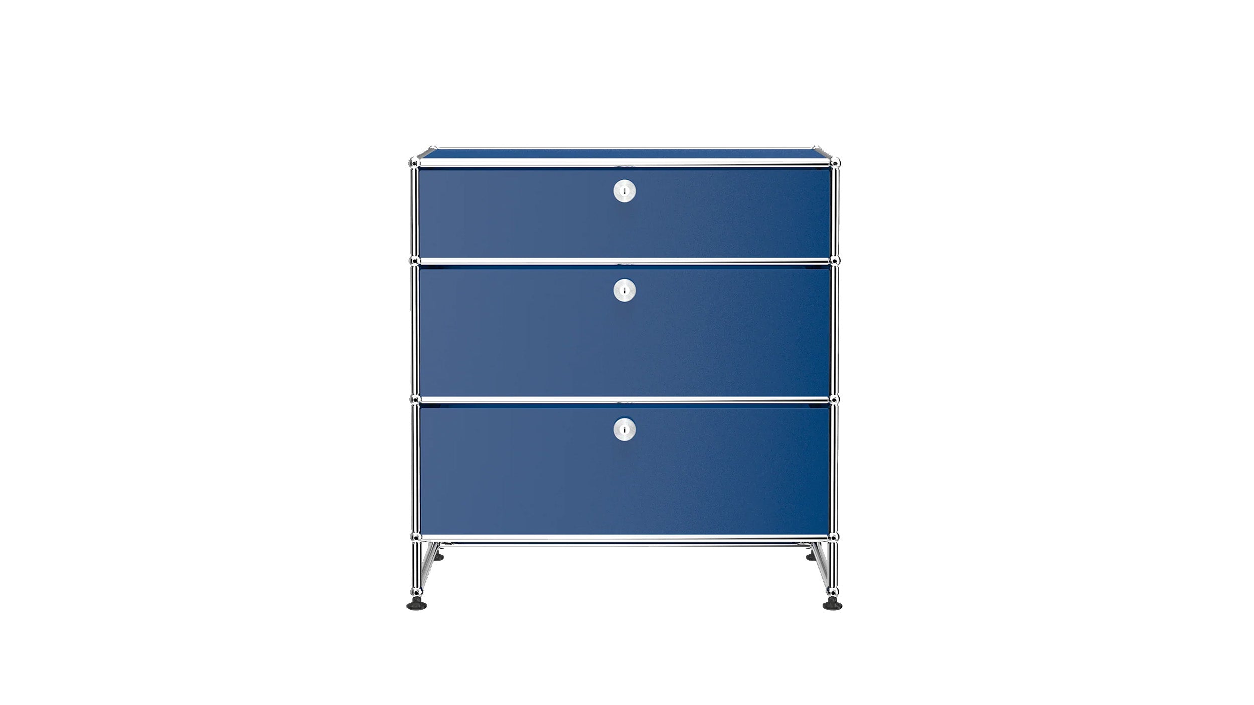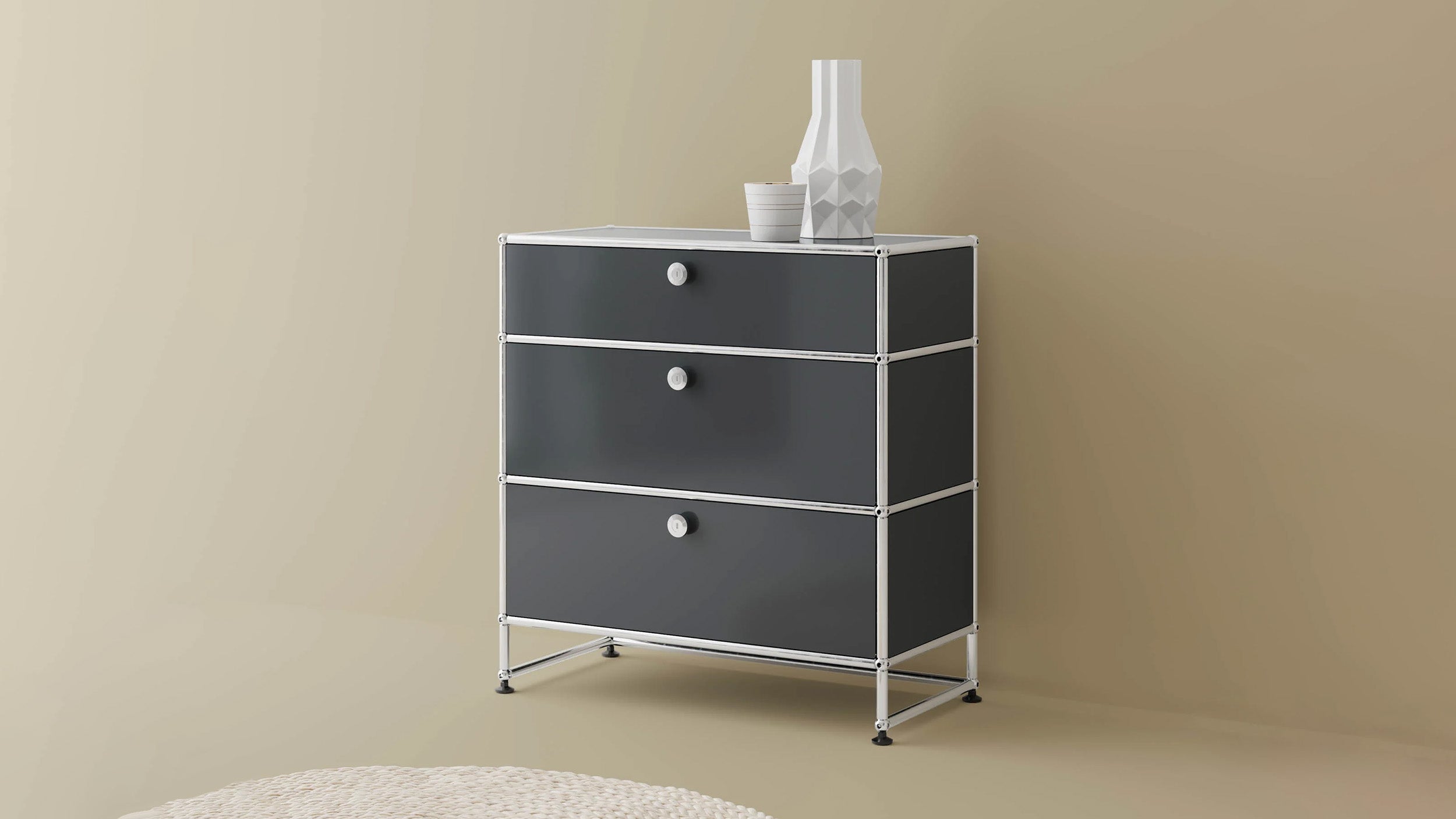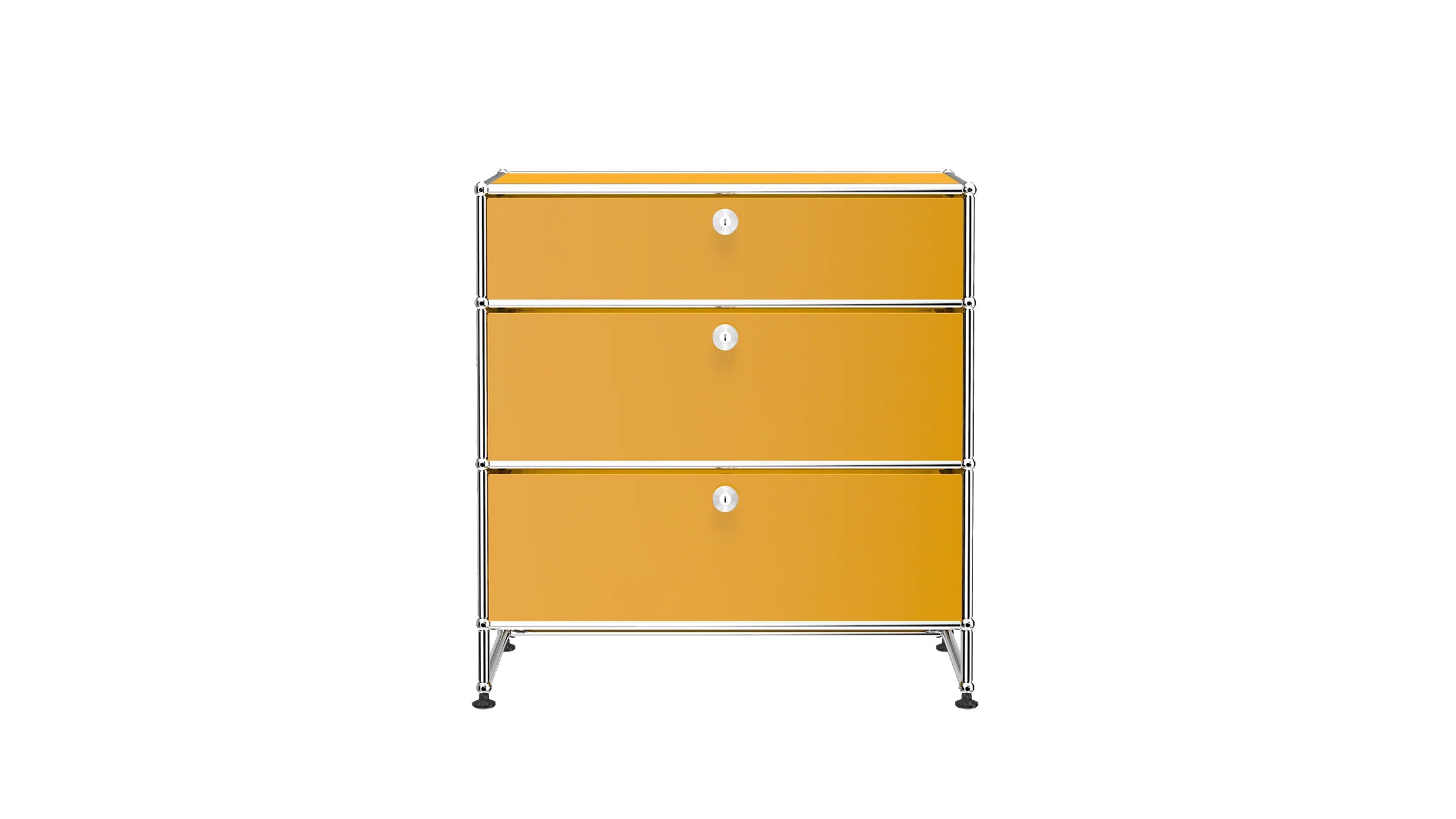 3 Drawer Storage (Y) is a refined storage credenza featuring one 6-inch drawer and two 10-inch drawers set on an elevated 4-inch base frame. This configuration creates a more substantial storage piece while preserving a light, architectural feel. Available in 7 standard surface colors, it can be specified to complement a wide range of bedroom, living room, or office interiors.