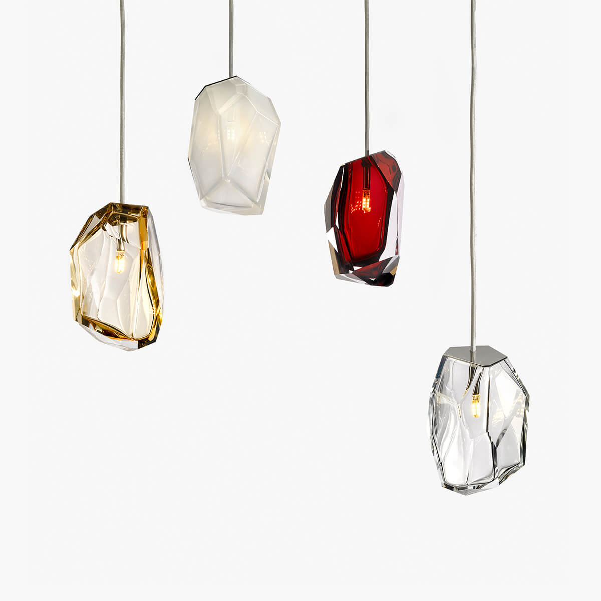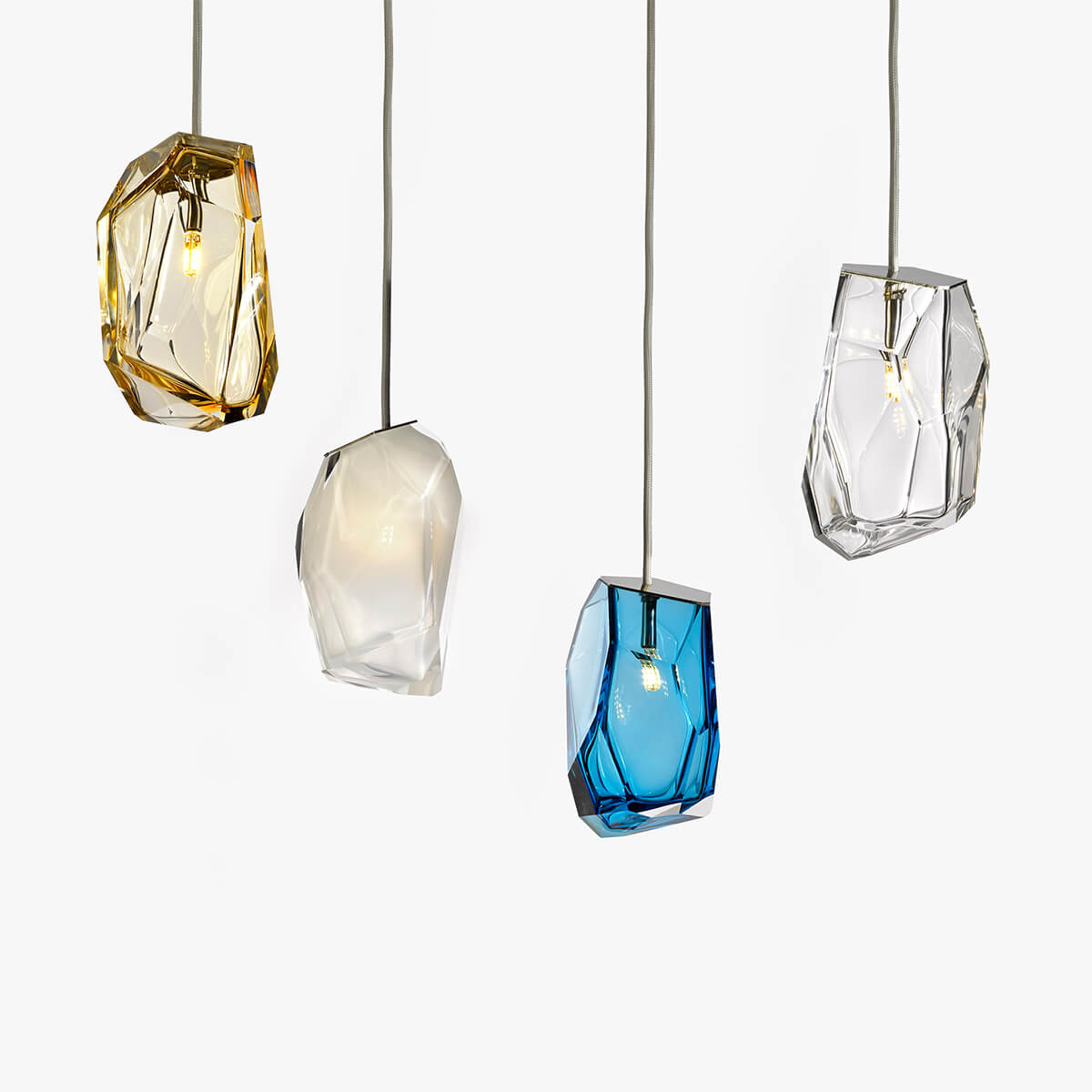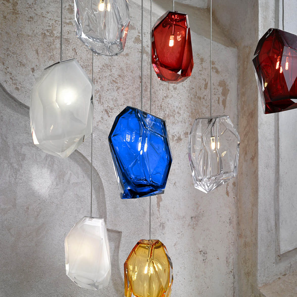 Los cortes exteriores y las superficies interiores curvas de la lámpara de vidrio soplado crean múltiples reflejos y desviaciones durante el día y la noche al encenderse. Se pueden agrupar varias lámparas colgantes para crear un ambiente más dramático y acogedor. Desdibujando los límites entre el diseño y el arte, la lámpara colgante Crystal Rock, con su aspecto de gema, está disponible en ámbar, ópalo, rojo, transparente y azul.