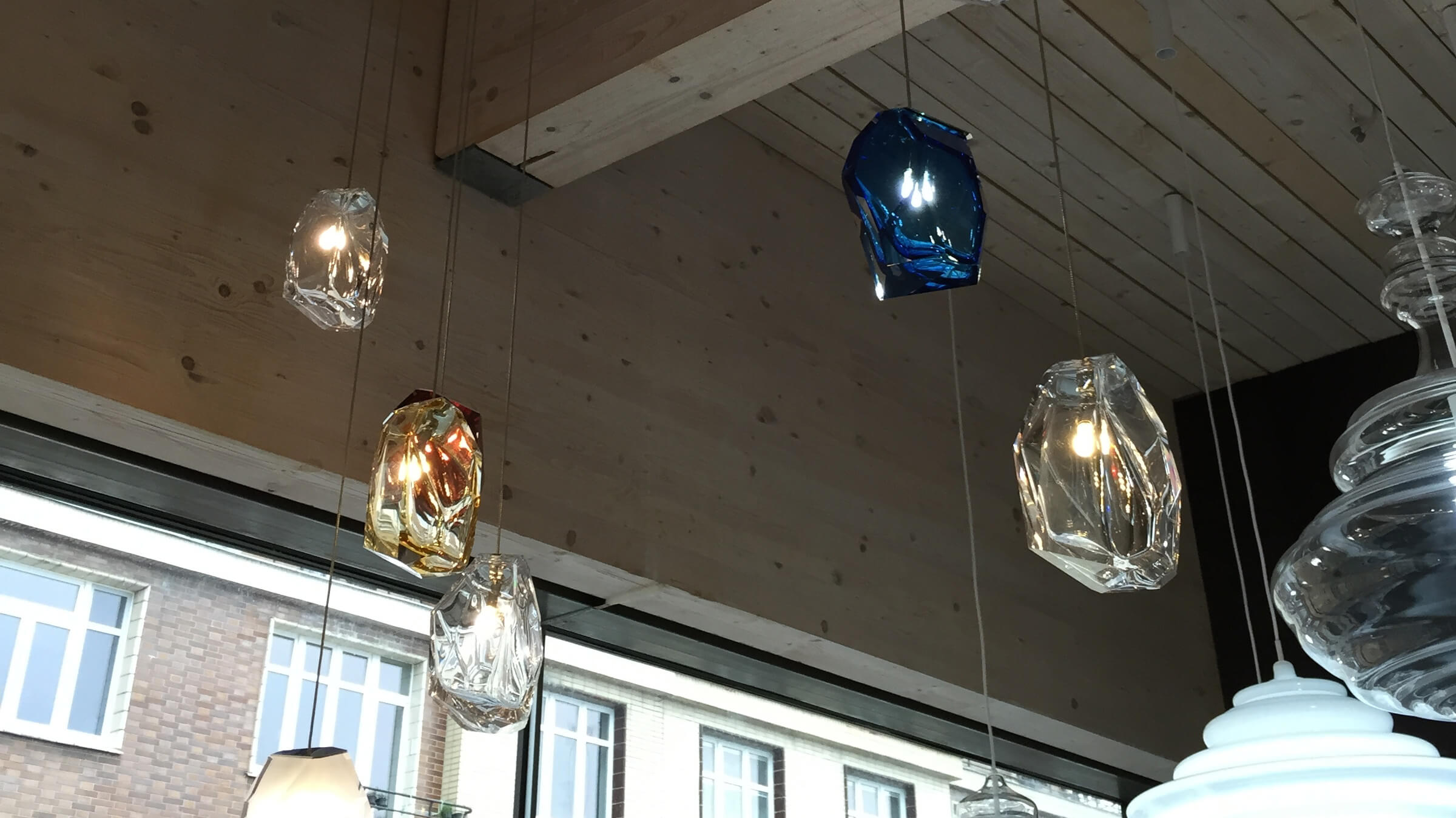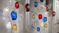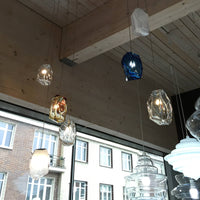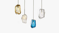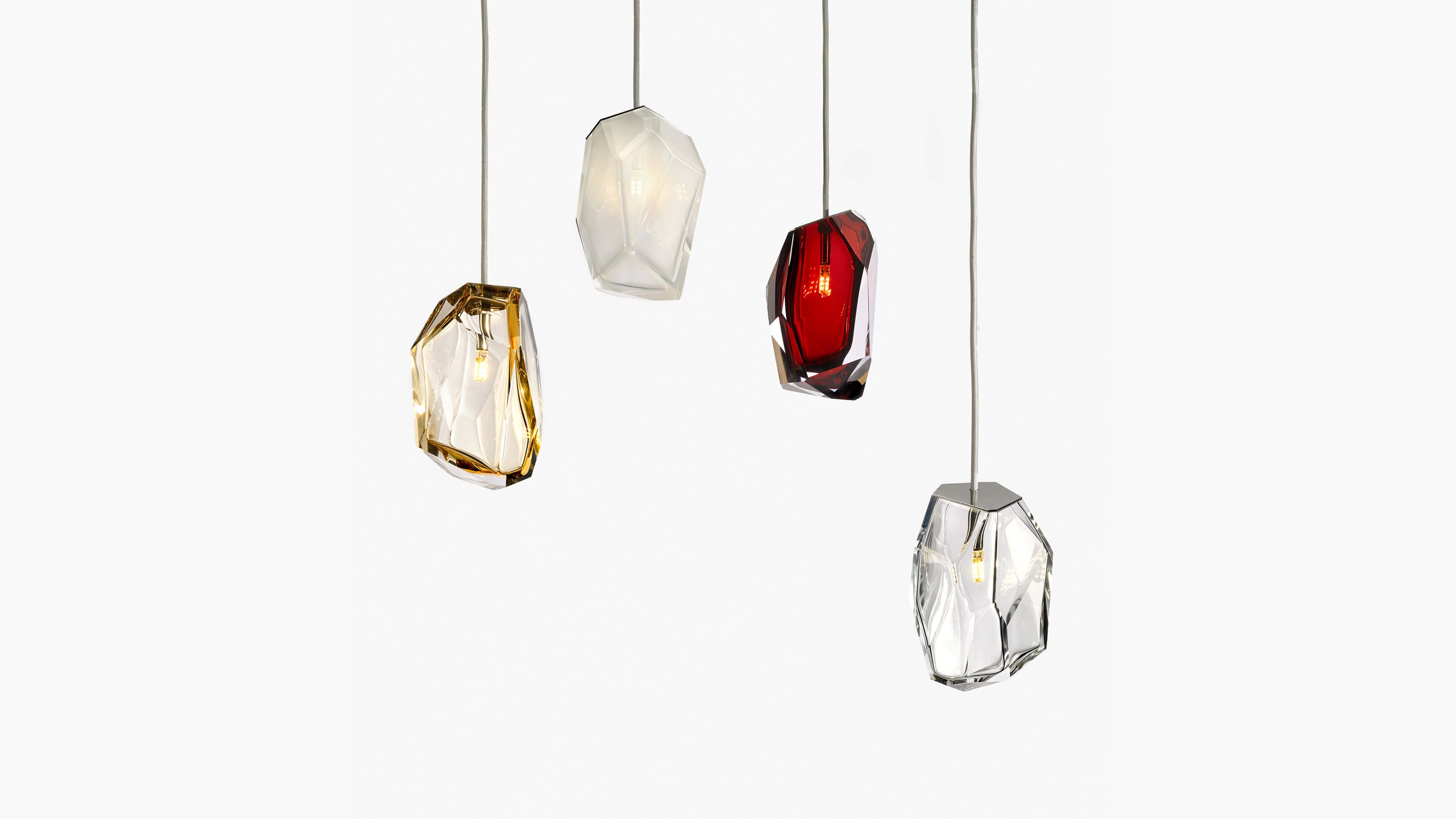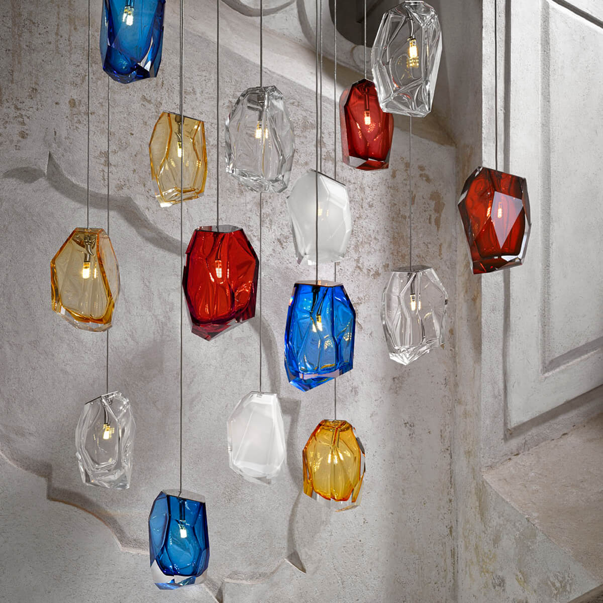 Los cortes exteriores y las superficies interiores curvas de la lámpara de vidrio soplado crean múltiples reflejos y desviaciones durante el día y la noche al encenderse. Se pueden agrupar varias lámparas colgantes para crear un ambiente más dramático y acogedor. Desdibujando los límites entre el diseño y el arte, la lámpara colgante Crystal Rock, con su aspecto de gema, está disponible en ámbar, ópalo, rojo, transparente y azul.