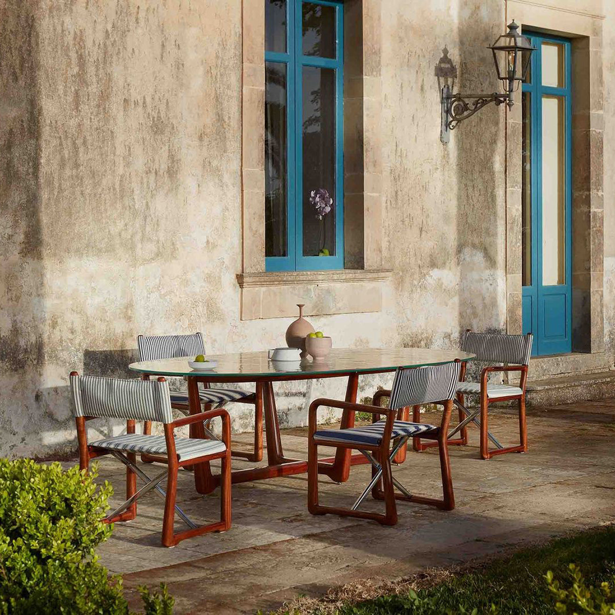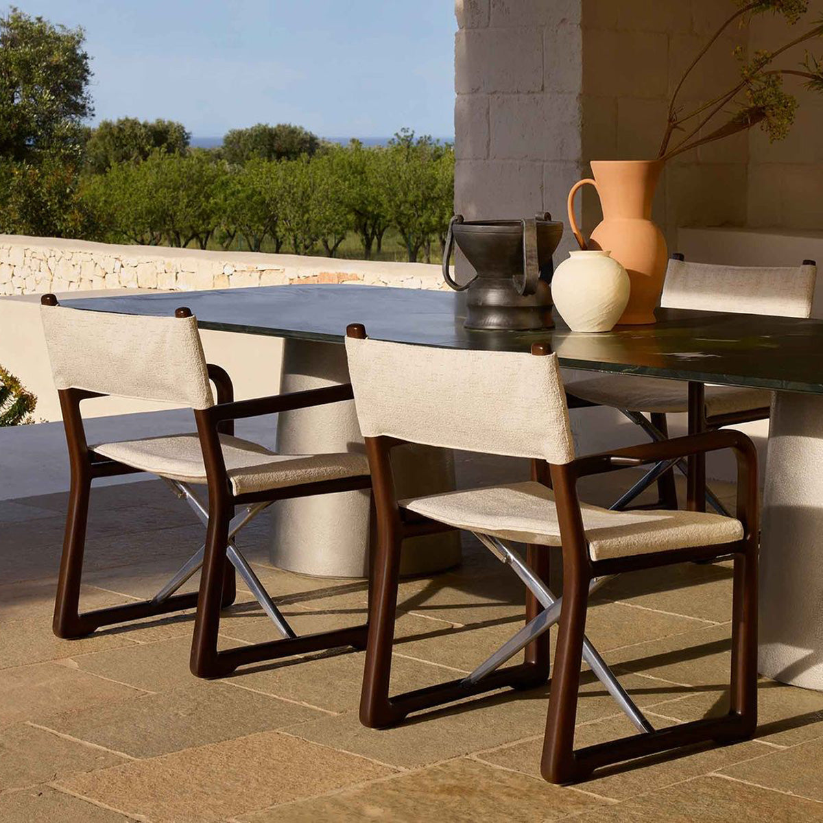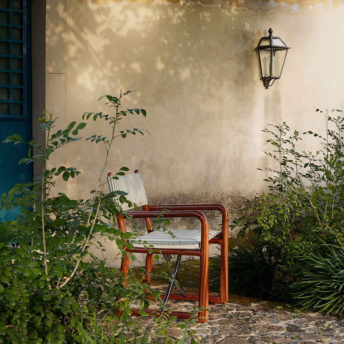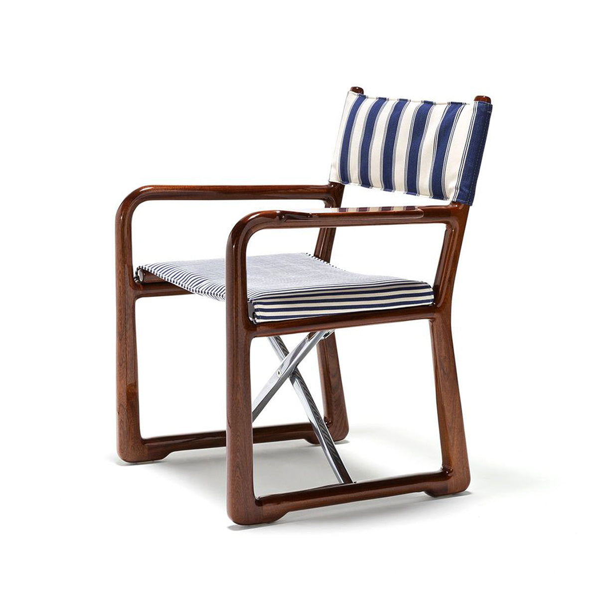 The LPIDC01 Folding Director's Chair, designed by Paola Navone for Exteta with Loro Piana Interiors, reimagines a timeless icon of leisure. Its foldable mahogany frame and Loro Piana fabrics make it as practical as it is refined, perfect for terraces, yachts, or garden settings. This chair travels lightly yet carries a weight of sophistication.