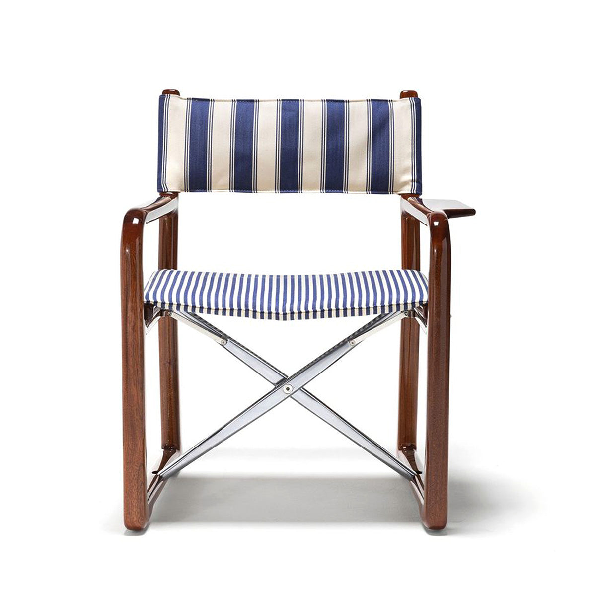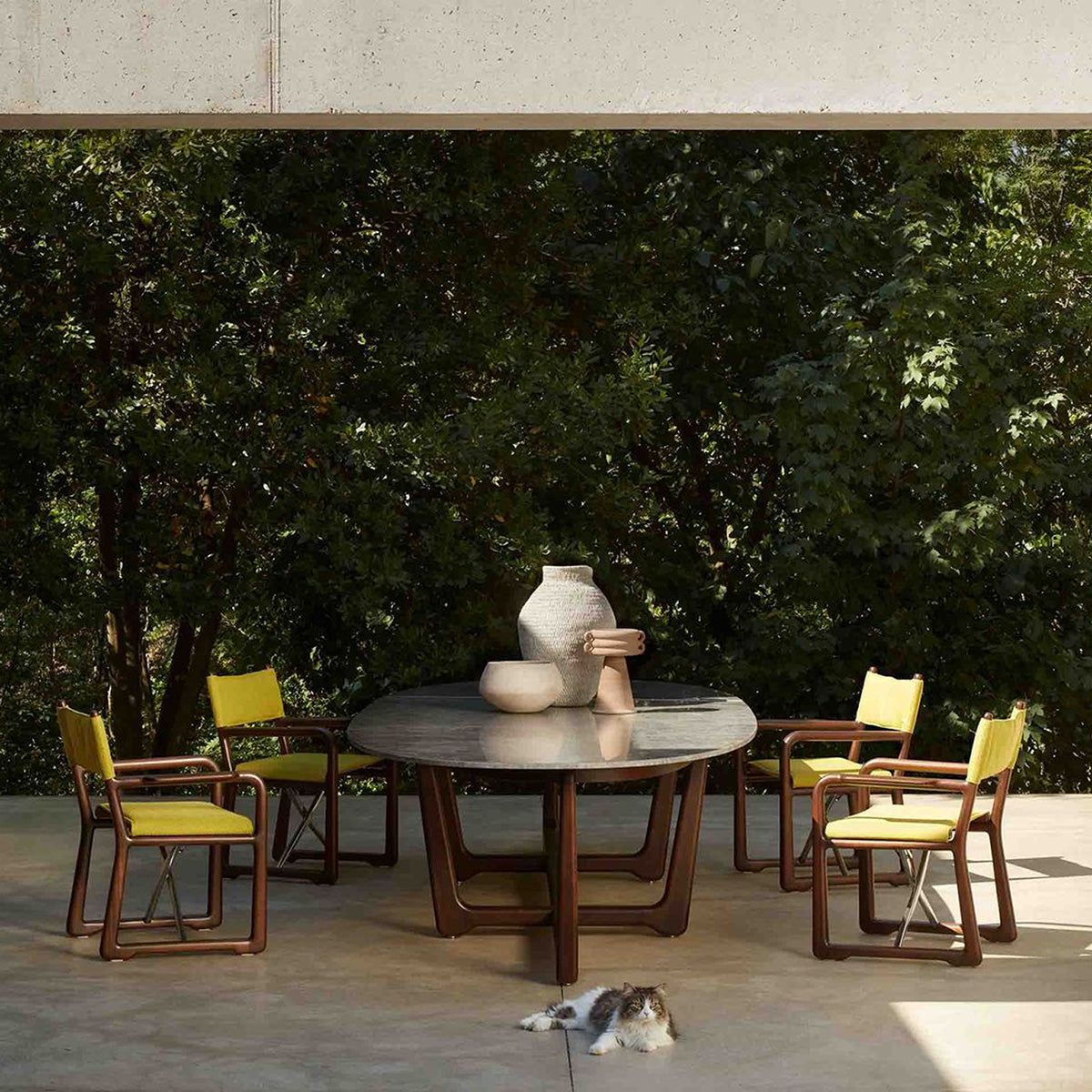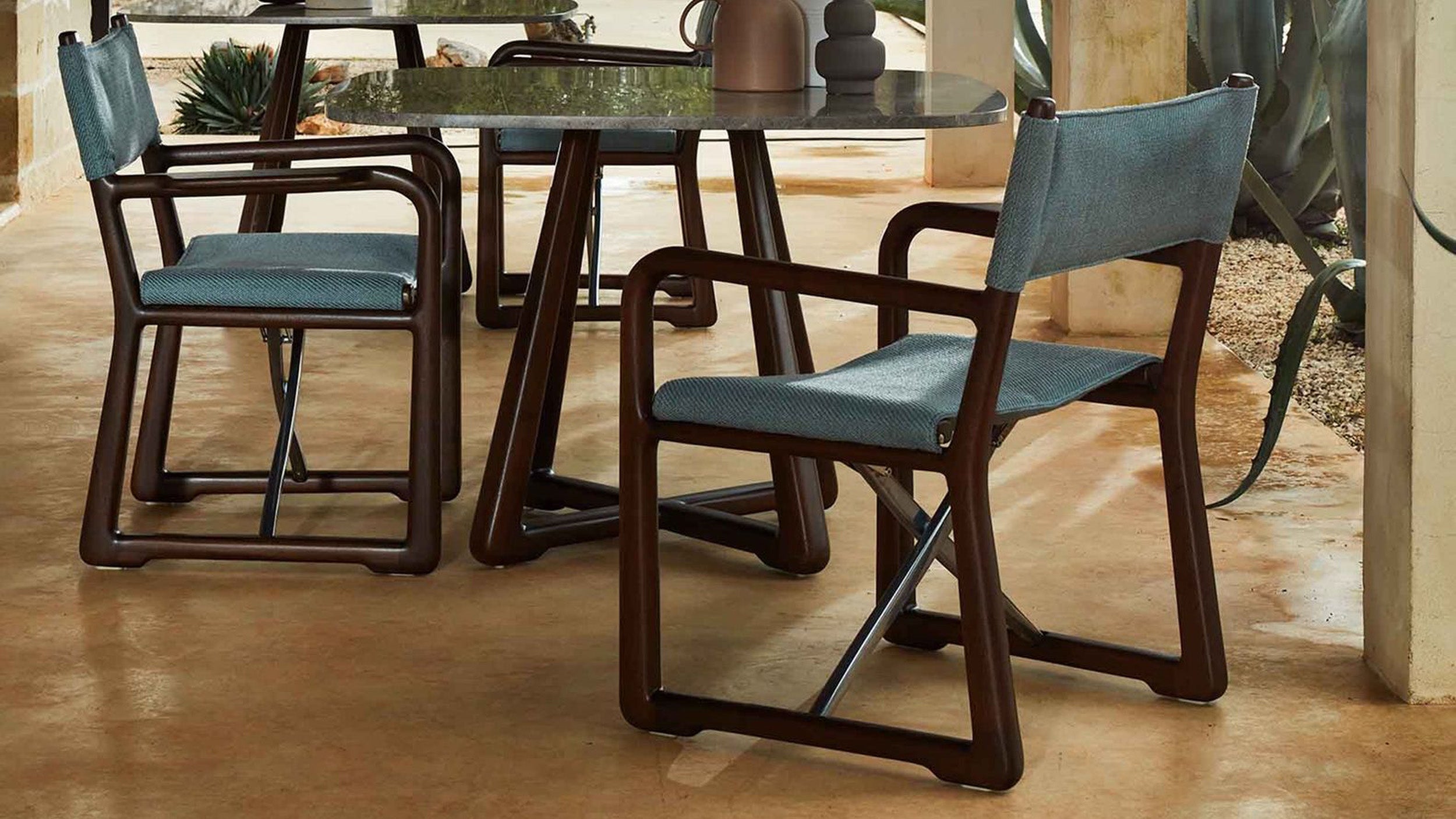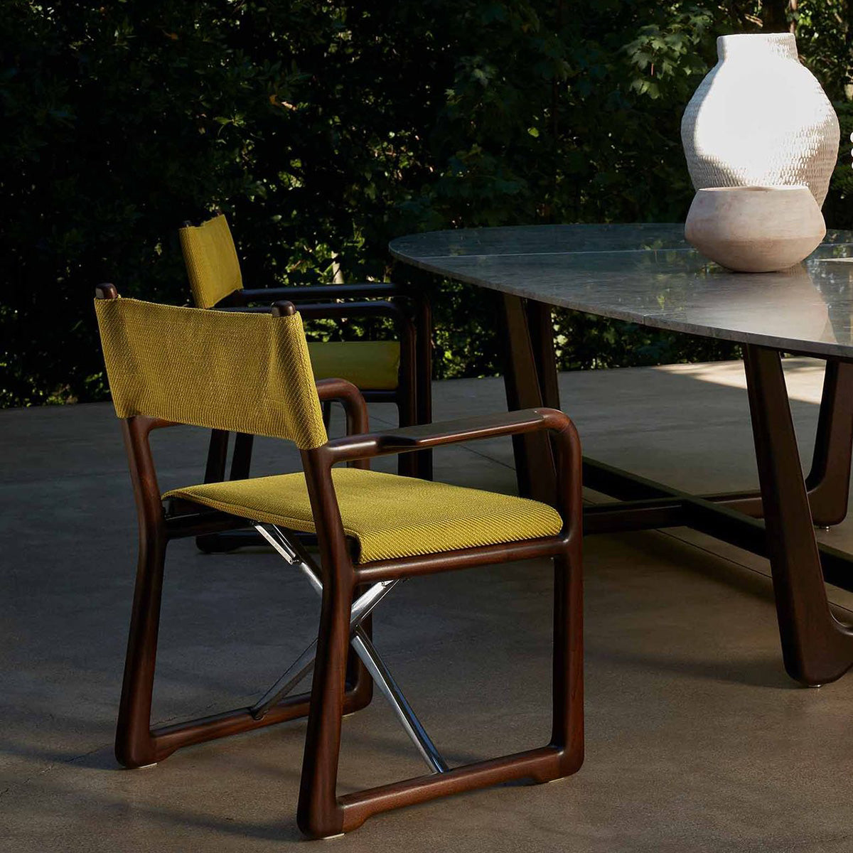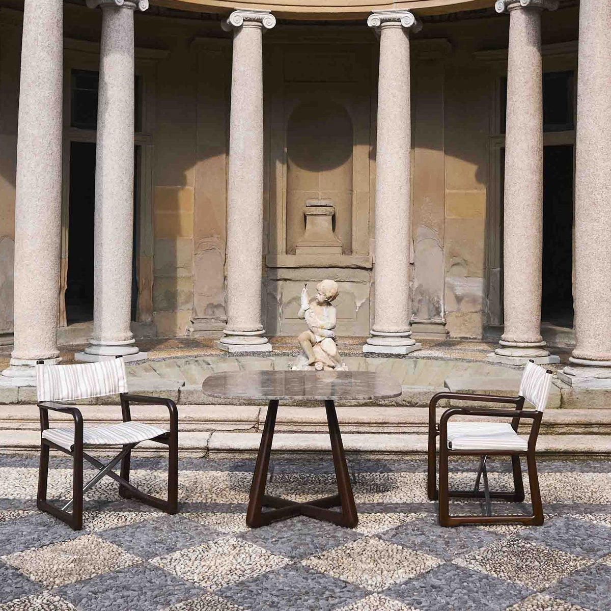 The LPIDC01 Folding Director's Chair, designed by Paola Navone for Exteta with Loro Piana Interiors, reimagines a timeless icon of leisure. Its foldable mahogany frame and Loro Piana fabrics make it as practical as it is refined, perfect for terraces, yachts, or garden settings. This chair travels lightly yet carries a weight of sophistication.