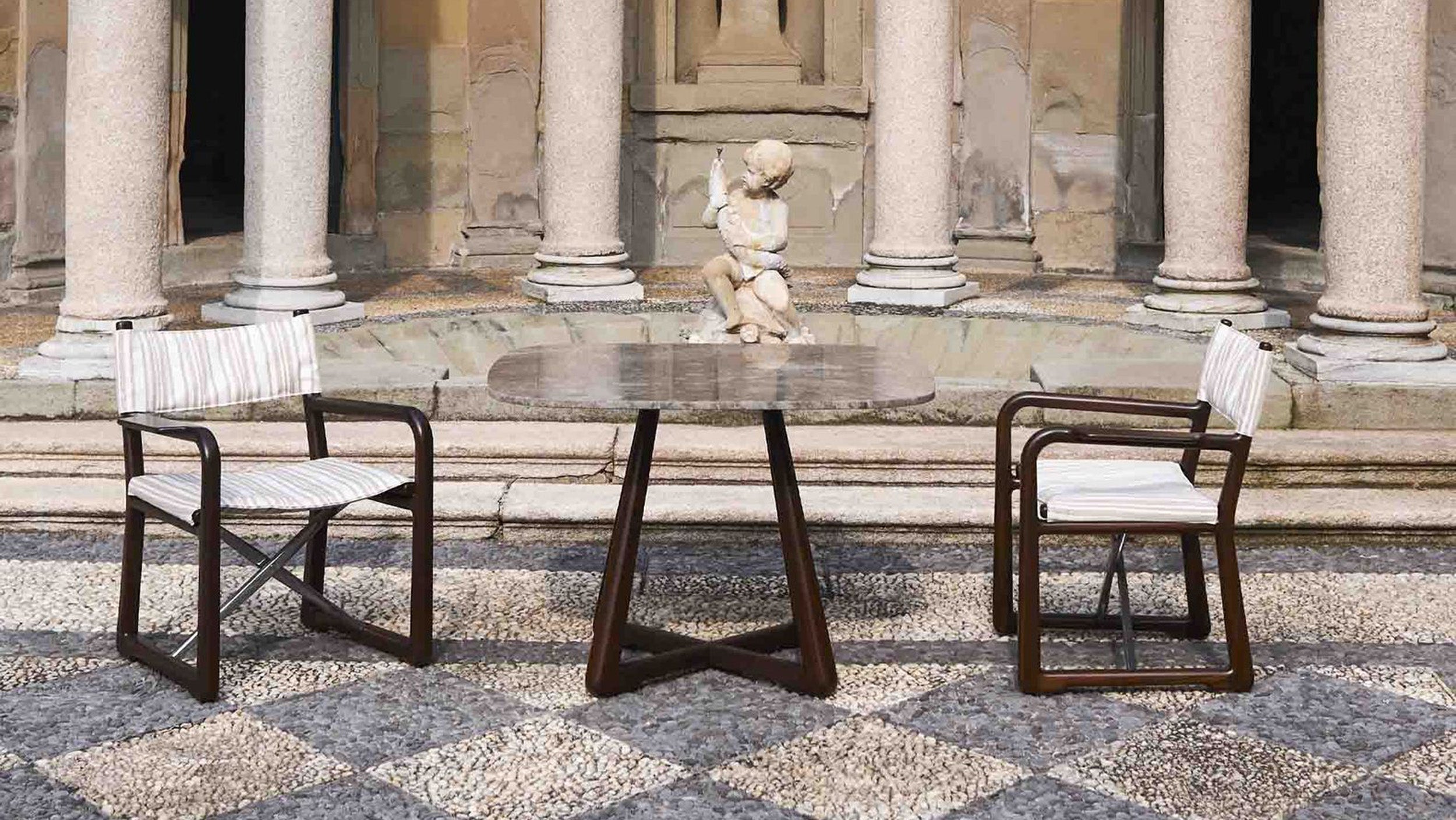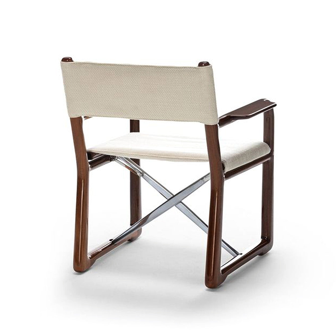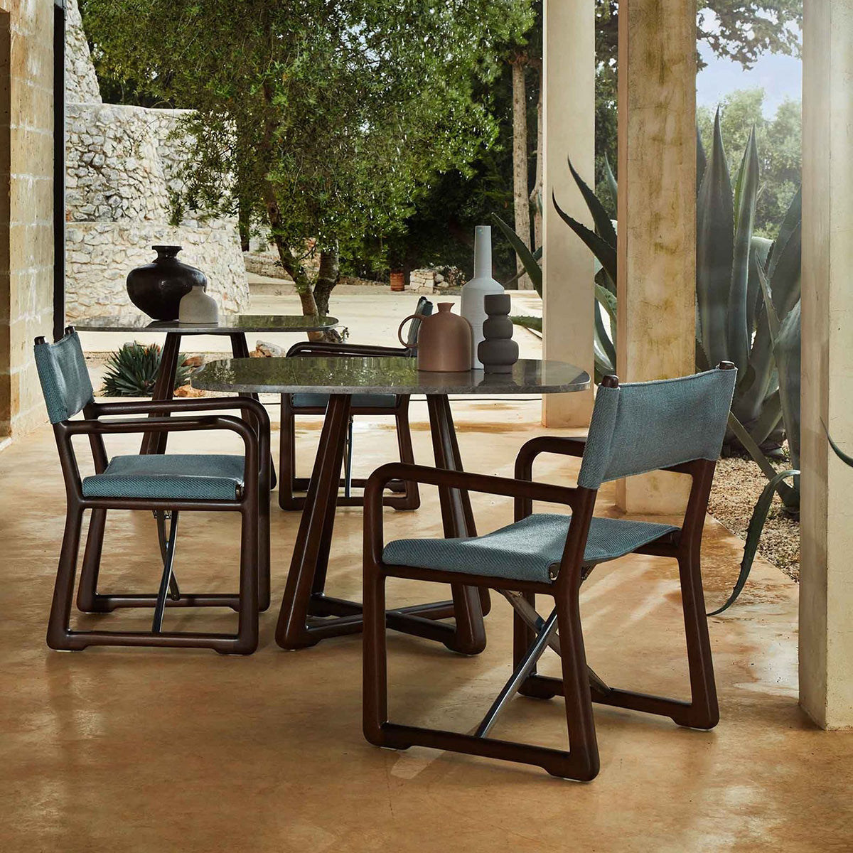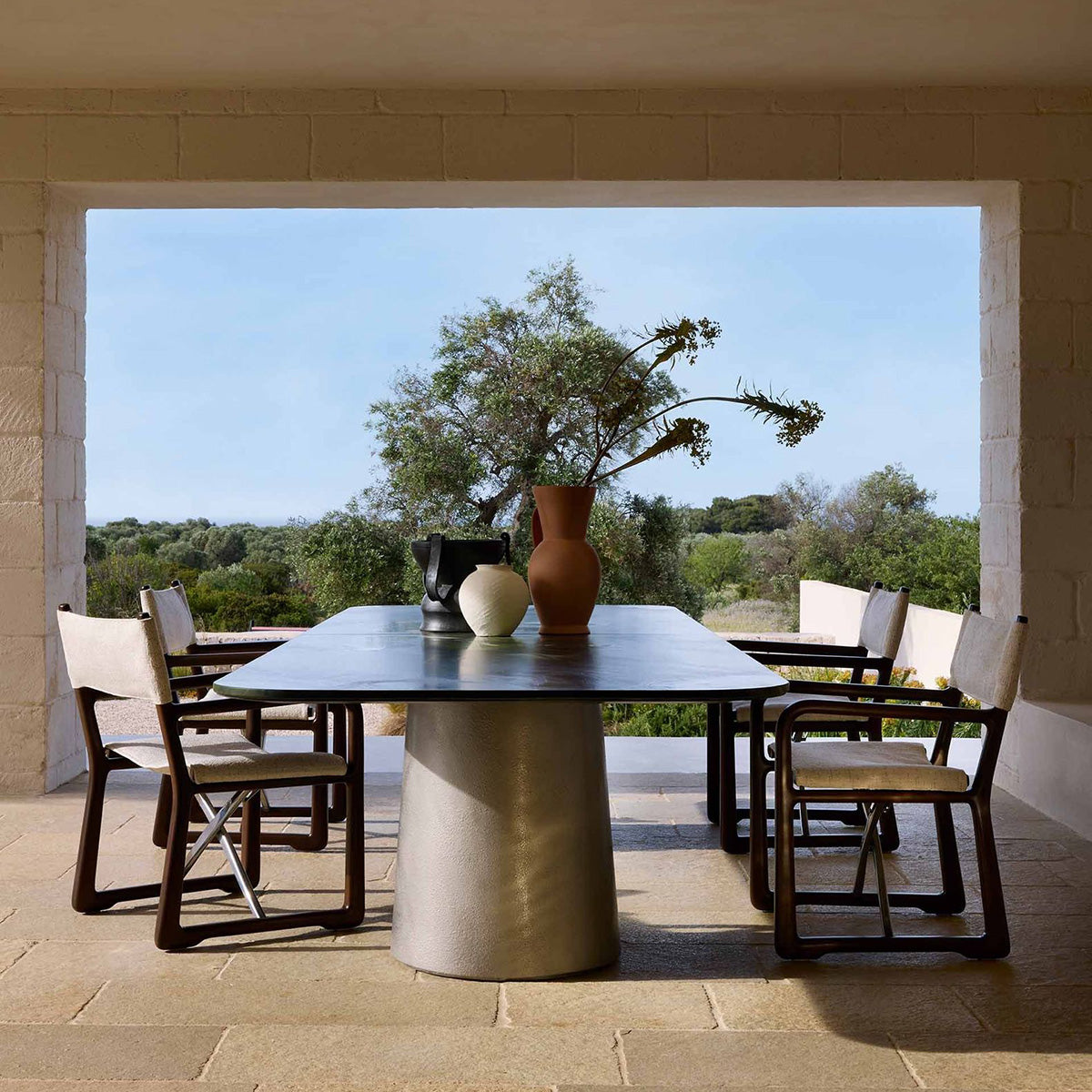 The LPIDC01 Folding Director's Chair, designed by Paola Navone for Exteta with Loro Piana Interiors, reimagines a timeless icon of leisure. Its foldable mahogany frame and Loro Piana fabrics make it as practical as it is refined, perfect for terraces, yachts, or garden settings. This chair travels lightly yet carries a weight of sophistication.