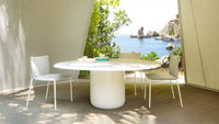 The Mae Outdoor Dining Chair, designed by Gabriele and Oscar Buratti for Paola Lenti, blends elegance and comfort for any outdoor setting. Crafted with a matt varnished AISI 304 stainless steel frame in avorio or grafite, it features durable plastic spacers. The removable seat pad, made of polyester fiber with a stress-resistant polyurethane core and waterproof polyester cover, offers upholstery options in Rope T, Brio, Thea, or Wara fabrics. Available in two pad styles, simple seating area or full steel frame coverage secured by discreet zippers. This chair is also suitable for indoor use. Using the Winter Set protection cover is advised for lasting care.