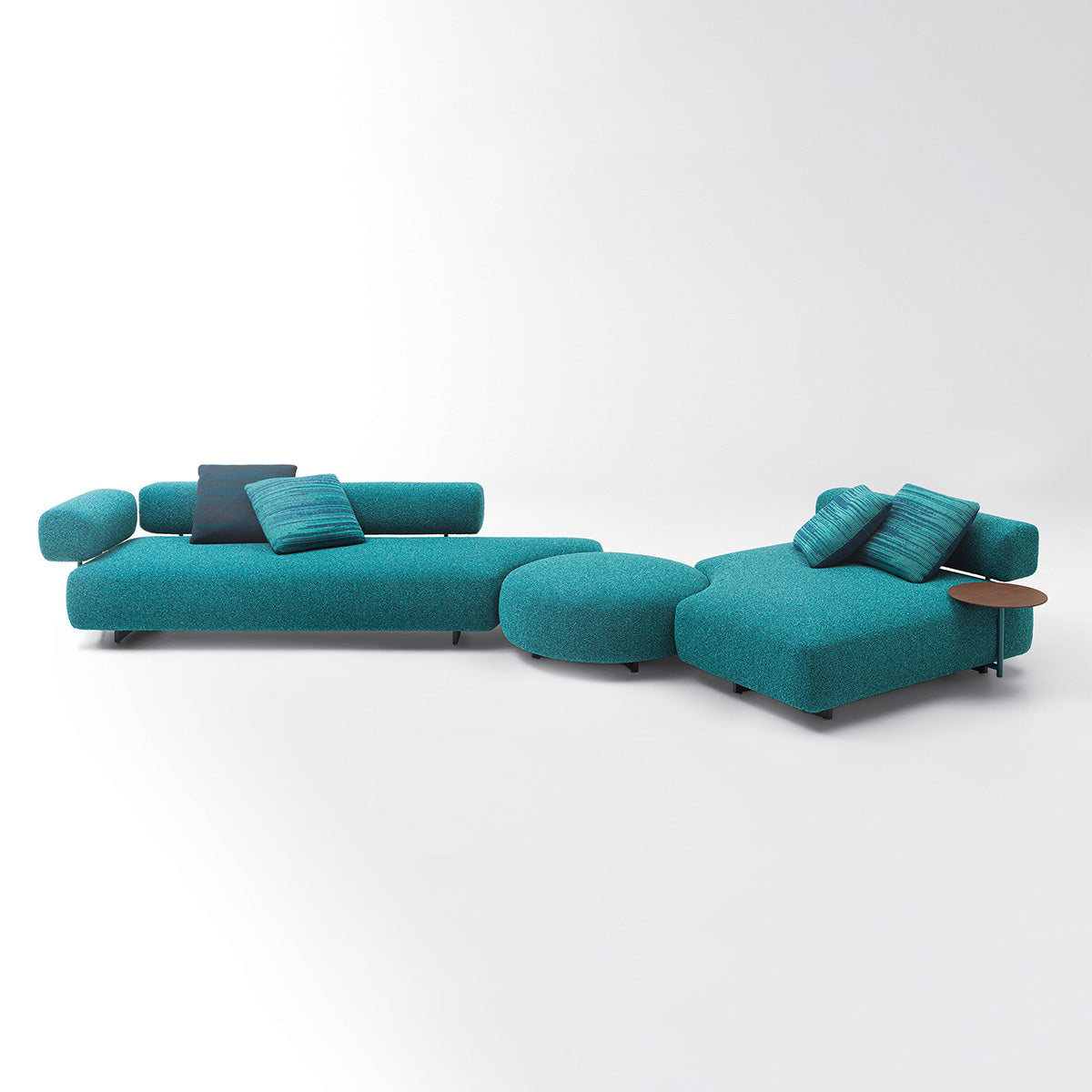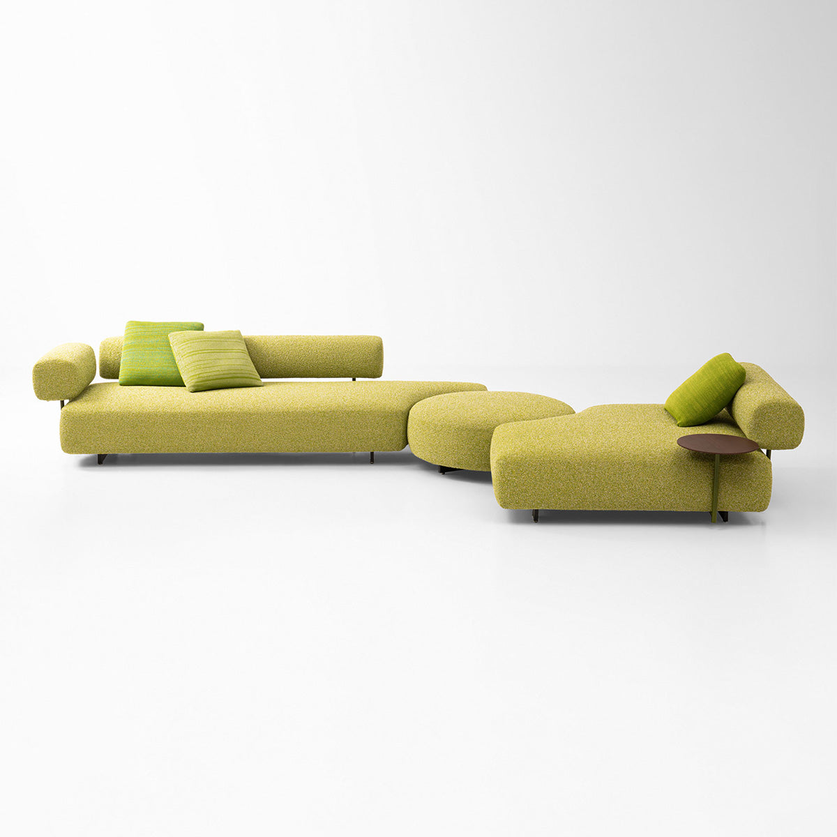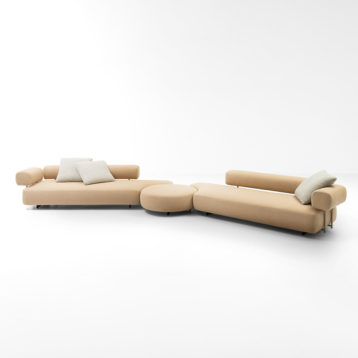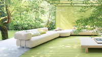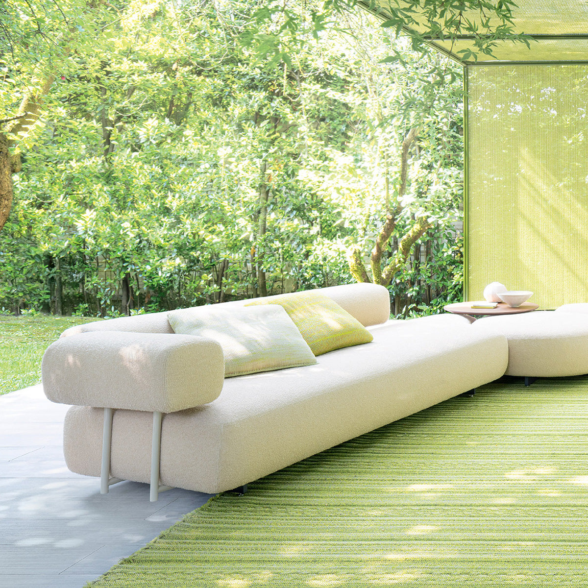 The Santorini Outdoor Sofa, designed by Francesco Rota for Paola Lenti, features a series of modular elements available as two- or three-seaters, along with a shaped platform and pouf. These components combine flexibly to form dynamic arrangements with varying angles, easily adapted to your space. The unshaped seating unit B236E can be enhanced with backrests, armrests, and side tables to create either a three-seater sofa or an expansive chaise longue. Crafted with cataphoresis-treated steel structure and stainless steel sled bases in refined avorio or grafite finishes, it offers durable comfort with biodegradable, waterproof upholstery options. Suitable for both outdoor and indoor settings.