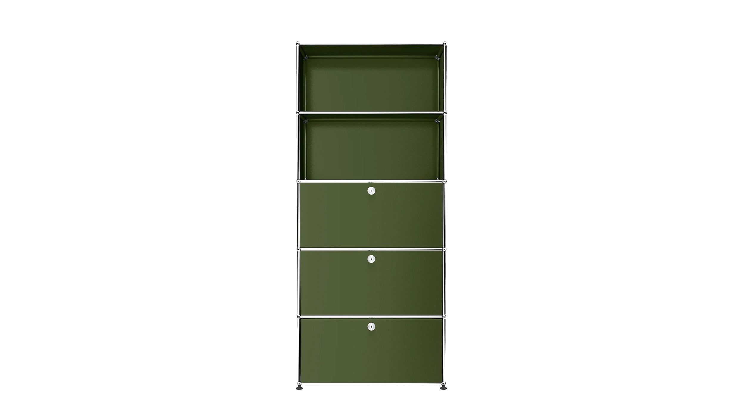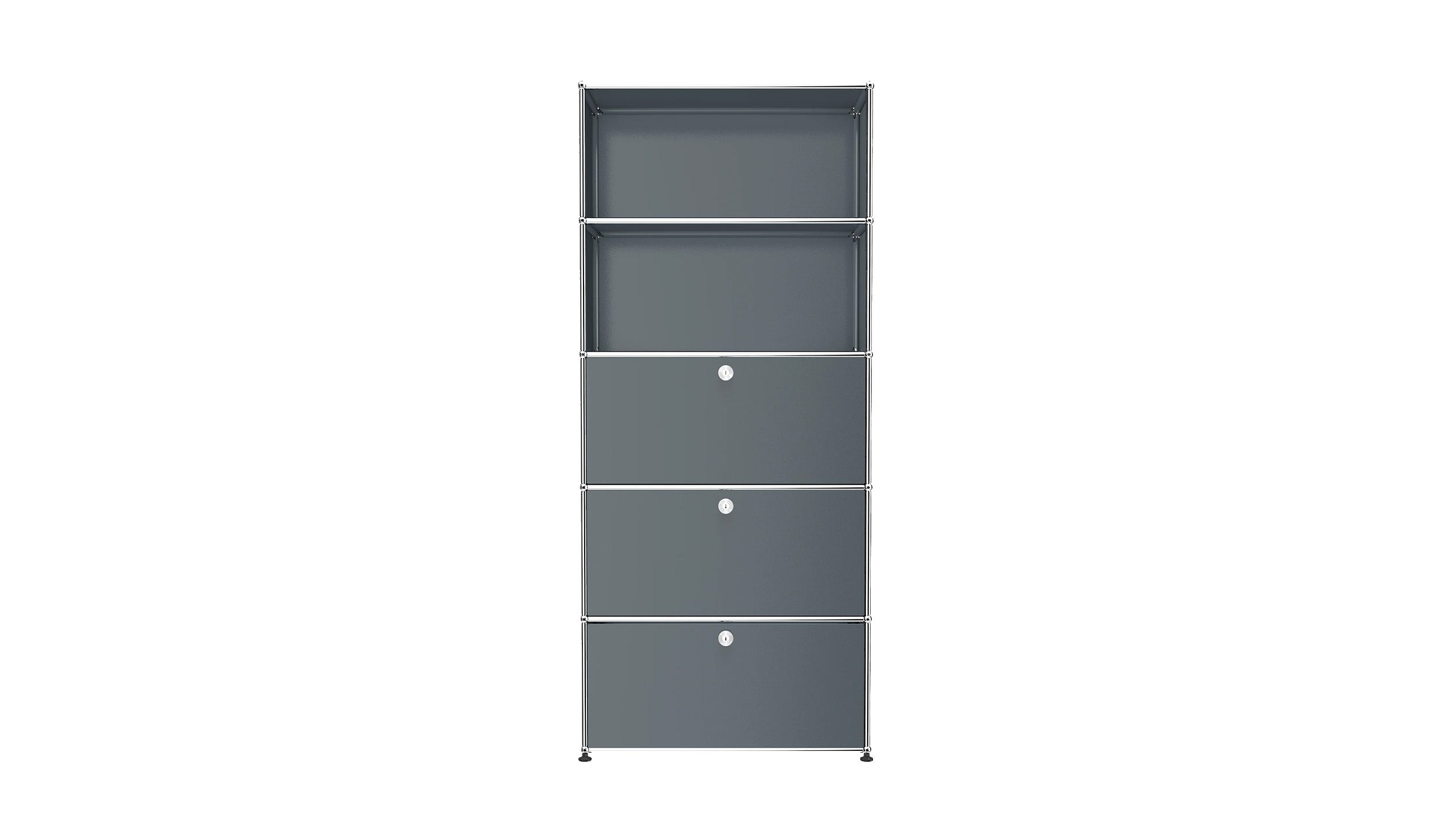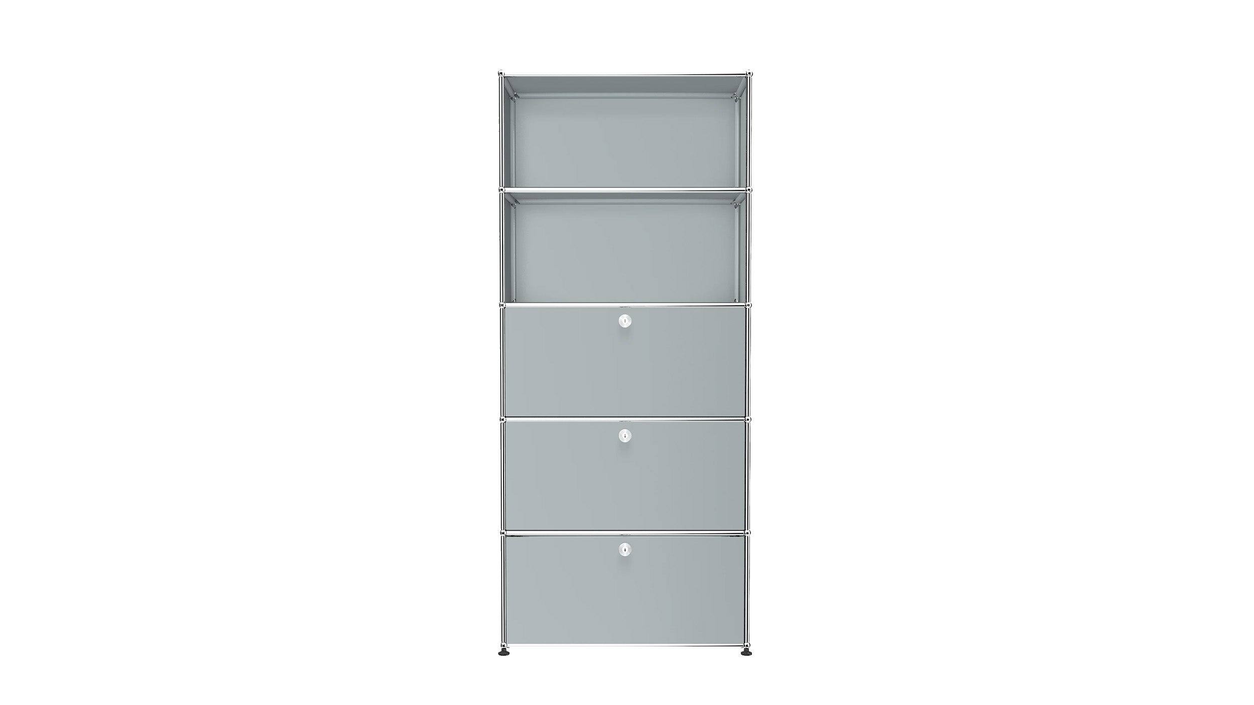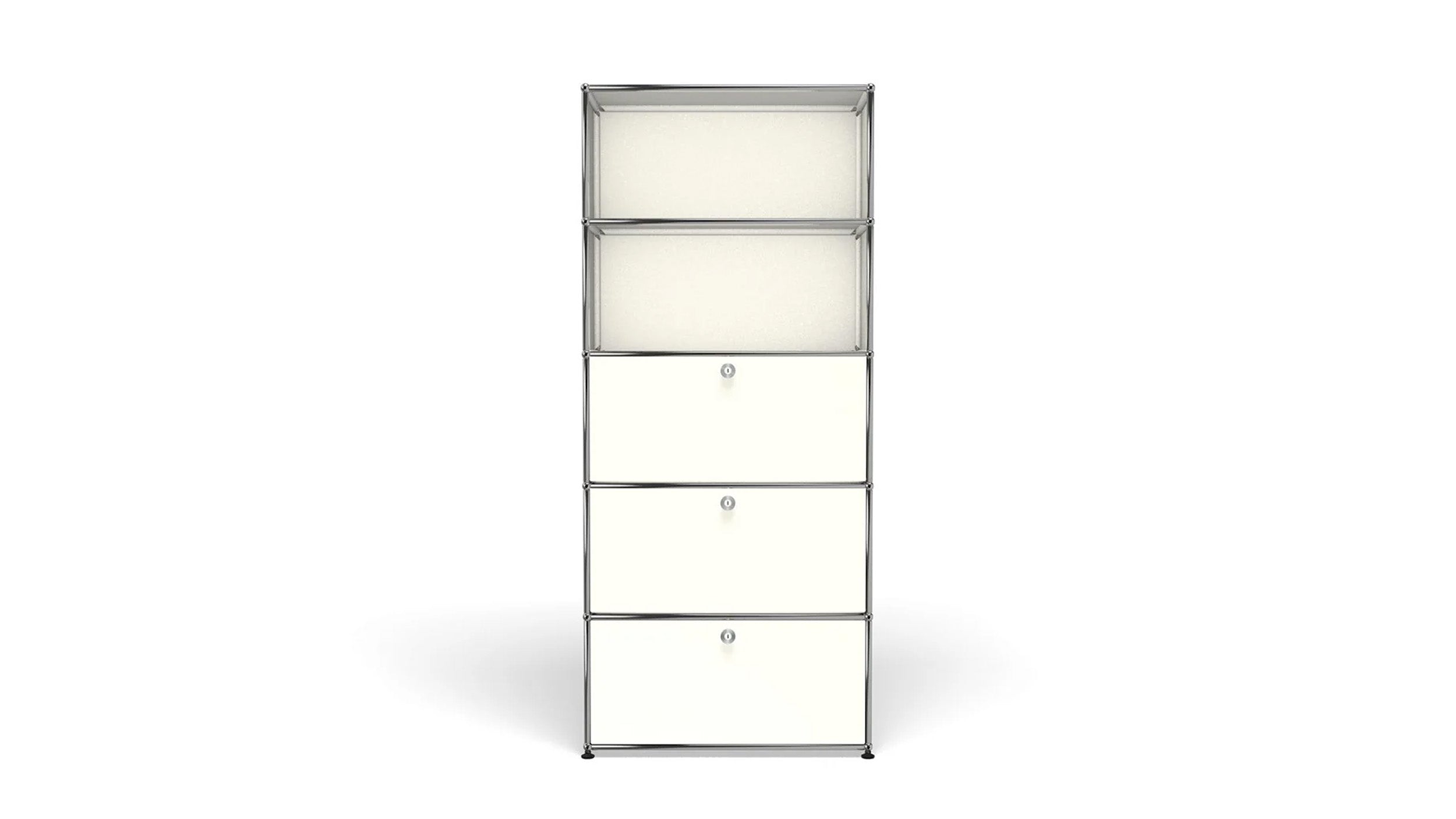 Shelving (Q118) is a versatile storage unit designed to support both organization and light workspace use. Two drop-down doors and a lower drawer provide concealed storage, while the cable cutout in the top compartment allows for a compact workstation or media setup. Available in 7 standard surface colors, it adapts easily to changing storage and workflow needs.