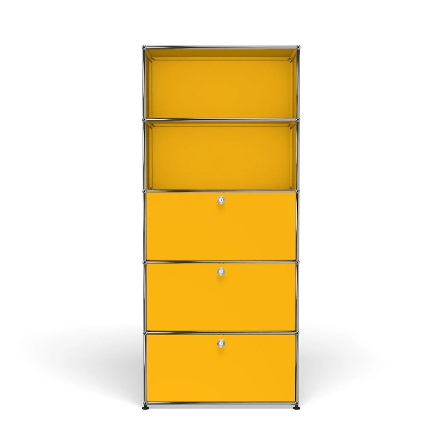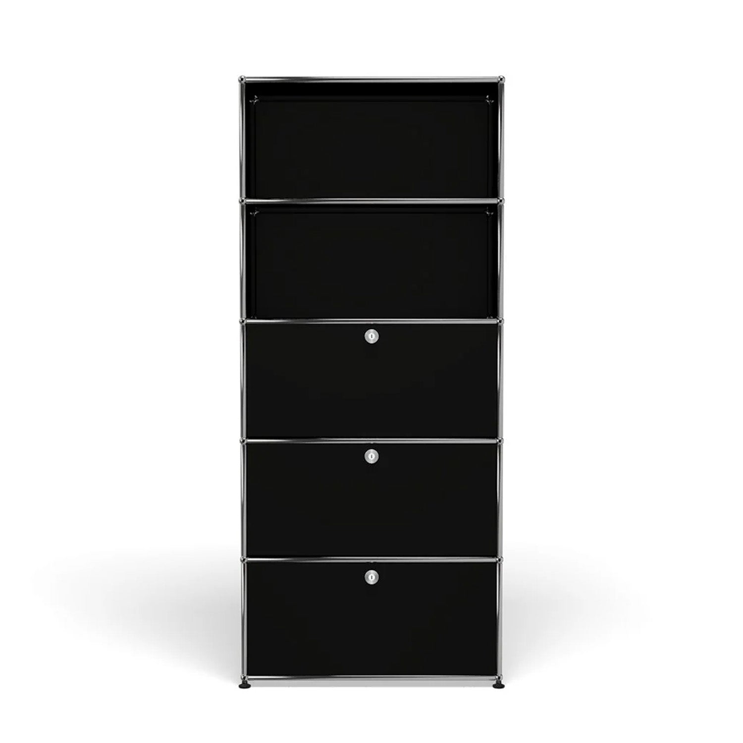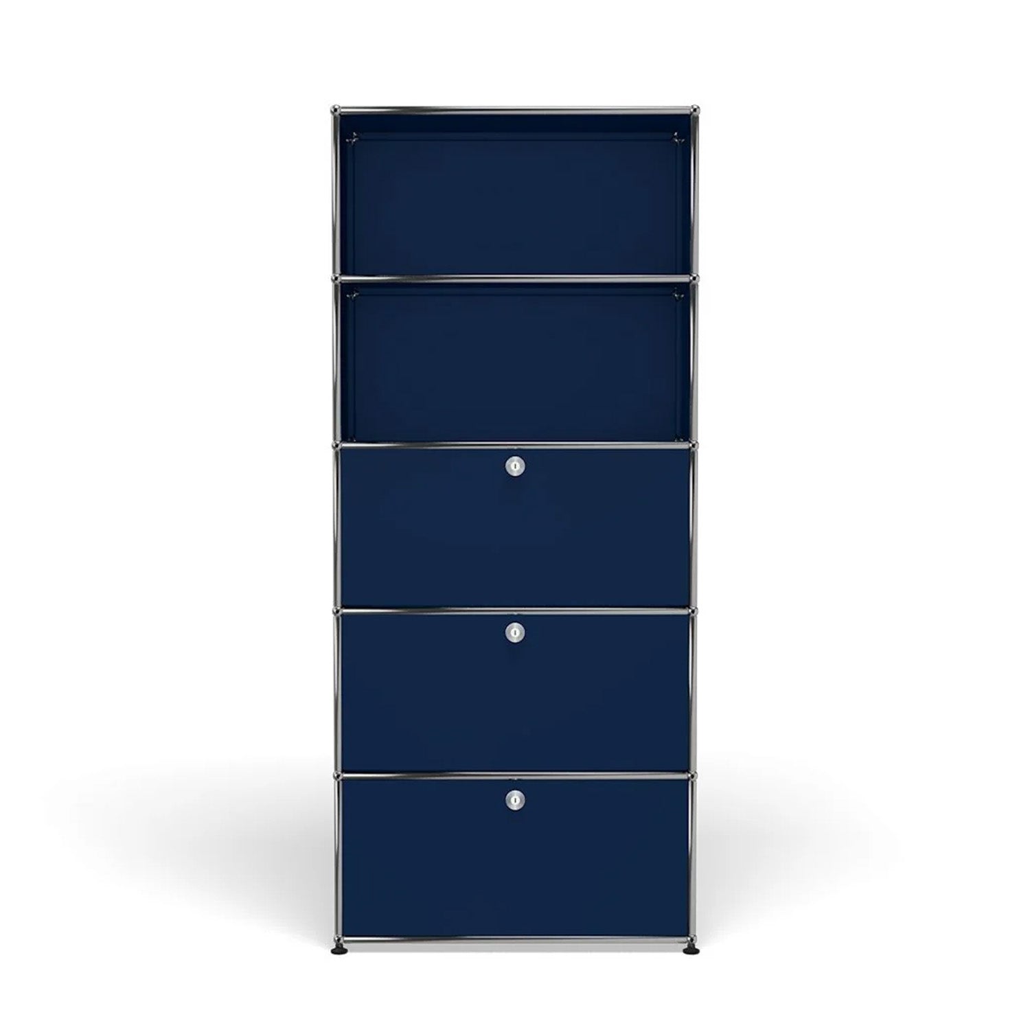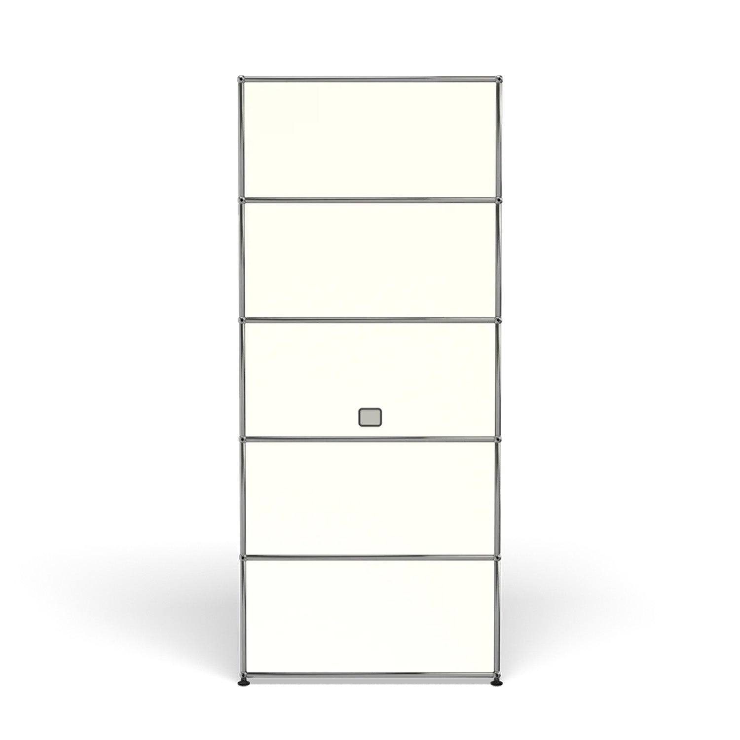 Shelving (Q118) is a versatile storage unit designed to support both organization and light workspace use. Two drop-down doors and a lower drawer provide concealed storage, while the cable cutout in the top compartment allows for a compact workstation or media setup. Available in 7 standard surface colors, it adapts easily to changing storage and workflow needs.