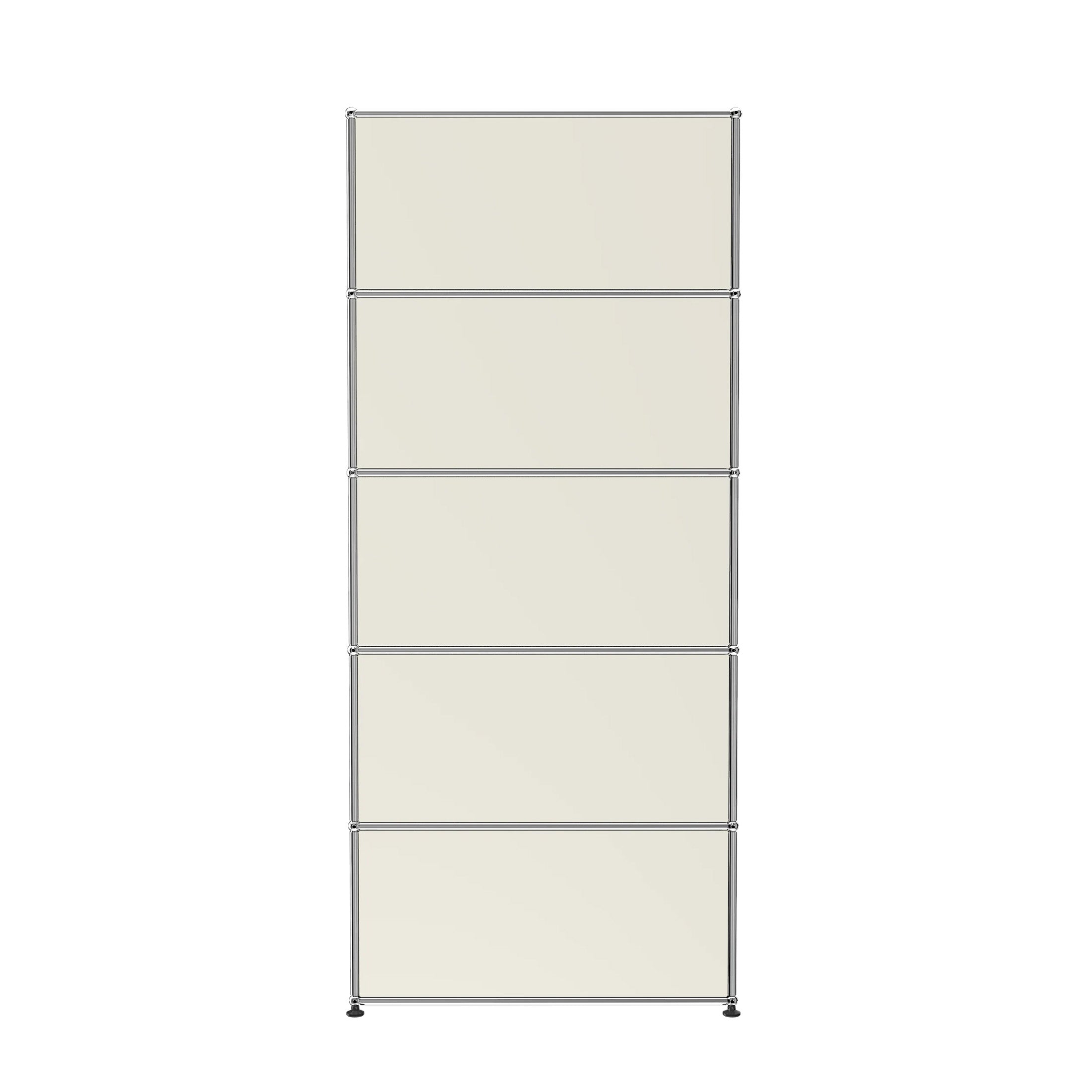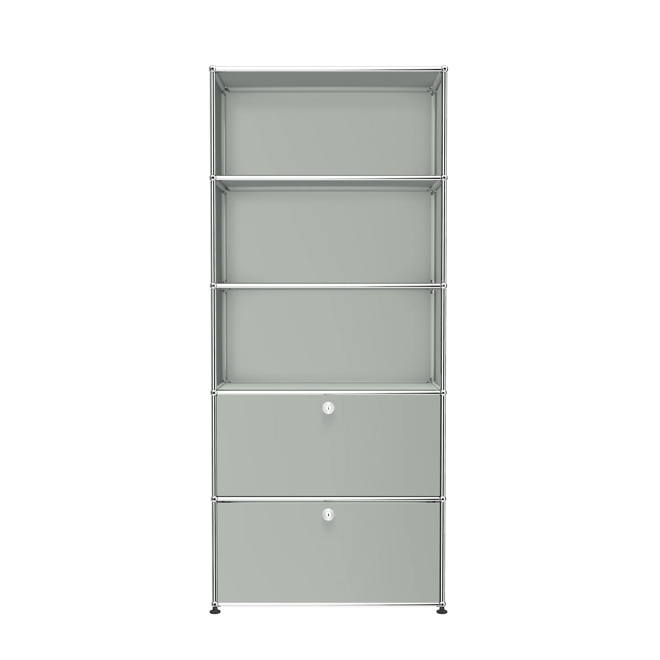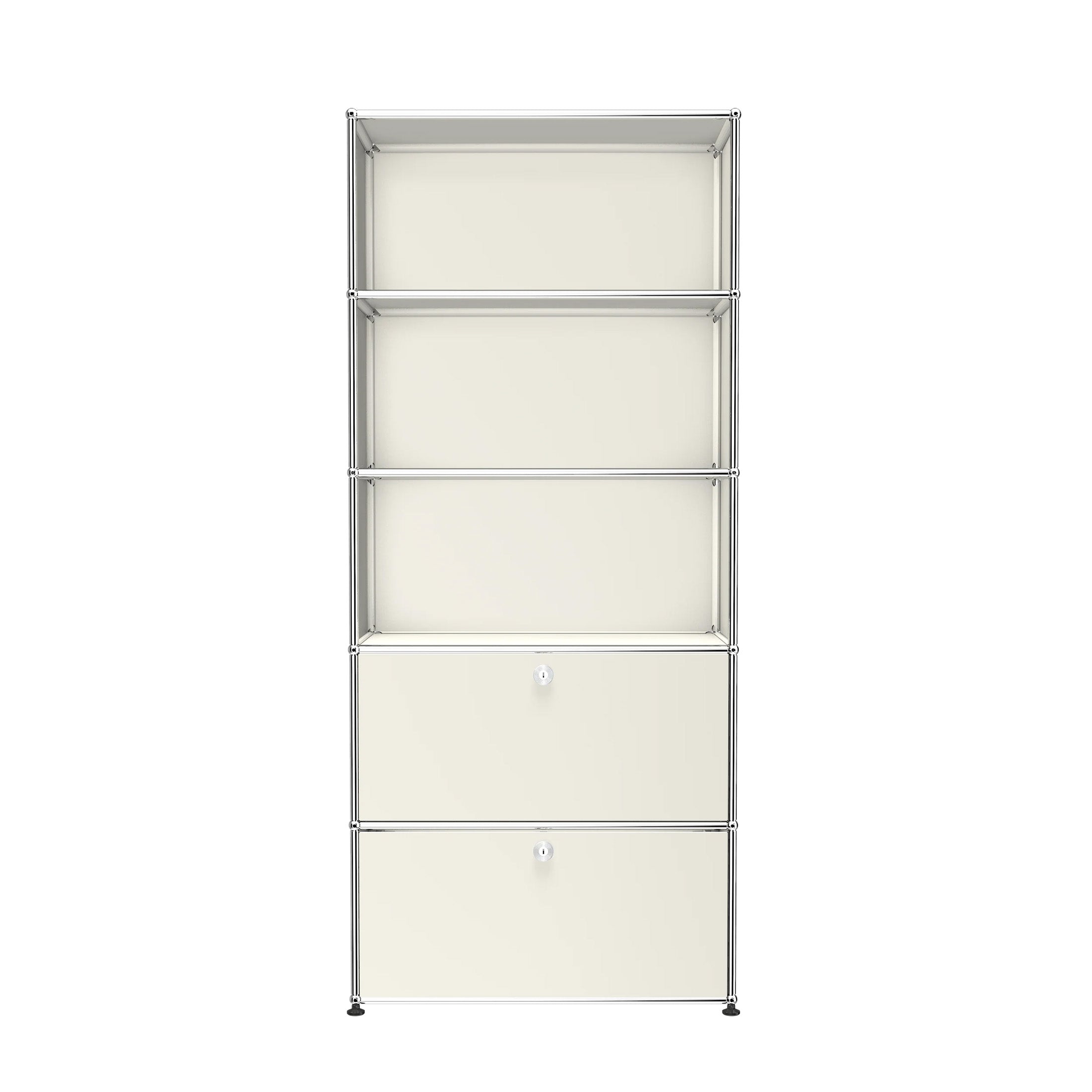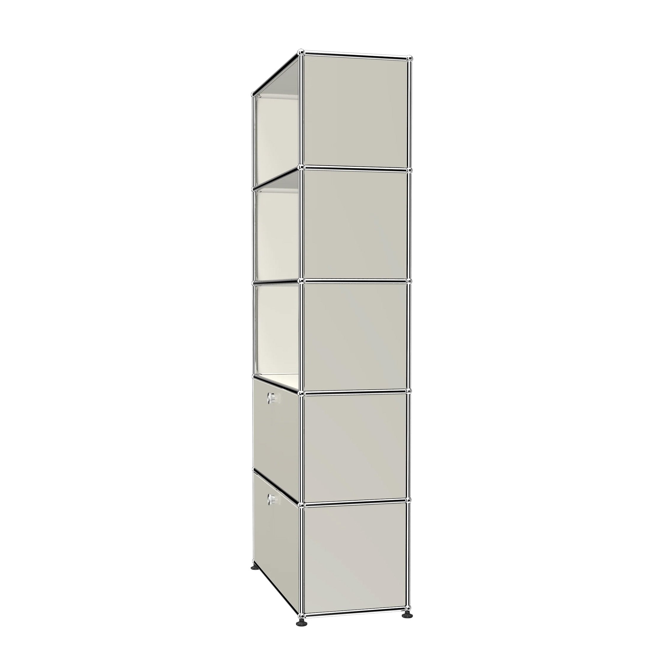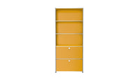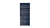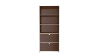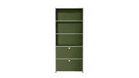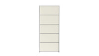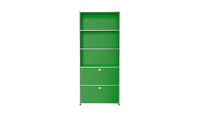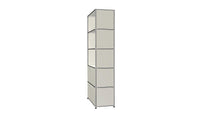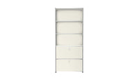 Shelving (R1) combines open display with concealed storage in a compact vertical format. A 14-inch upper drop-down door and a 14-inch lower drawer add practical function to its light, balanced composition. Available in 7 standard surface colors, it can be tailored to different spaces while maintaining a clean architectural profile.