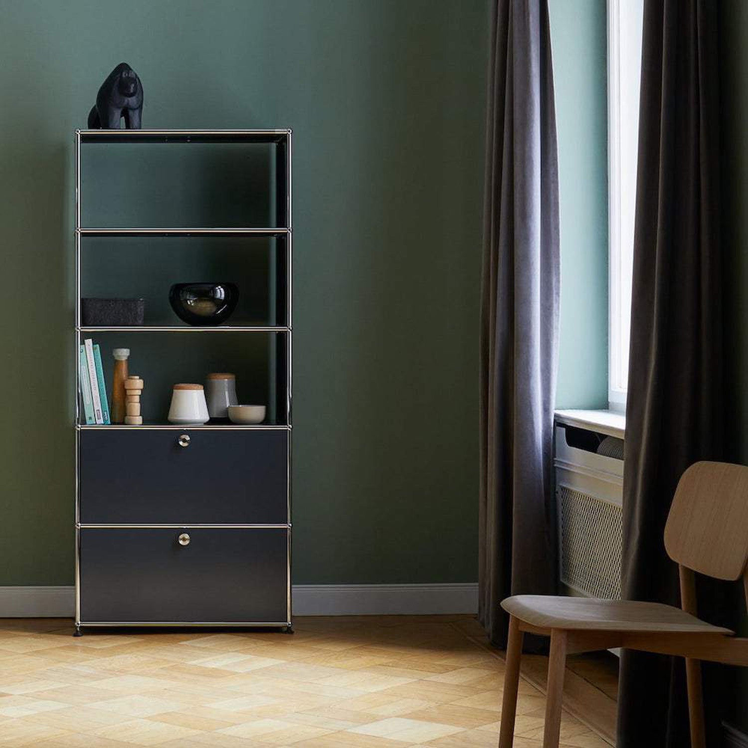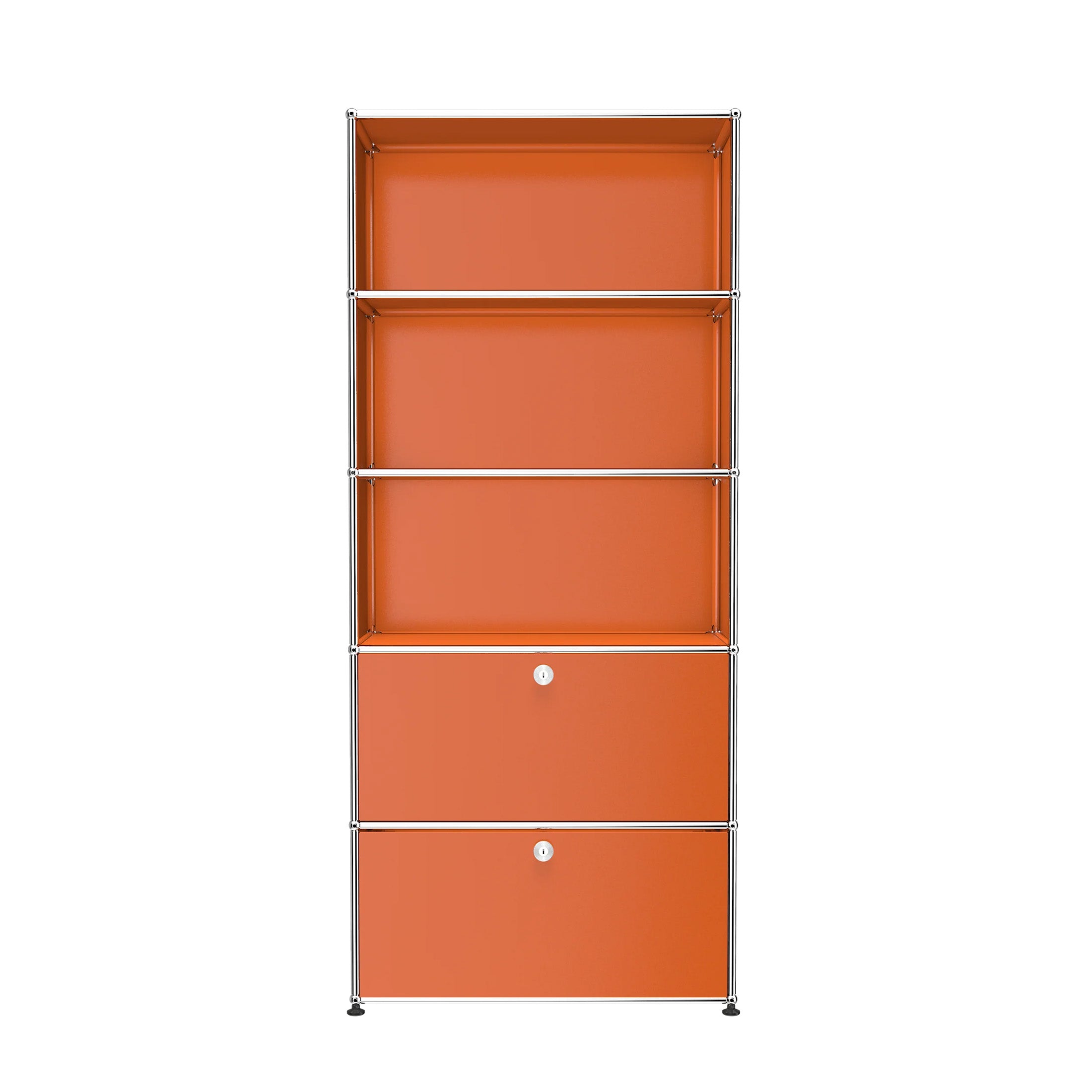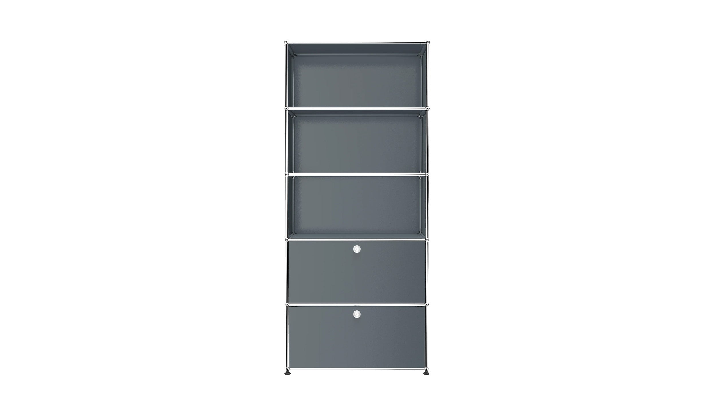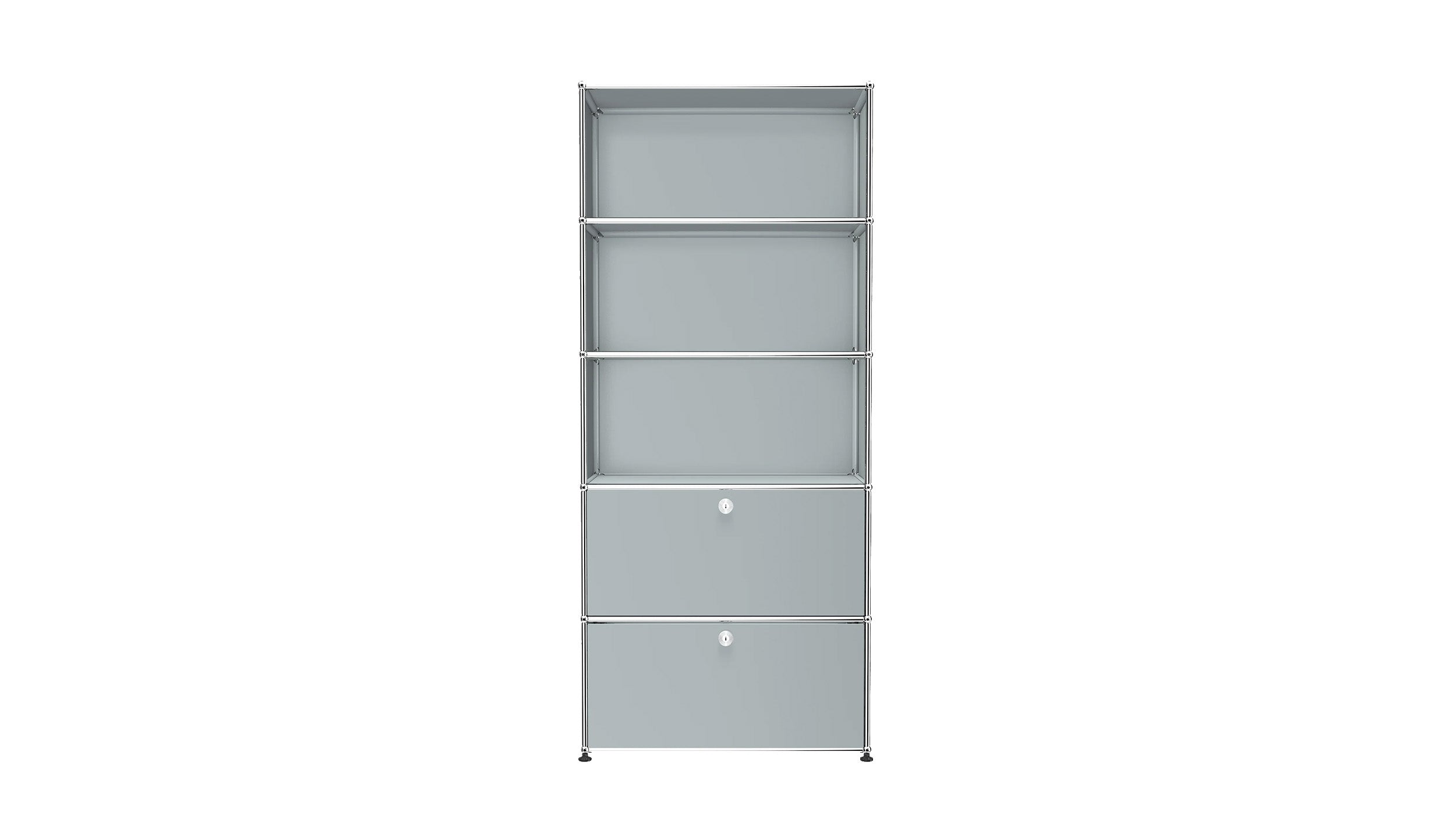 Shelving (R1) combines open display with concealed storage in a compact vertical format. A 14-inch upper drop-down door and a 14-inch lower drawer add practical function to its light, balanced composition. Available in 7 standard surface colors, it can be tailored to different spaces while maintaining a clean architectural profile.