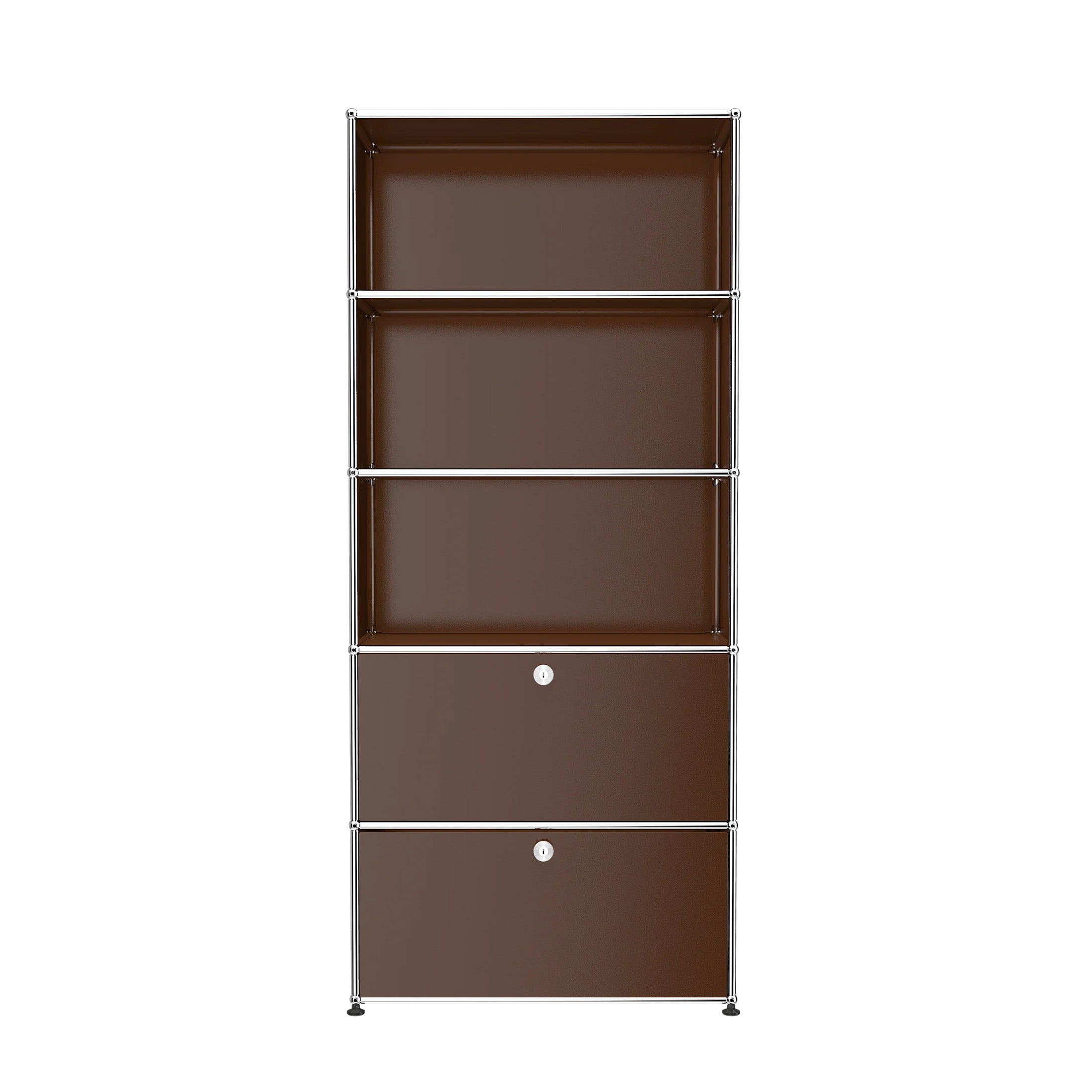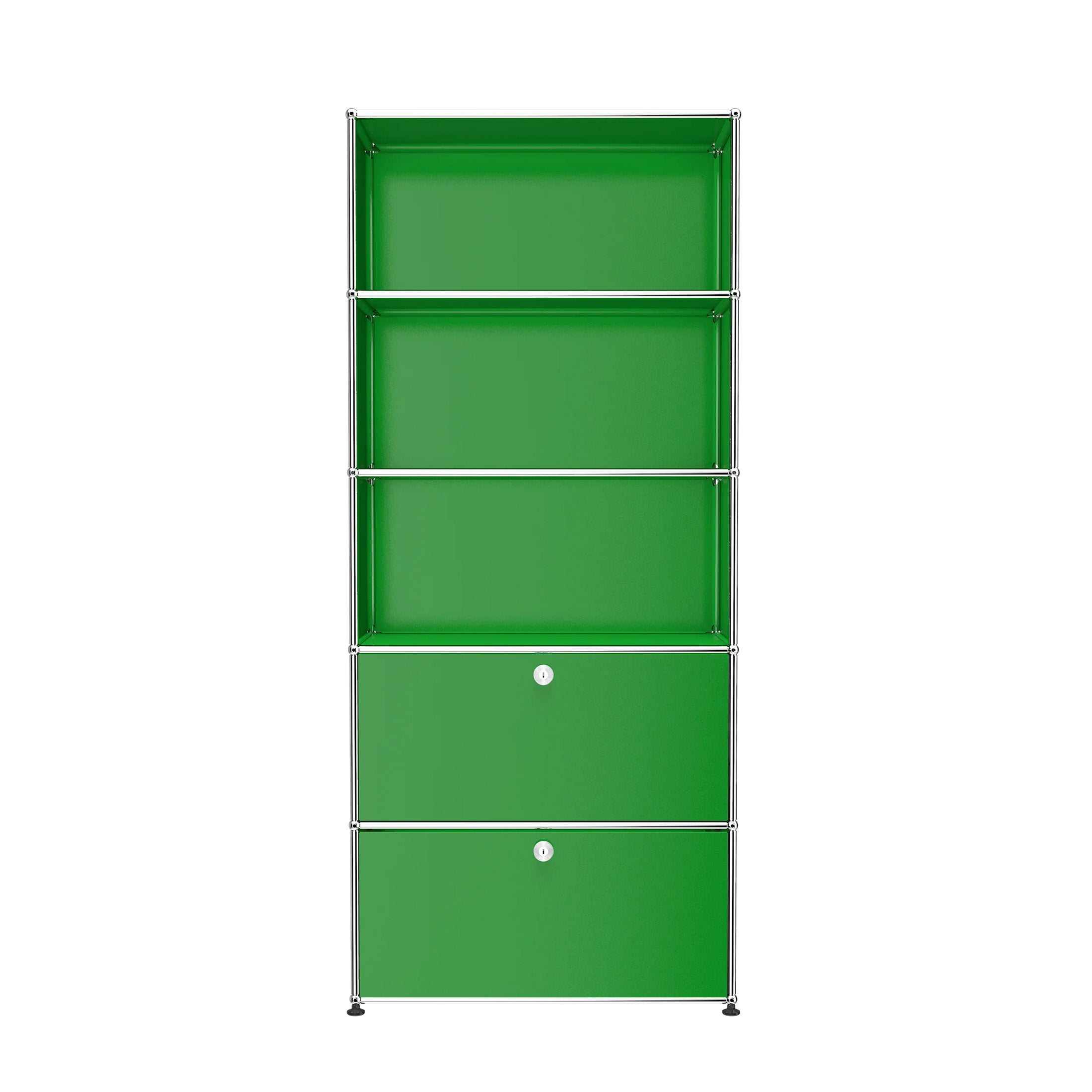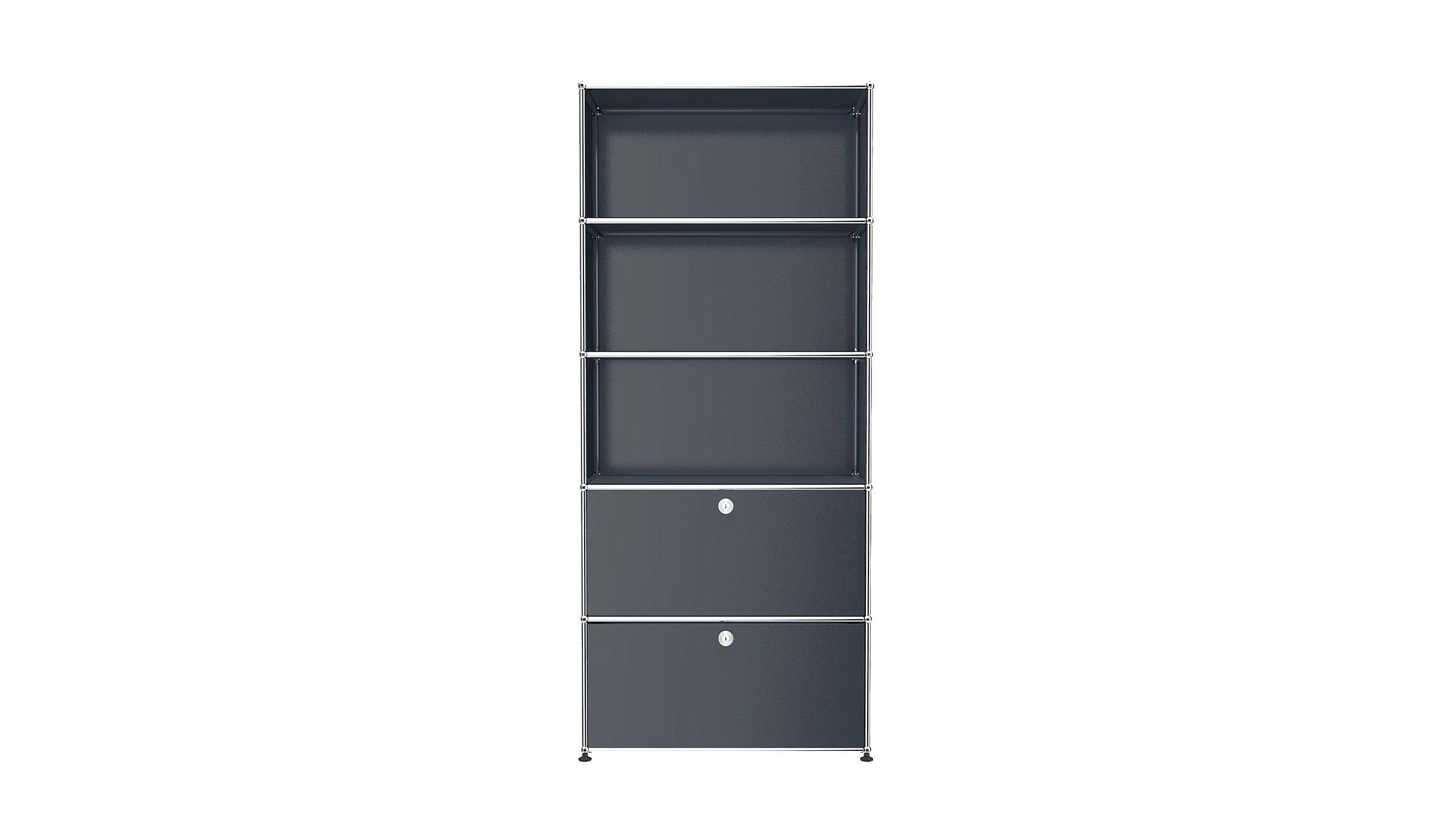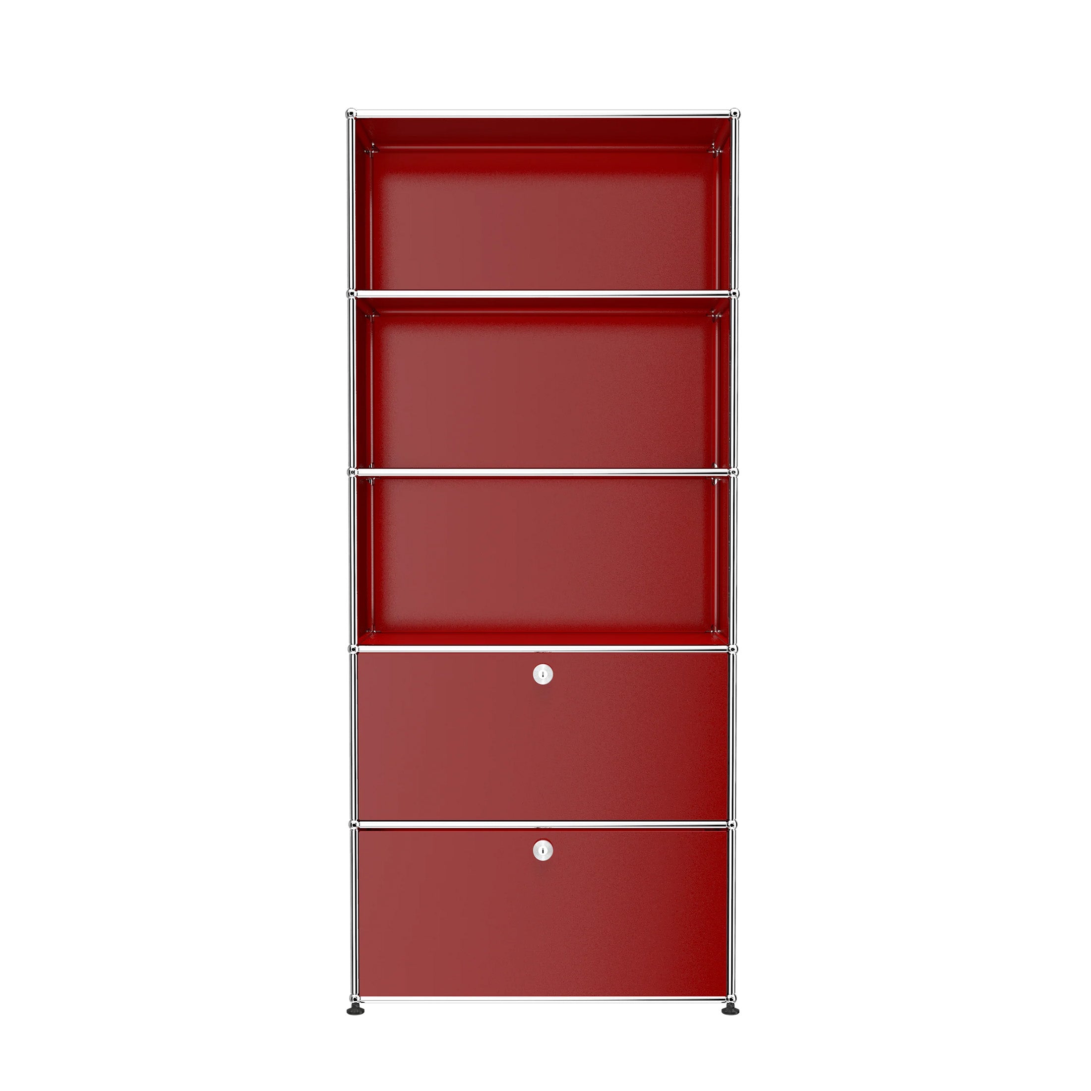 Shelving (R1) combines open display with concealed storage in a compact vertical format. A 14-inch upper drop-down door and a 14-inch lower drawer add practical function to its light, balanced composition. Available in 7 standard surface colors, it can be tailored to different spaces while maintaining a clean architectural profile.