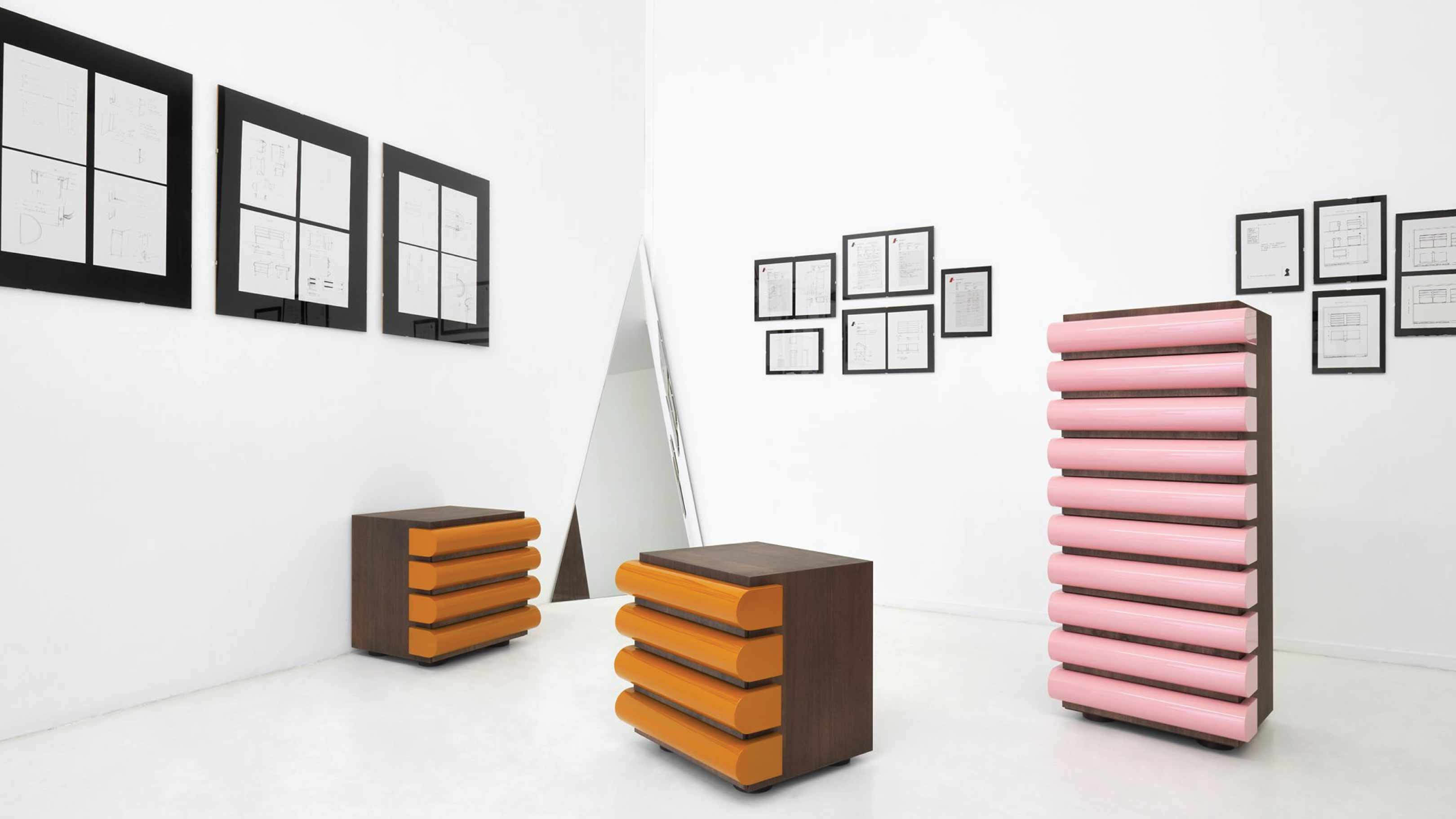 La característica distintiva del armario reside en las molduras de sus cajones, disponibles en una gama de colores lacados brillantes, como negro, blanco, blanco SW, lino, arena, arcilla, burdeos, rosa, verde oscuro, amarillo mostaza, rojo ladrillo y azul marino. El diseño único y los vibrantes colores del Storet son un testimonio de la visión creativa de Nanda Vigo y la maestría artesanal de Acerbis.