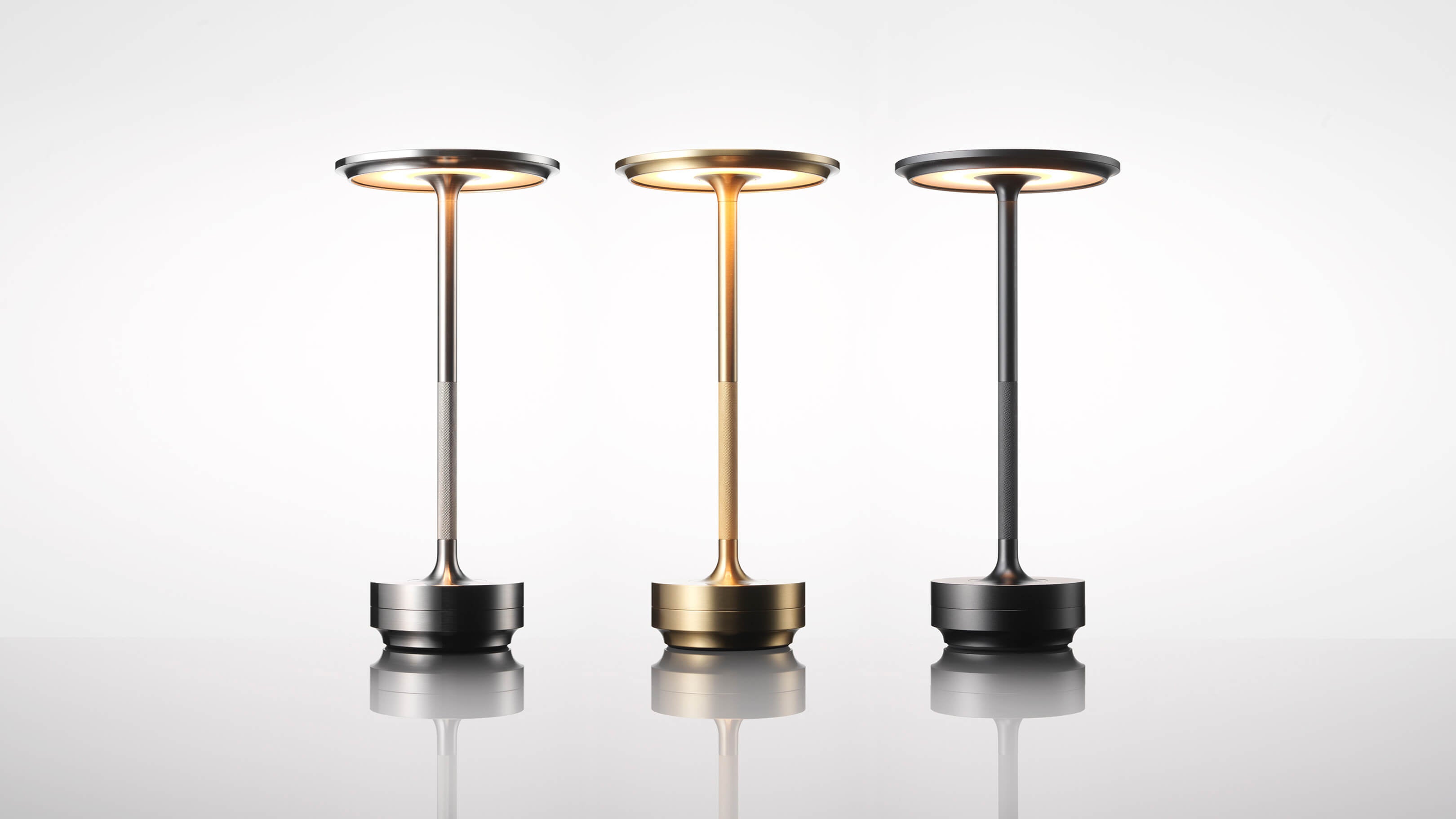 "Turn" representa la forma en que se gira un bloque de metal para crear la forma de la lámpara. La elegante forma metálica de la lámpara de mesa se compone de una pantalla circular y una base conectadas en el centro por una varilla. La textura de Turn es agradable al tacto y está diseñada para ganarse un lugar permanente en tu vida.