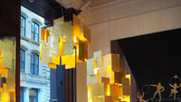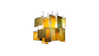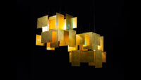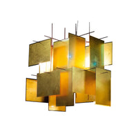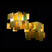 A dramatic sculpture of brilliant, golden light. Axel Schmid's 1000 Karat Blau Pendant Lamp for Ingo Maurer showcases a poetic approach to lighting design that incorporates unique materials in a spectacular form. Suspended from the ceiling above, the impressive pendant light is comprised of a rectilinear assemblage of acrylic panels encapsulating reflective gold leaf. As the lamp's name implies, gold is a signature motif of the design. Light bounces back and forth in the complex grid of translucent golden panels to produce wildly vibrant illumination. The lamp adds a sense of witty glamor to any setting and may be composed in groupings of two or more for impactful displays of artistic lighting. The 1000 Karat Blau Pendant Lamp showcases the beauty of materials and the poetry of illumination in a compellingly expressive form.