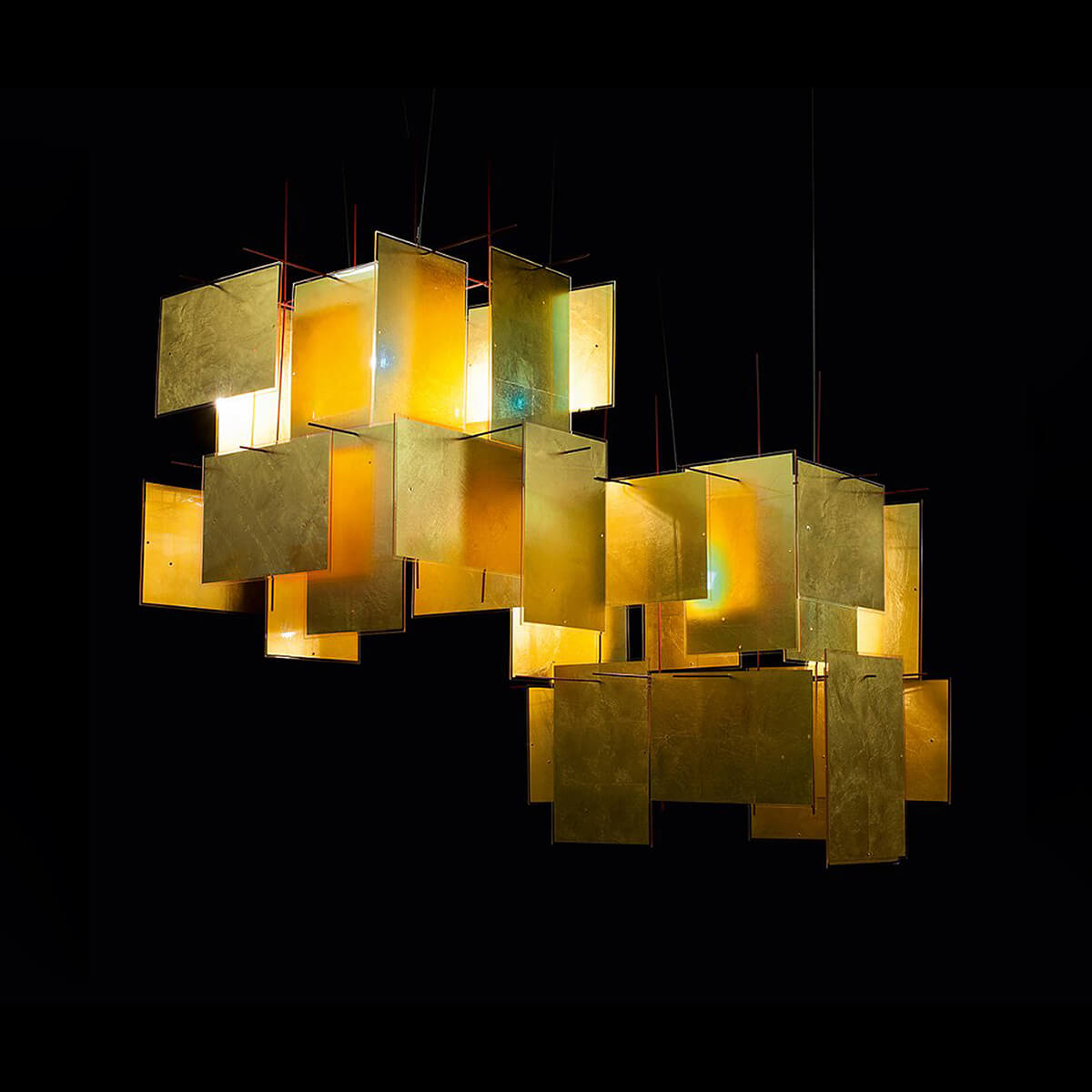 - Features a cubic arrangement of gold leaf and acrylic panels
