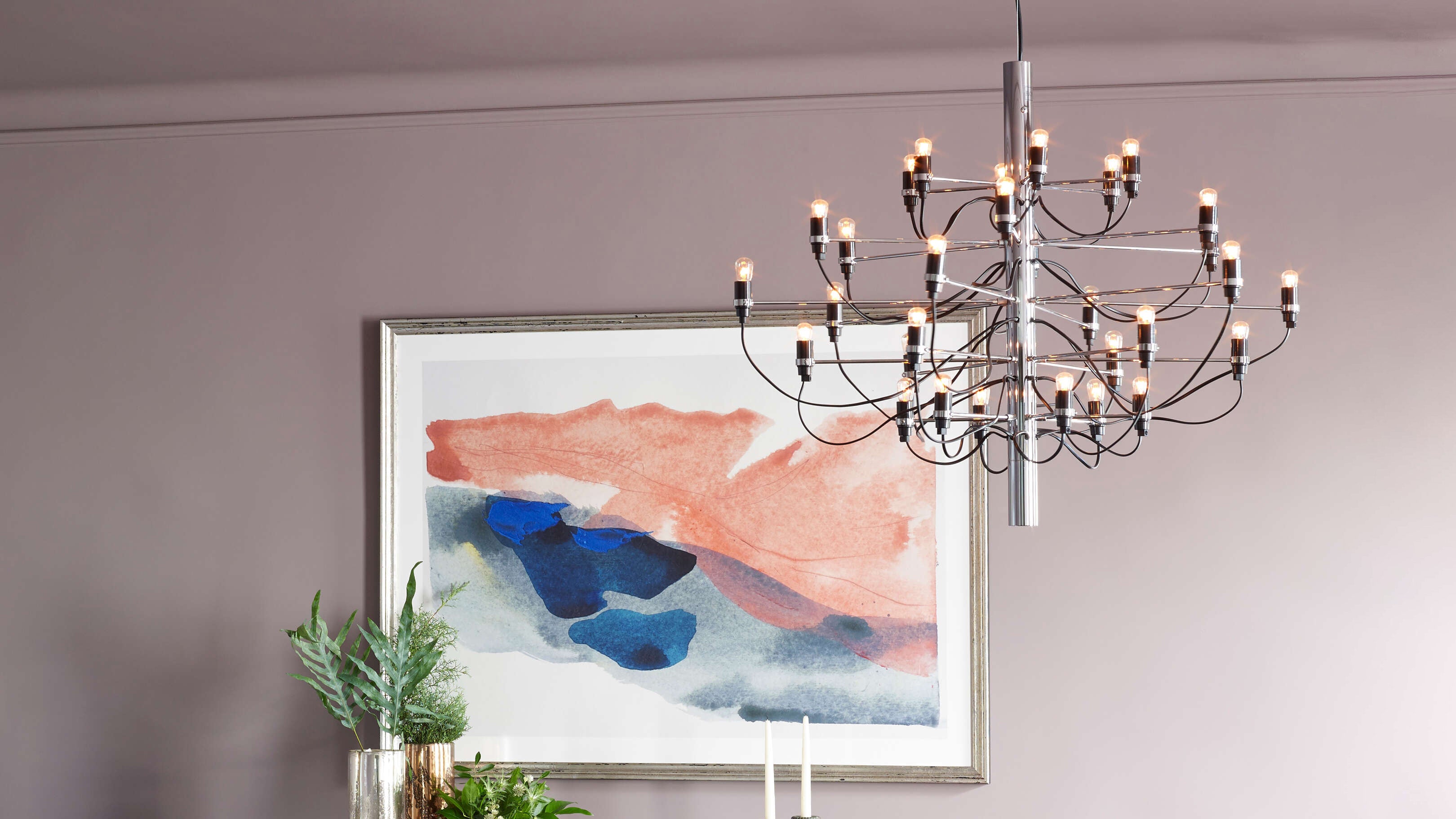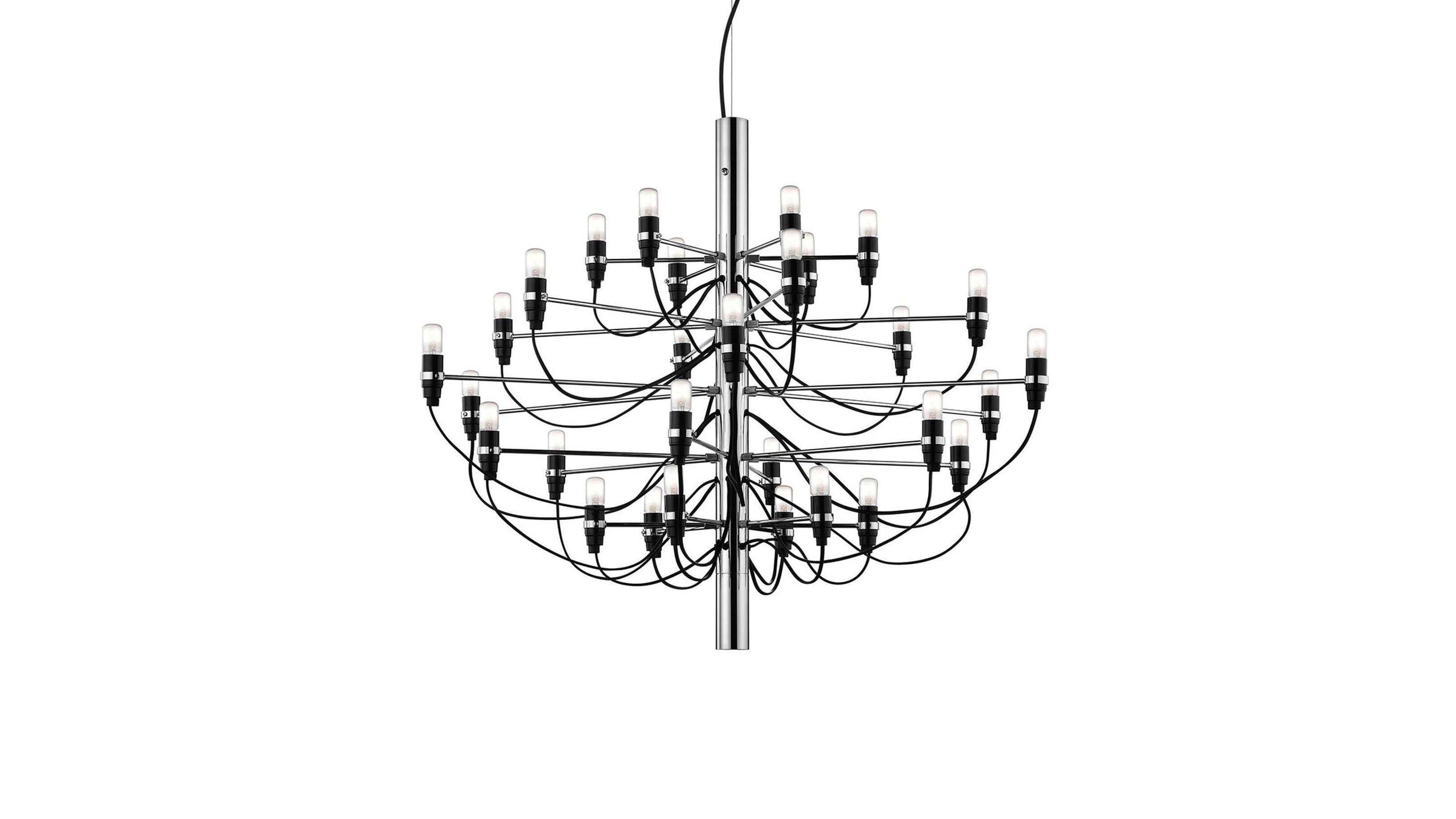 The Flos 2097/30 UL Chandelier, designed by Gino Sarfatti in 1958, is a modern reimagining of the traditional chandelier. Featuring 30 elegantly exposed arms, each fitted with clear or frosted 15W incandescent or LED bulbs, this iconic suspension lamp offers a perfect blend of minimalist design and functionality. Its central steel structure, paired with visible wiring, enhances the industrial aesthetic, while finishes like chrome, brass, matte white, and matte black provide a sleek, sophisticated look. Complete with a steel ceiling fitting and rose, the 2097/30 UL delivers diffused light, adding timeless elegance to any space.