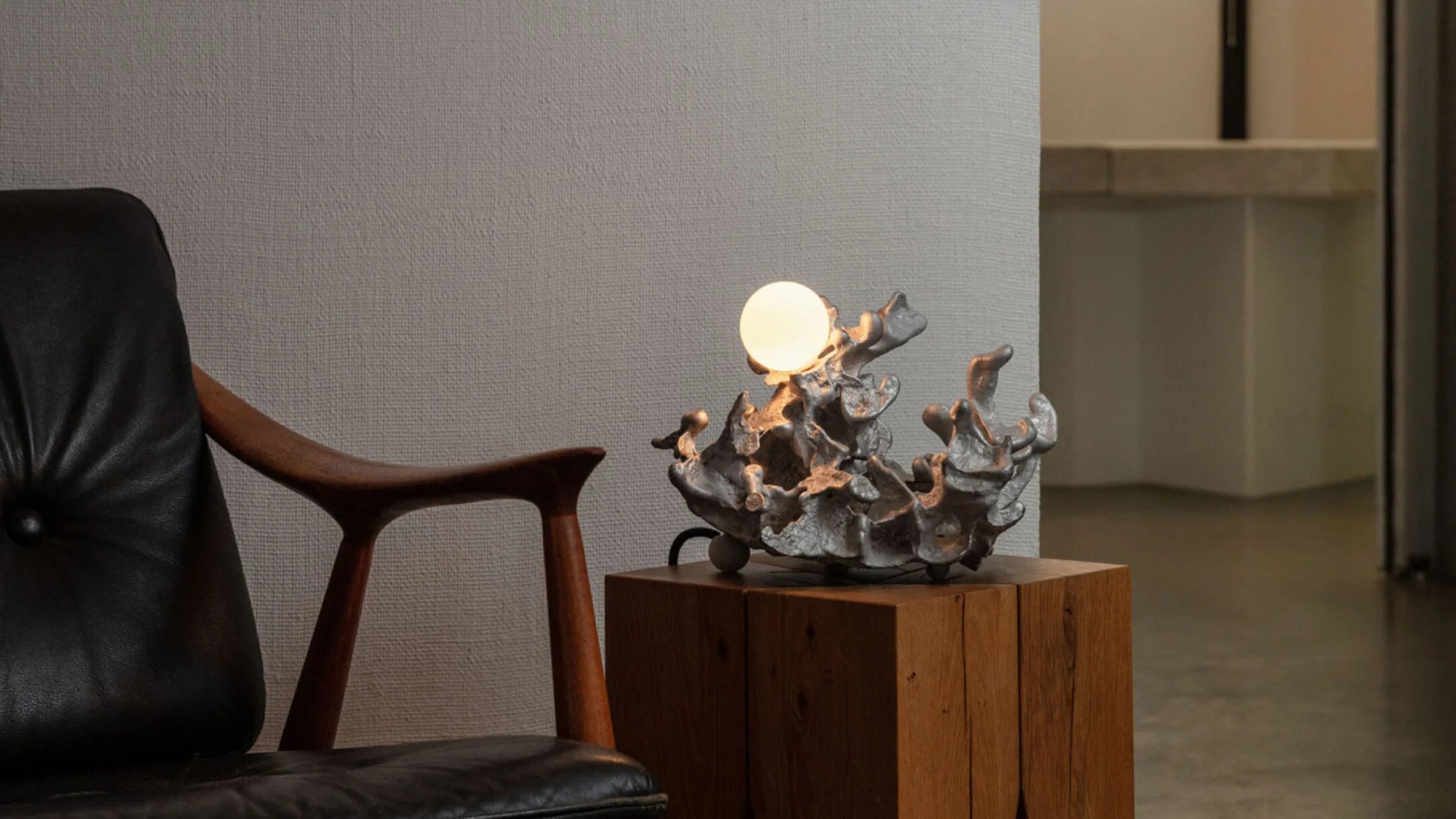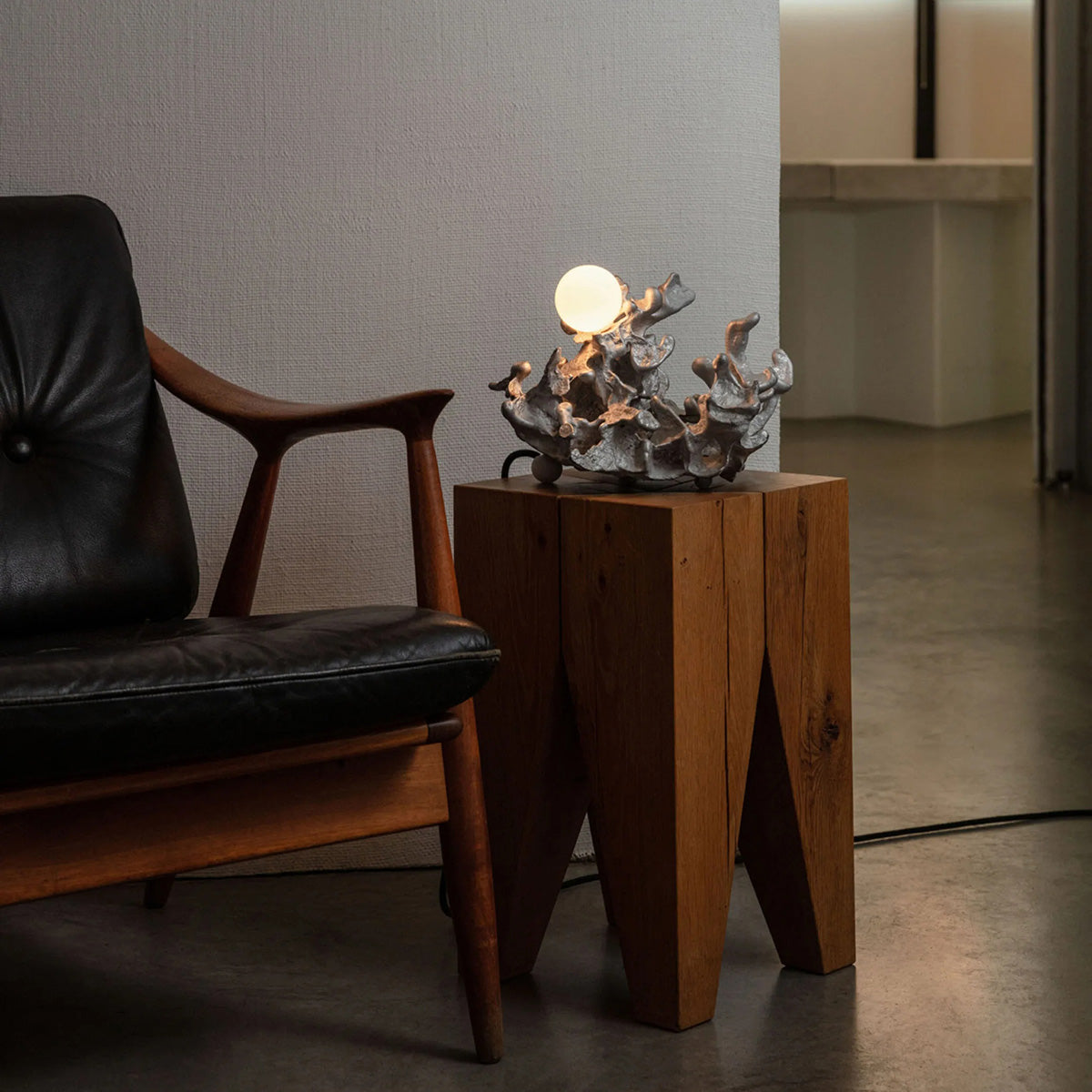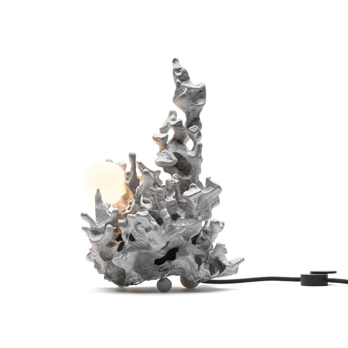 The 44t Table Lamp transforms raw industrial materials into a luminous sculpture. Cast from molten aluminum poured into resin-impregnated sand, each piece is entirely unique, with organic textures that capture the spontaneity of the process. The soft glow emitted from its integrated LED highlights the contrast between rough metal and refined light. A study in form, tactility, and chance, the 44t blurs the boundary between functional object and art piece.