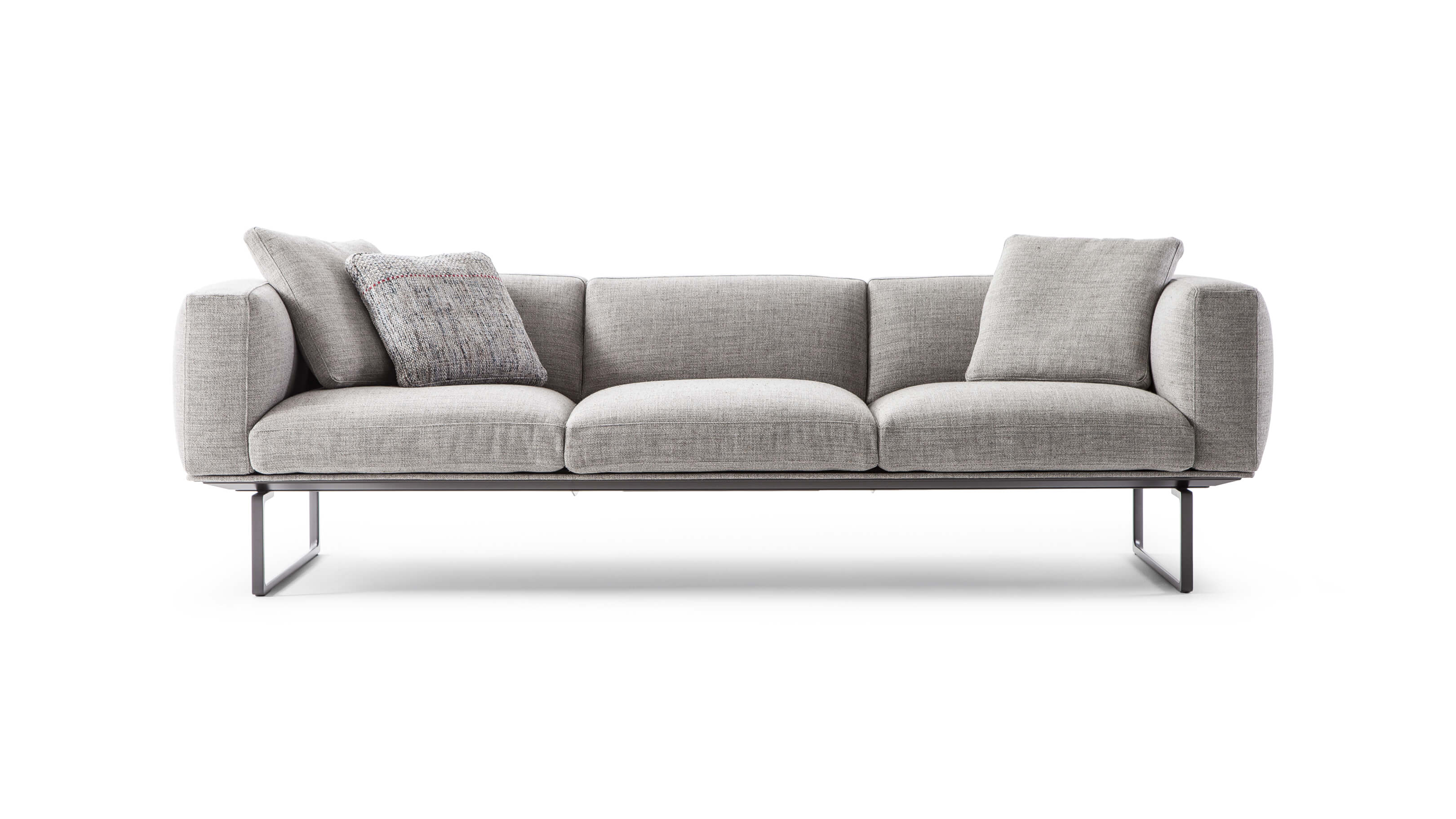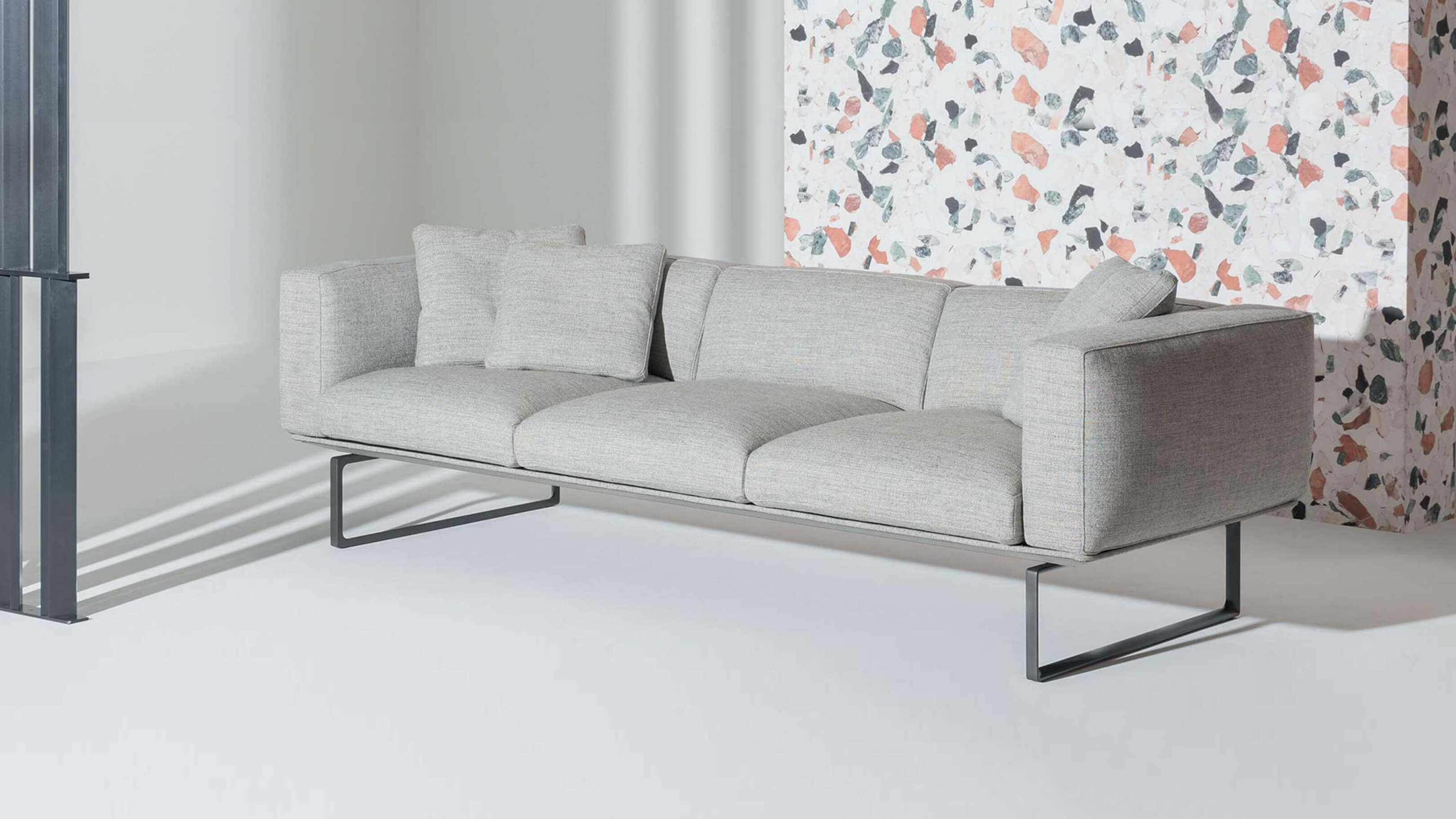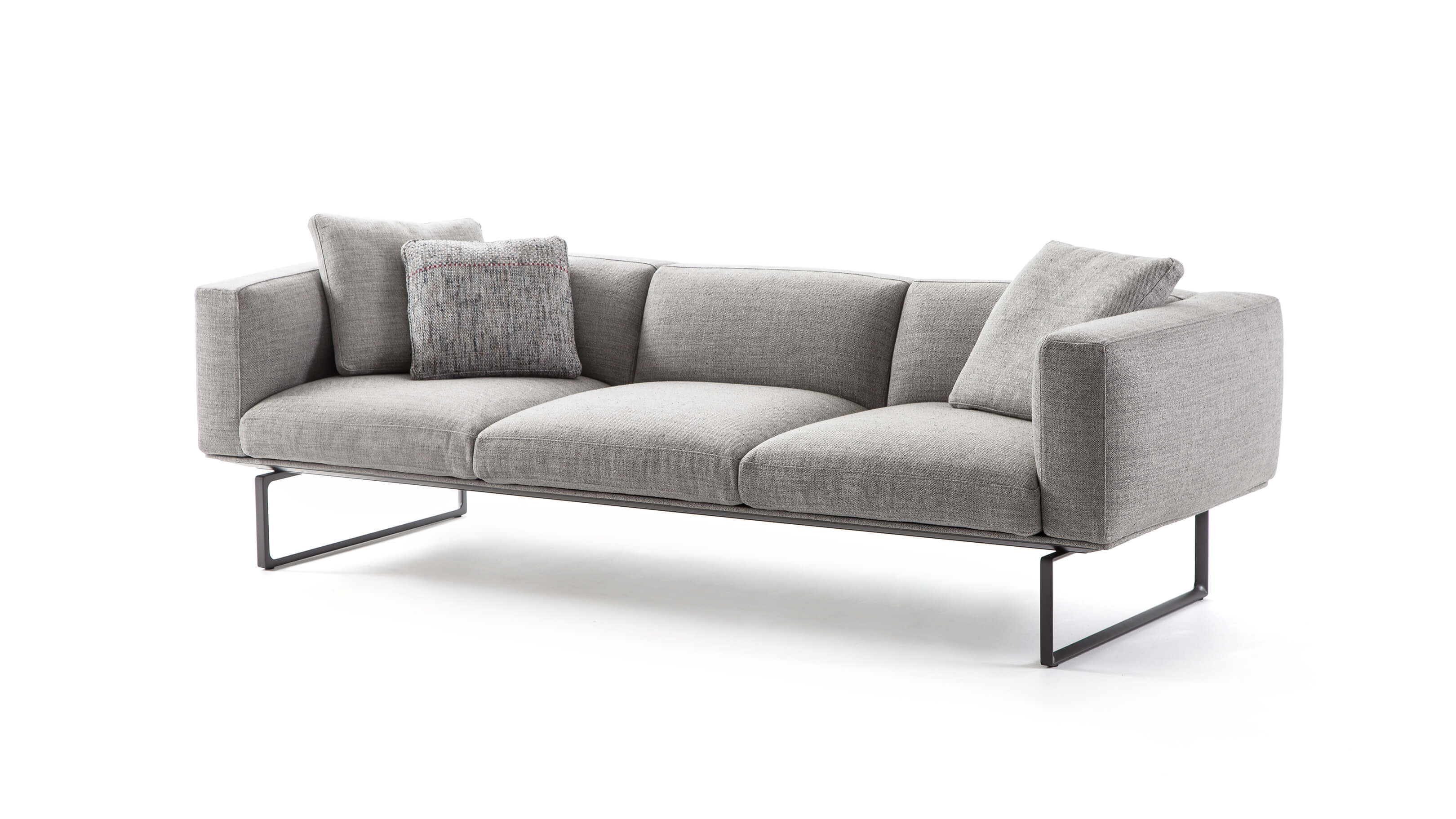 Its distinctive features include the elegant cast aluminum sleds that support the generous cushions, perfectly aligned with its carefully tailored upholstery; the light aluminum frame, refined with a padded leather or fabric trim.