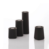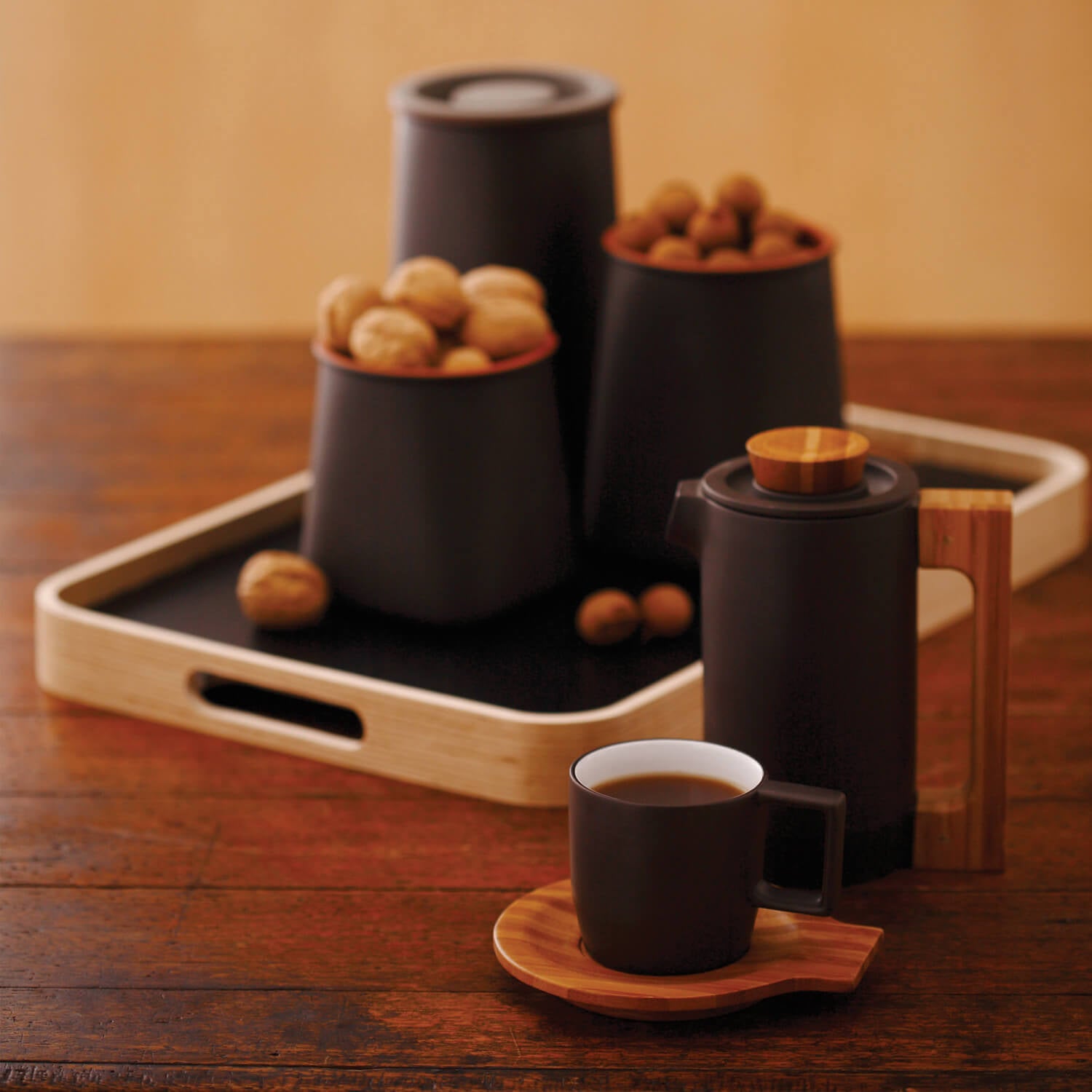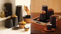 • Made of terra-cotta, the canisters feature a black, raw exterior and a red interior