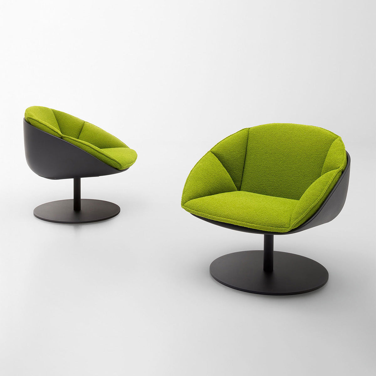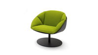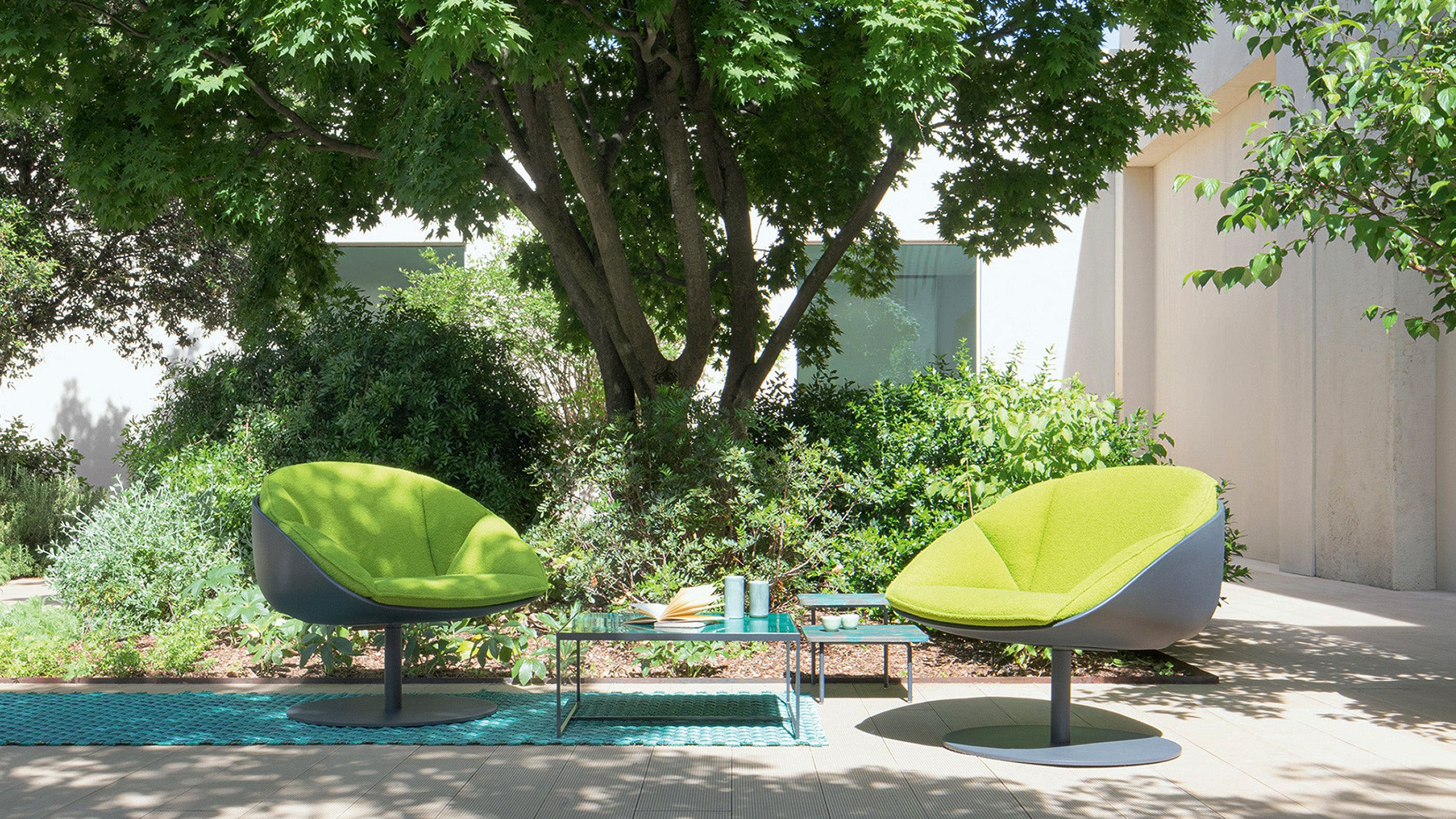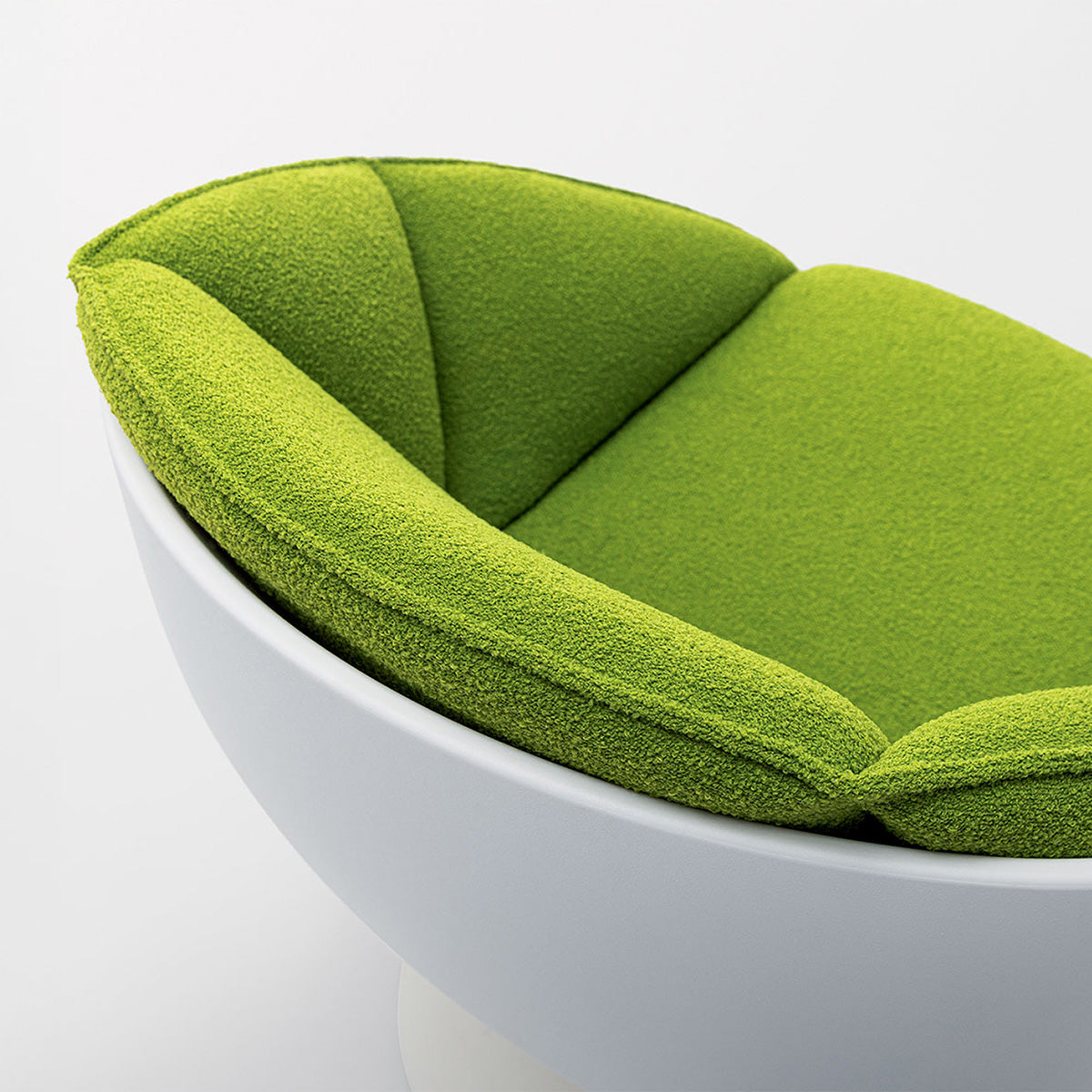 The Amable Swivel Lounge Chair, designed by Victor Carrasco for Paola Lenti, features a sleek aluminum base finished in matte avorio or graphite, accented with plastic spacers. Its molded polyethylene shell is available in bianco, ghiaccio, or graphite, harmonizing seamlessly with the sturdy base. The removable pad, crafted from recycled and biodegradable polyester fiber with a stress-resistant polyurethane core, is covered in waterproof polyester and secured by a sassafras wood stick. Designed for both outdoor and indoor use, it is recommended to protect the chair with a Winter Set cover. The Amable series, recognized with the 2018 German Design Award, embodies refined craftsmanship and versatility.