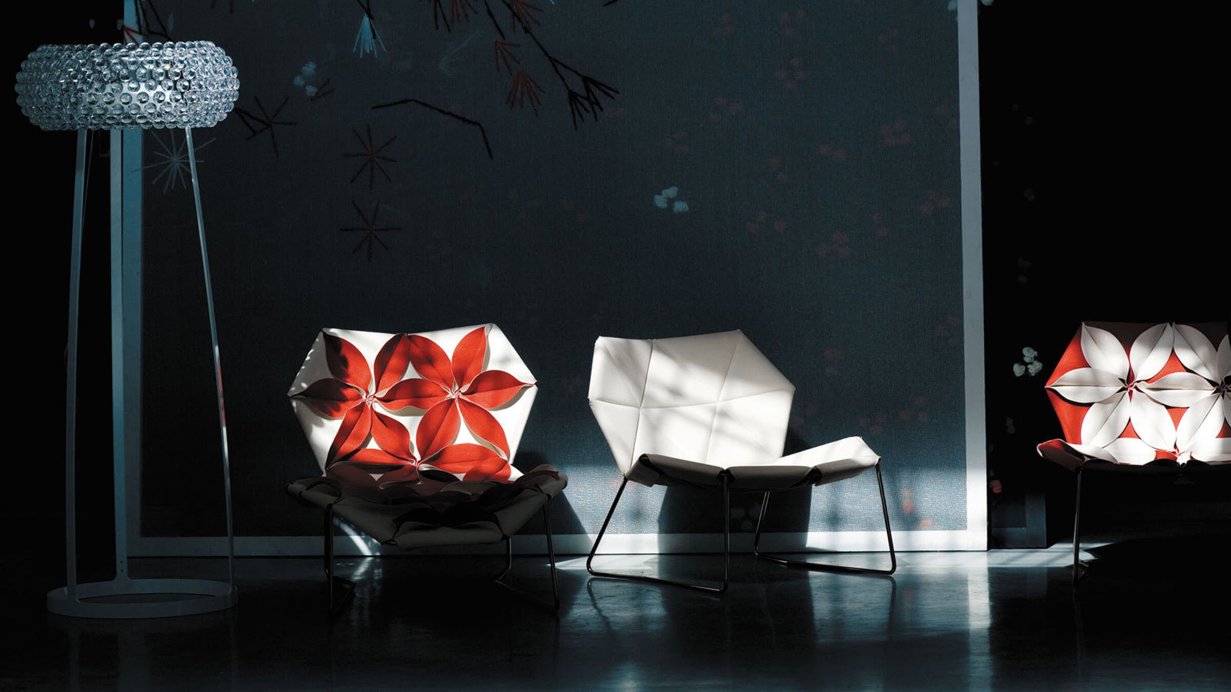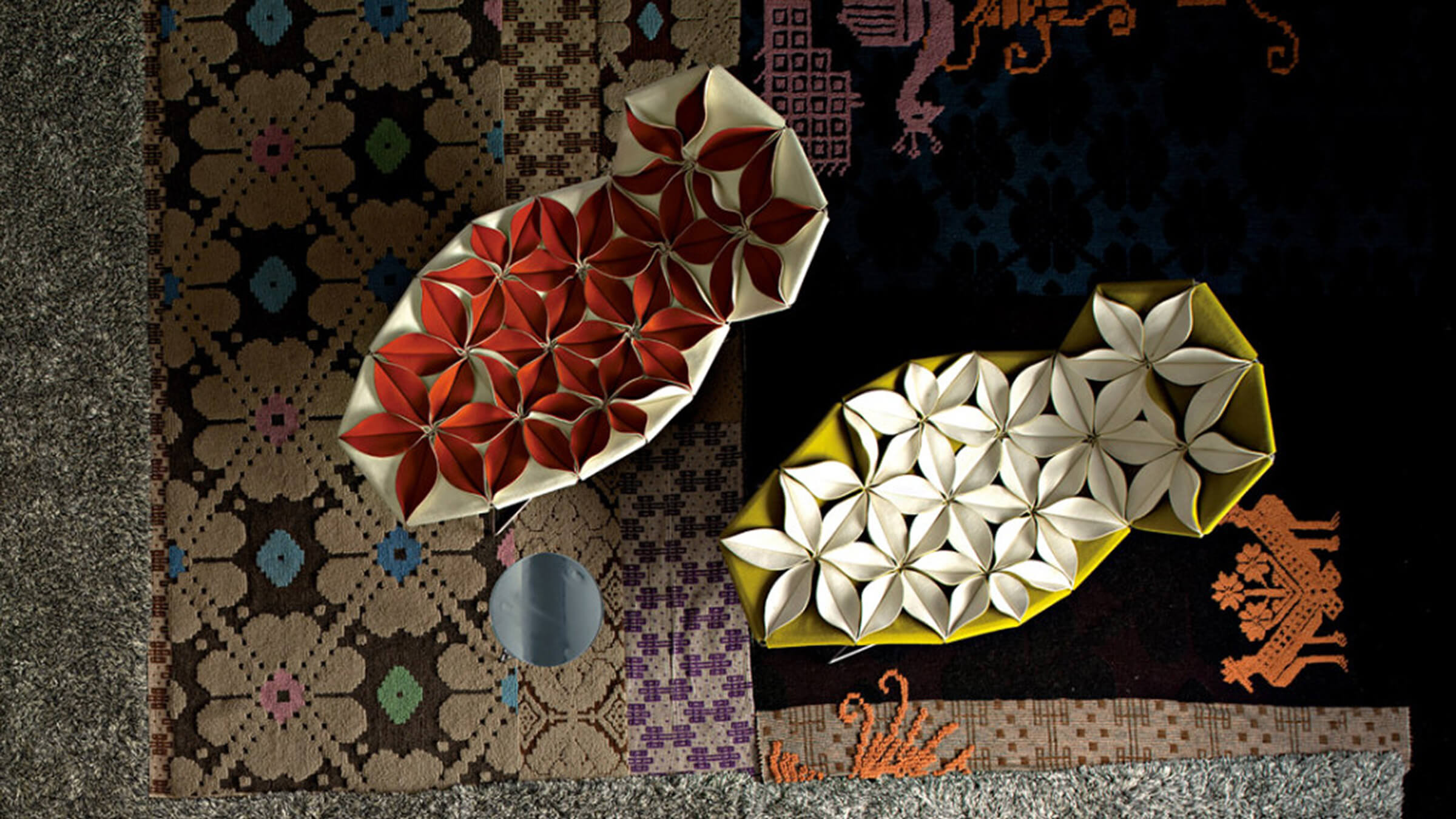 The cover creates two very different and striking moods: with the petals facing upwards for a more unconventional, feminine version; or facing downward for a deliberately severe, quilted look. The two sides are available in black and white, or a natural tone matched with a kaleidoscopic patchwork.