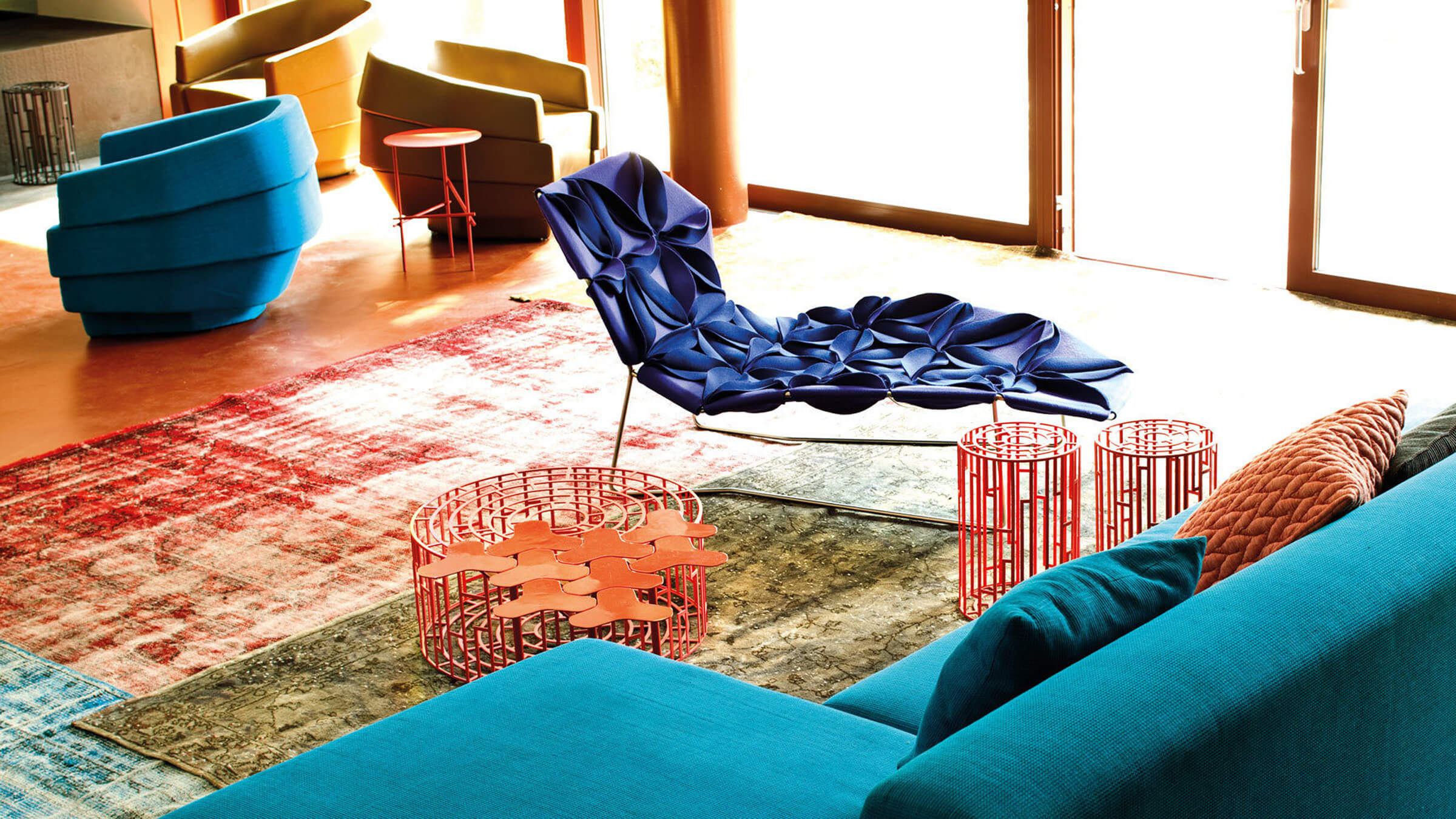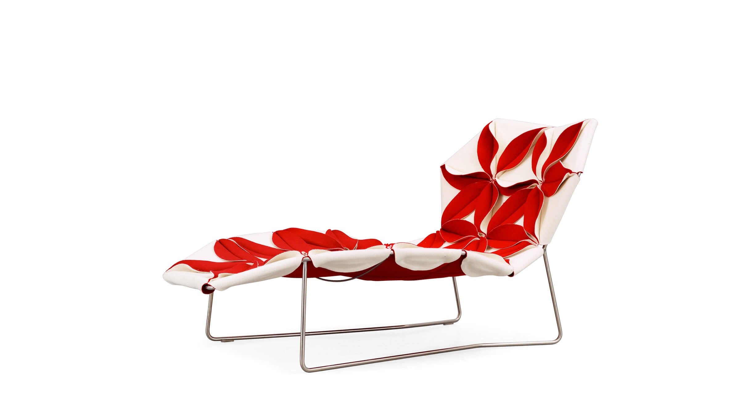 Seeking a new shape for a non-upholstered seating element, a lounge chair or a chaise longue, the design blossoms from petals sewn in triangular shapes, creating ample patterns. The lightly padded petals feature reversible materials.