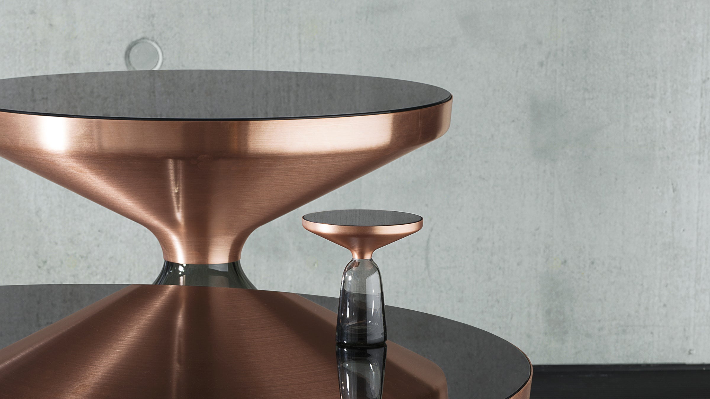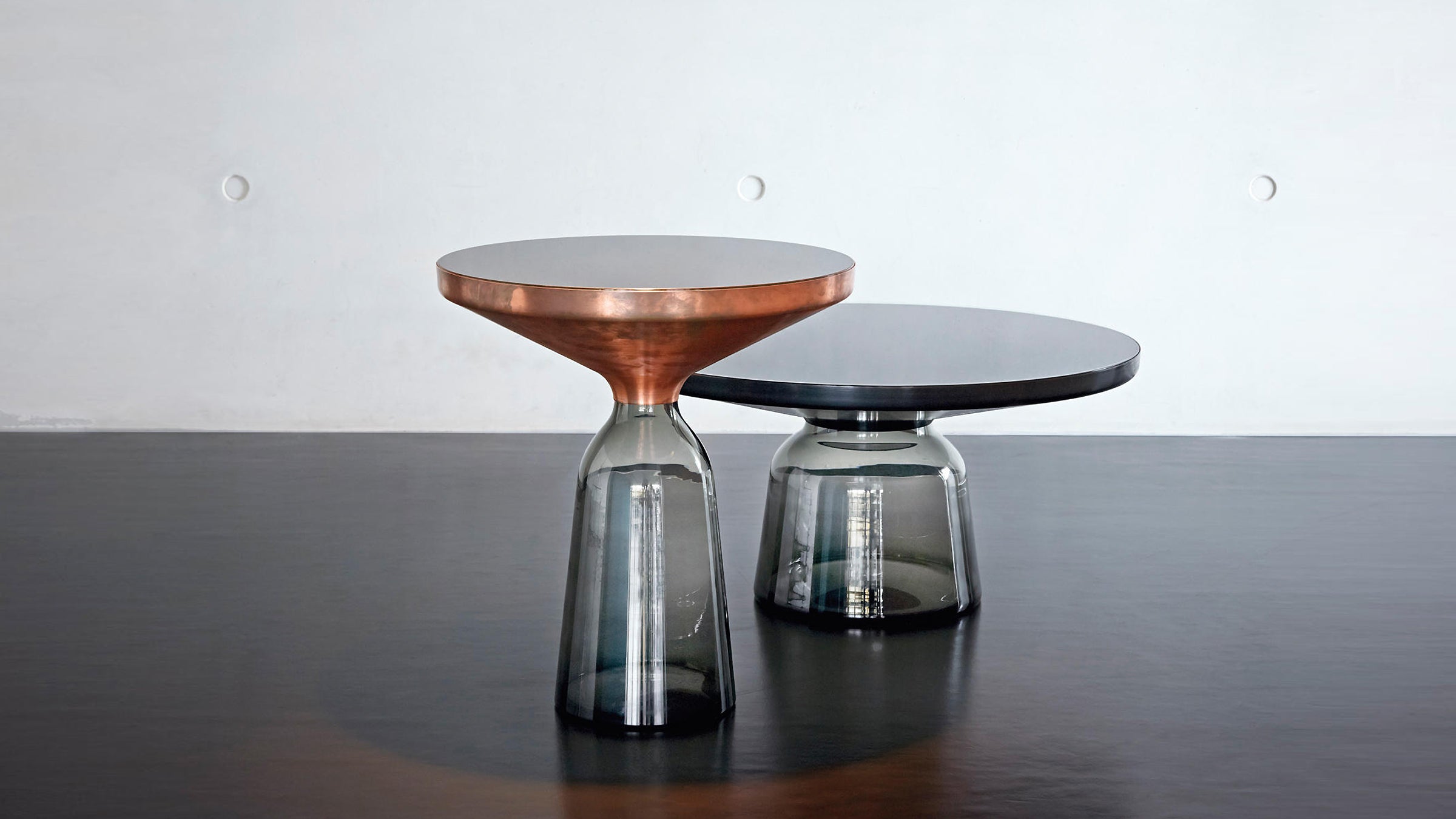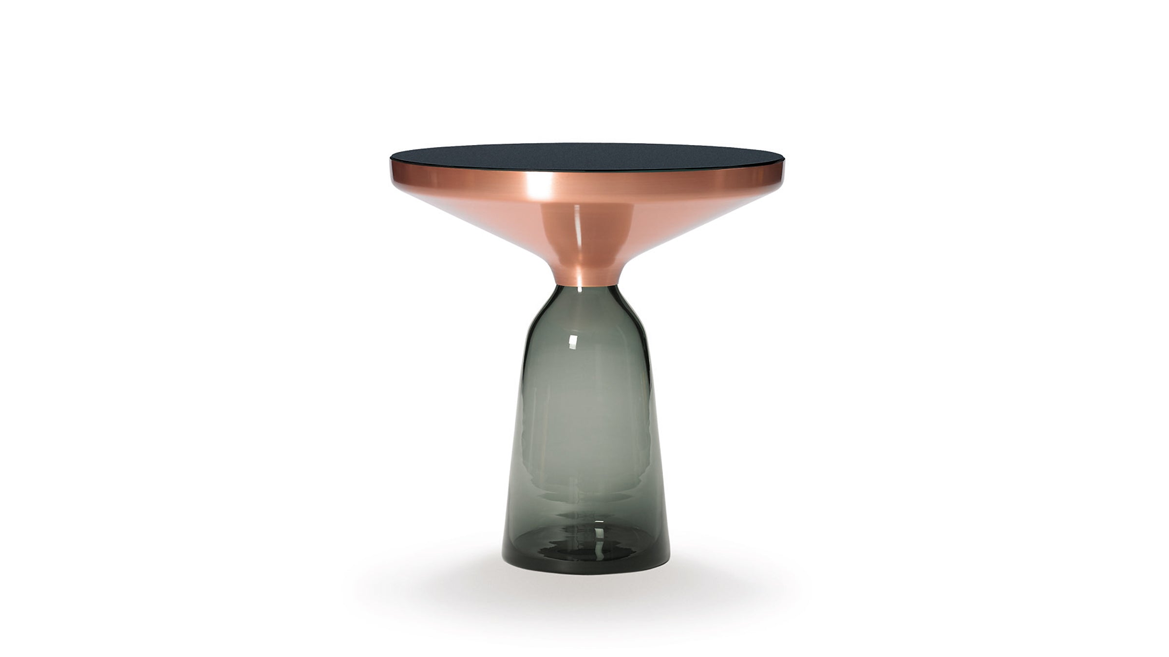 The Bell Side Table Copper Edition by Sebastian Herkner turns our perceptual habits on their head, using the lightweight, fragile material of glass as a base for a solid copper pedestal and a black lacquered crystal glass top that seems to float above. Hand-blown in the traditional manner using a wooden mold, the transparent tinted quartz grey glass base asserts a sculptural presence recalling the elegant curving silhouette of a bell, contrasting intriguingly with the solid metal frame on top.
