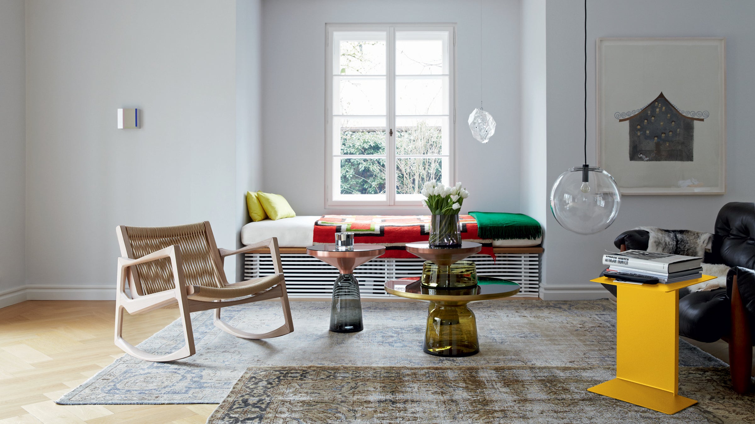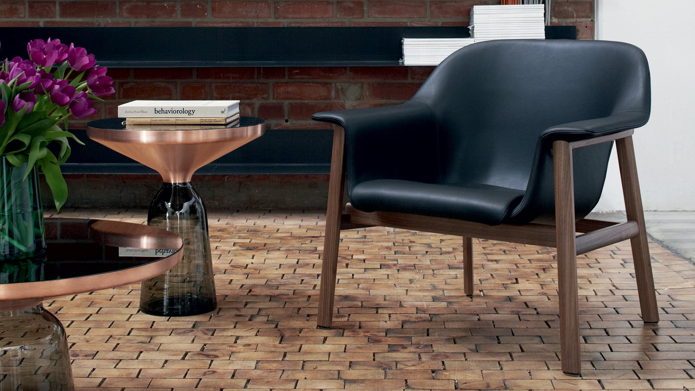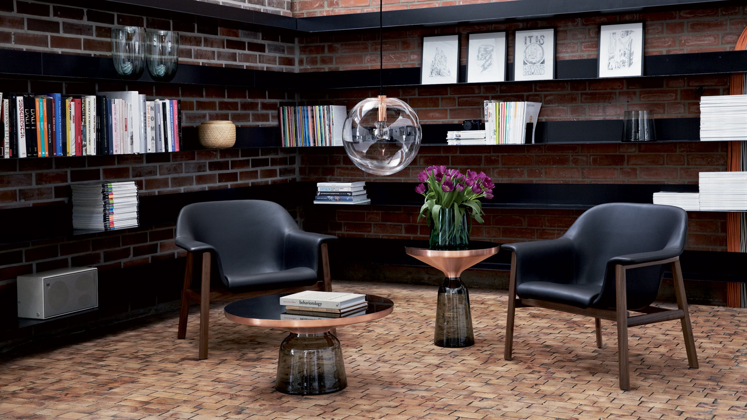 The Bell Side Table Copper Edition by Sebastian Herkner turns our perceptual habits on their head, using the lightweight, fragile material of glass as a base for a solid copper pedestal and a black lacquered crystal glass top that seems to float above. Hand-blown in the traditional manner using a wooden mold, the transparent tinted quartz grey glass base asserts a sculptural presence recalling the elegant curving silhouette of a bell, contrasting intriguingly with the solid metal frame on top.
