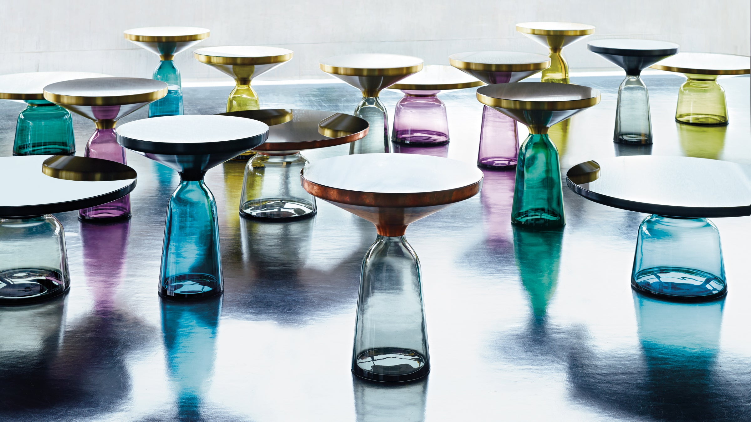 With its appealing reflective surface and different materials, the side table celebrates the artisanal tradition and adds a distinctive touch to domestic interiors. Each table is handmade, meaning that small bubbles or bumps in the glass are a characteristic feature.