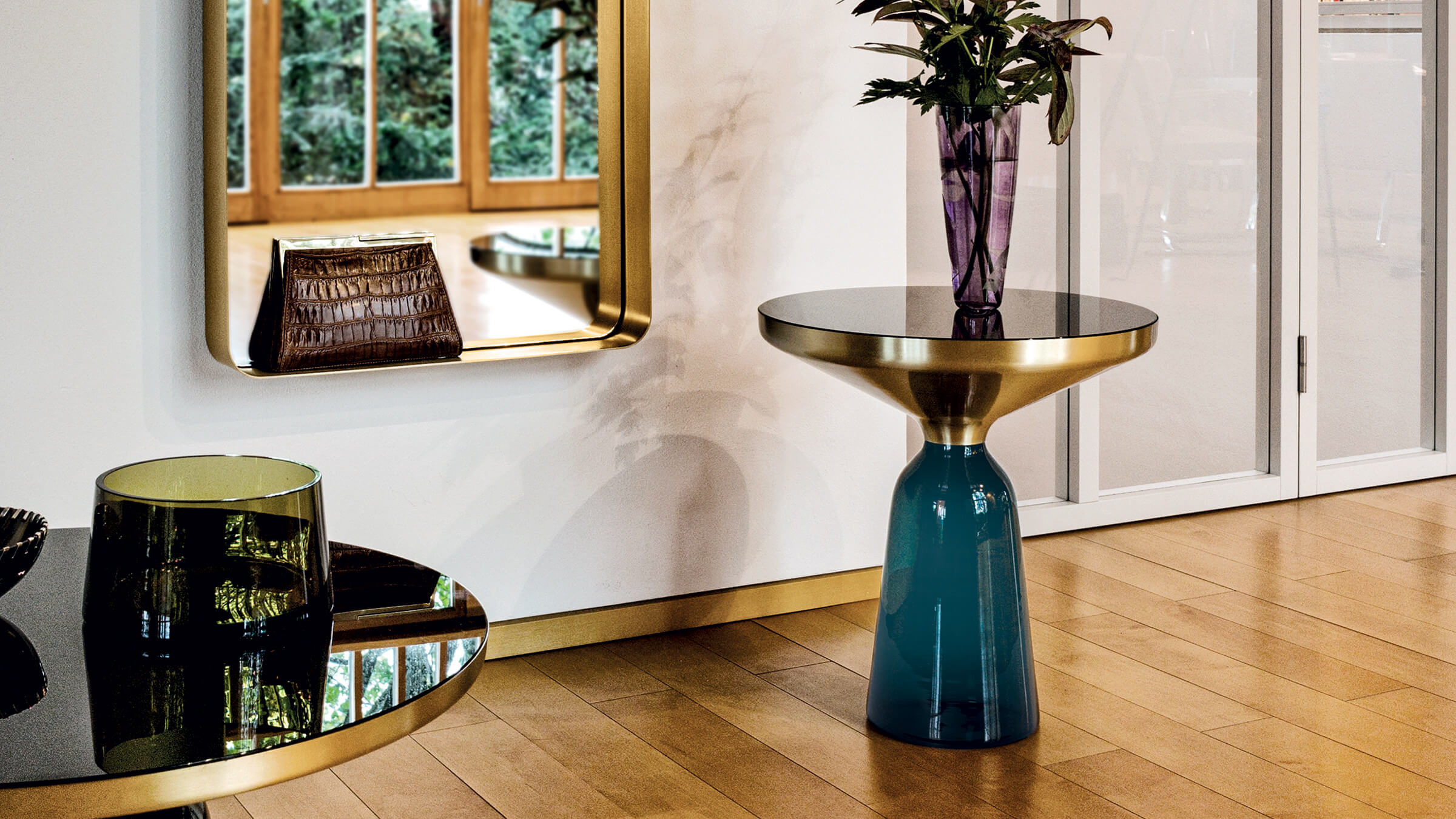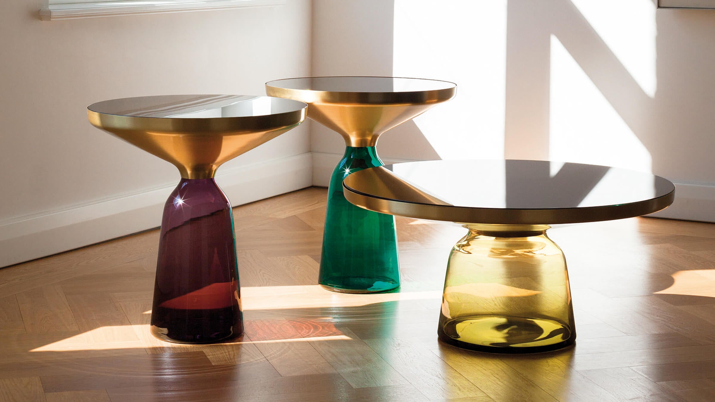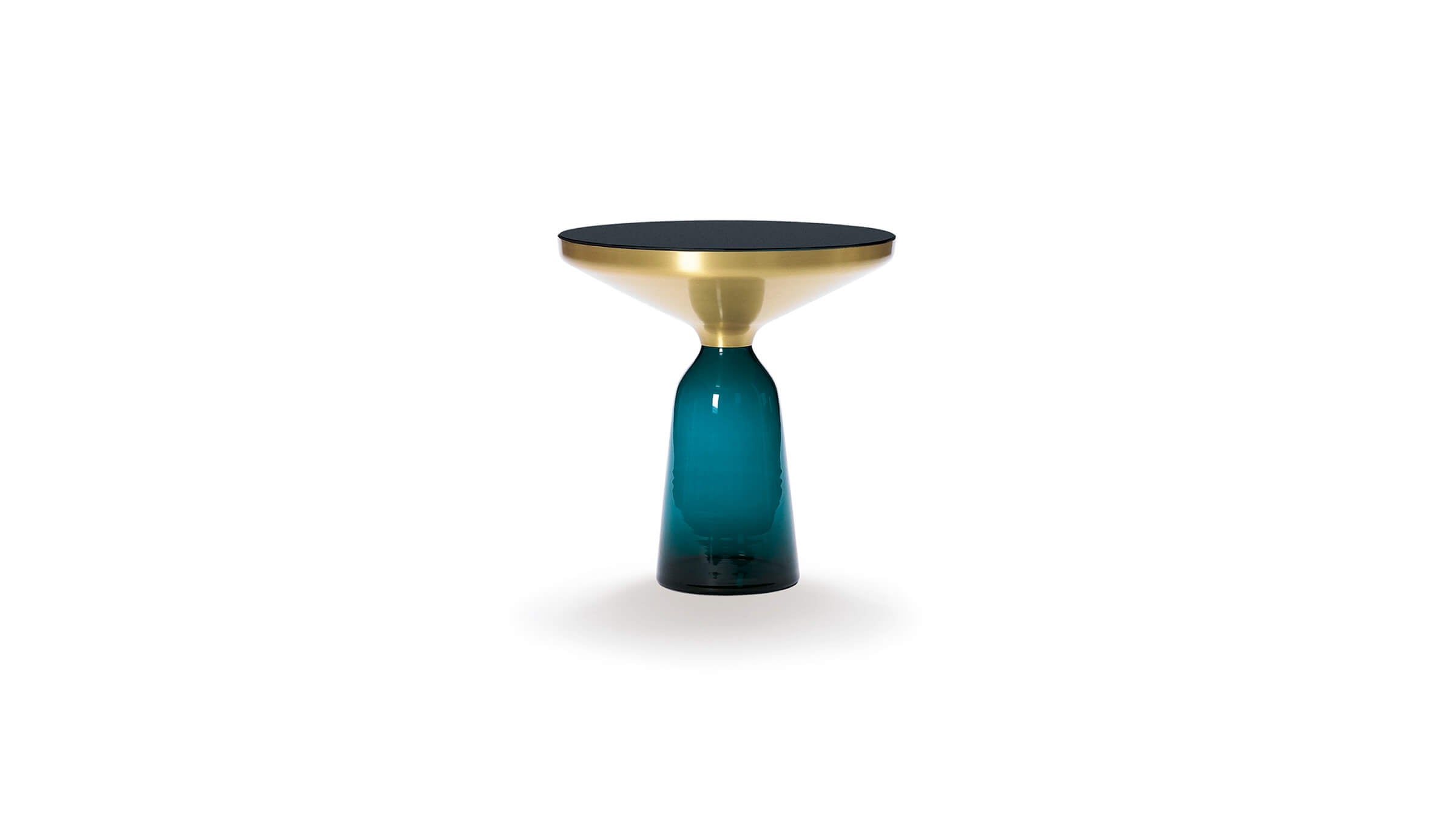 The Bell Side Table by Sebastian Herkner turns our perceptual habits on their head, using the lightweight, fragile material of glass as a base for a solid brass or steel pedestal and black lacquered crystal glass top that seems to float above.