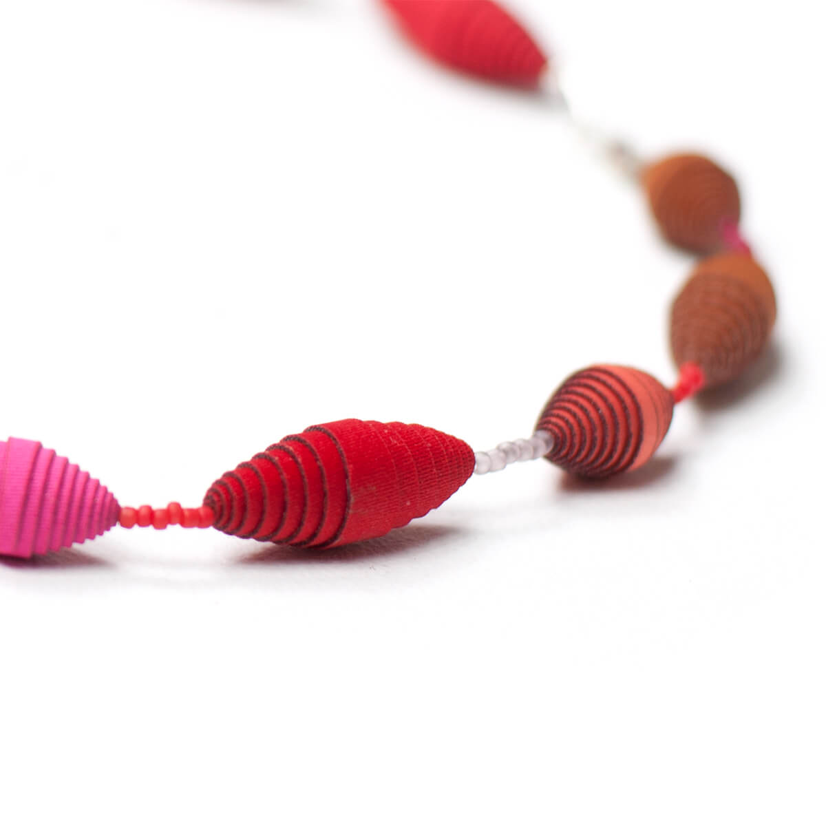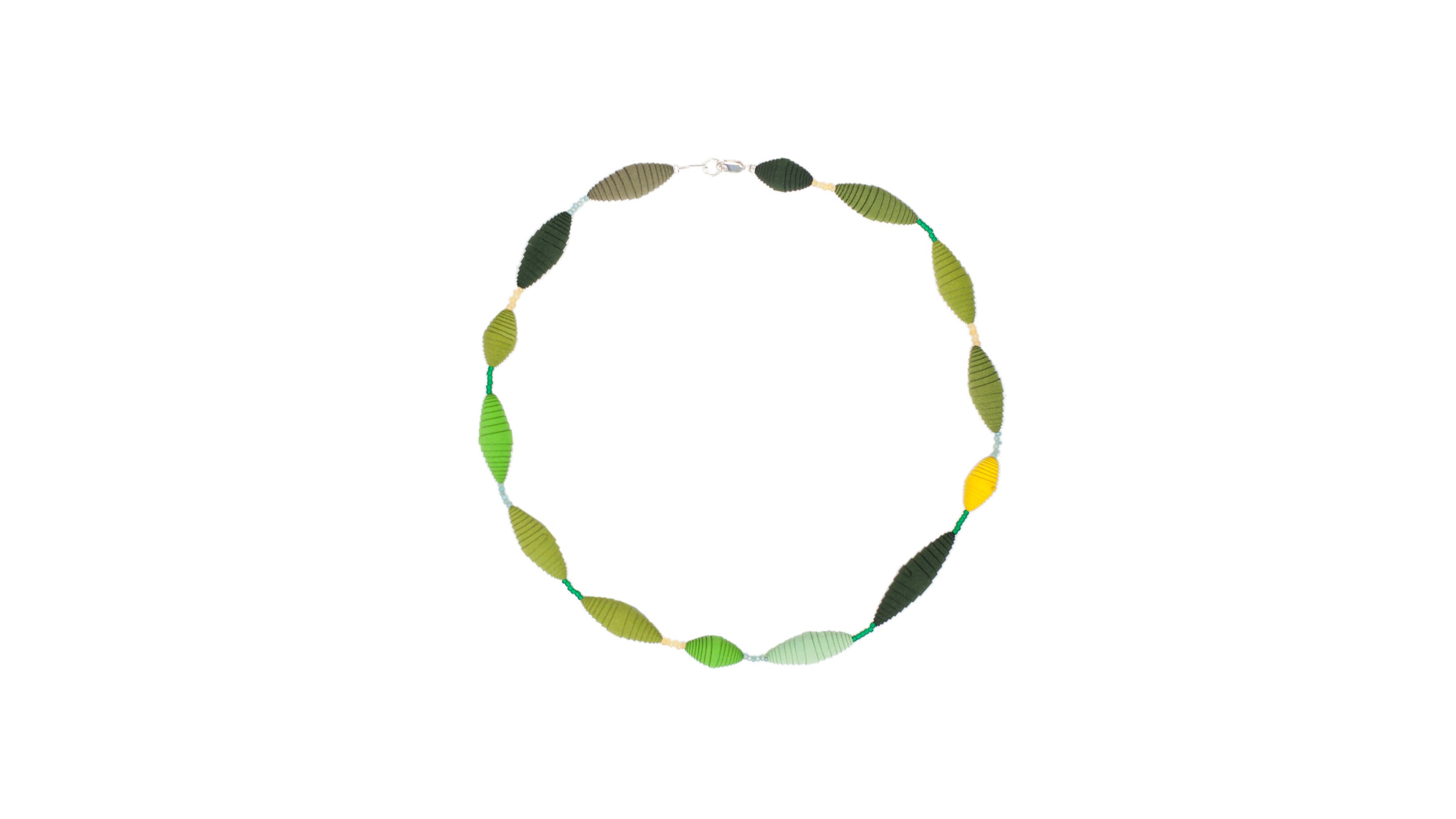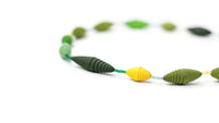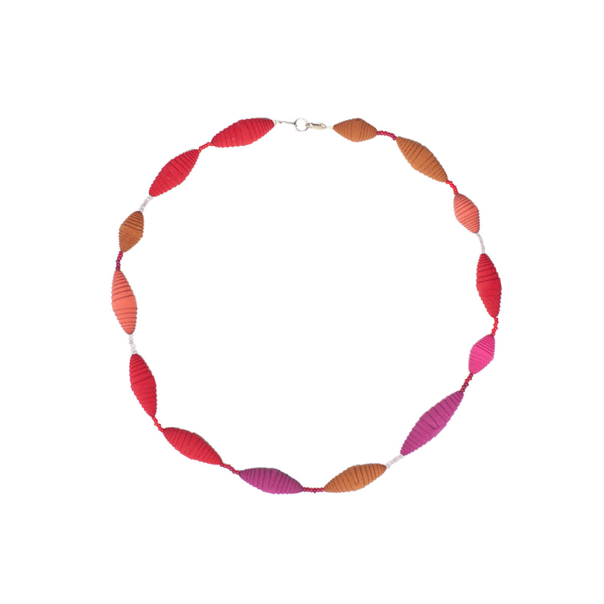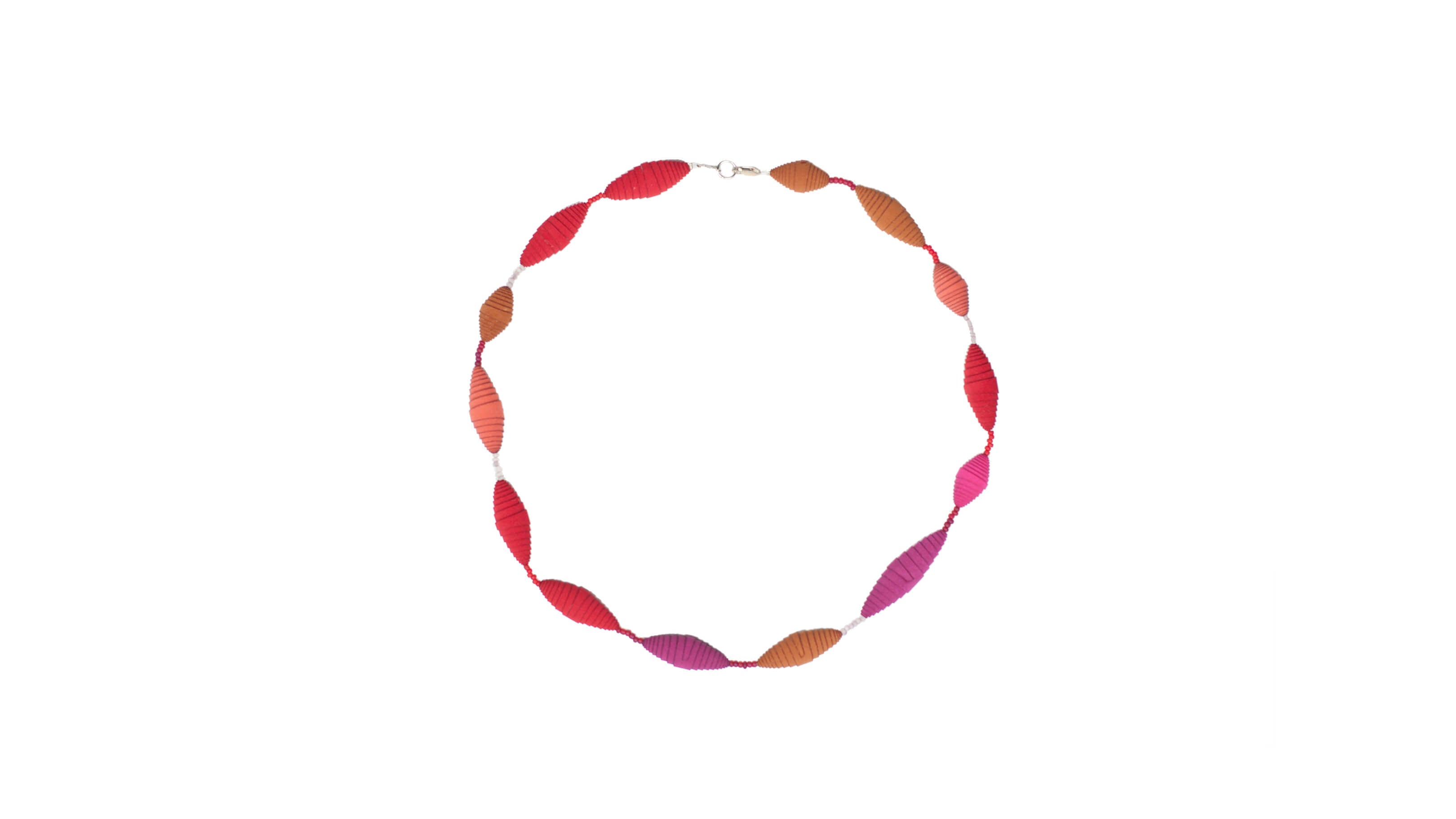With unconventional materials, Diana Schimmel creates a bold and colorful interpretation of a classic beaded necklace. In her Bicho Canasto Necklace, brightly-hued fabric is hand-rolled to form geometric beads for a dynamic piece of jewelry. The fabric beads are strung alongside small glass beads in complimenting colors for a unique necklace that conveys the wearer's appreciation for fashionable design. Recalling the culture of her homeland, Schimmel's designs incorporate craft and technology with exuberance. The designer was originally trained as an architect where she gained a new respect for materials and construction that continue to impact her work. Capturing the textural nature of the material, the Bicho Canasto Necklace is a stunning way to elevate any outfit.
