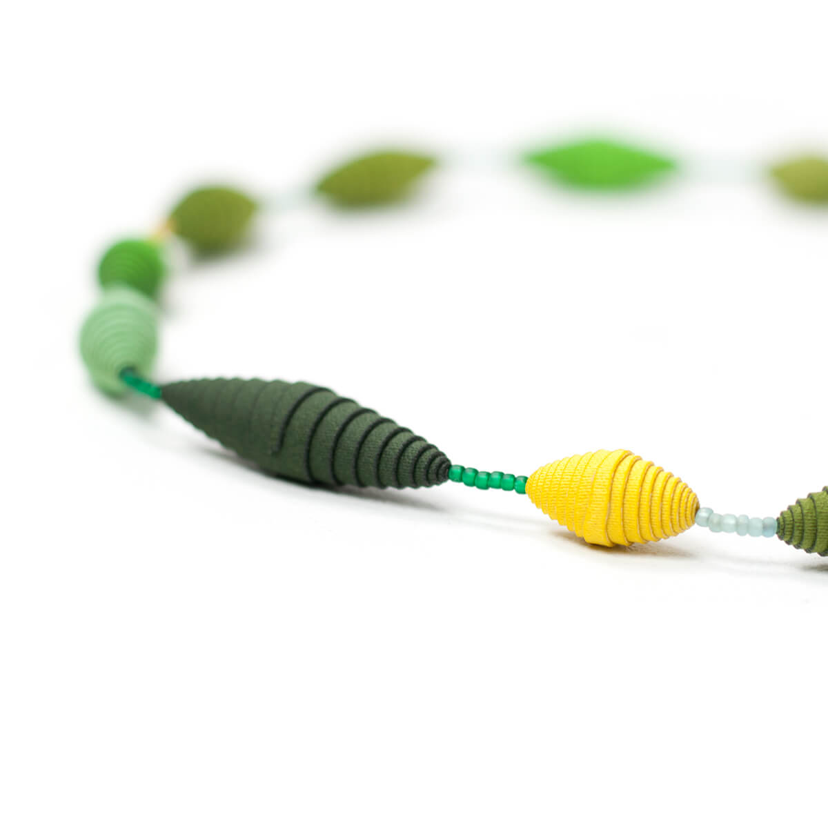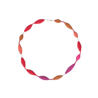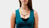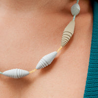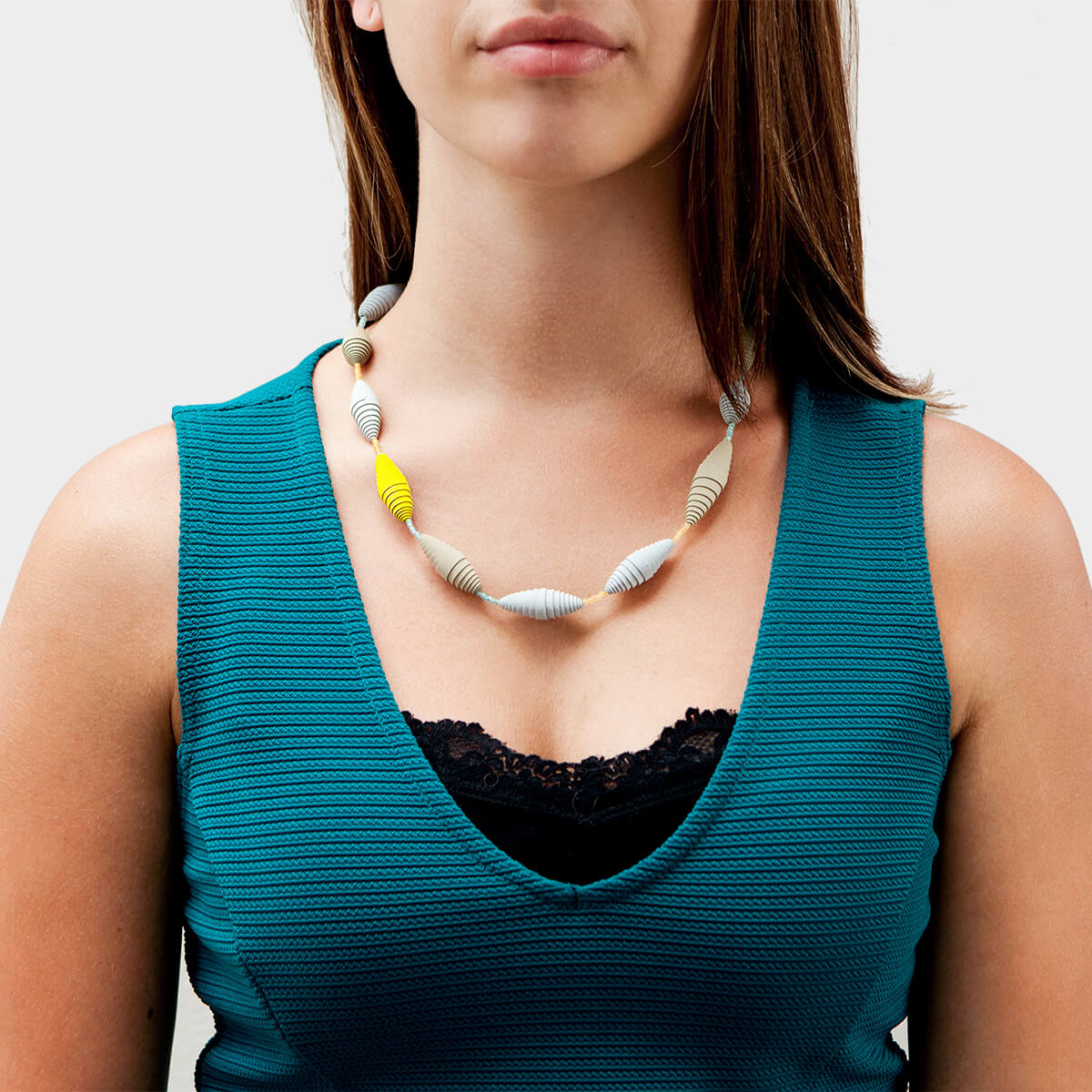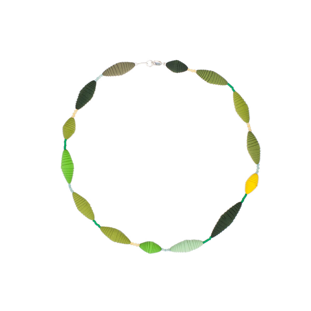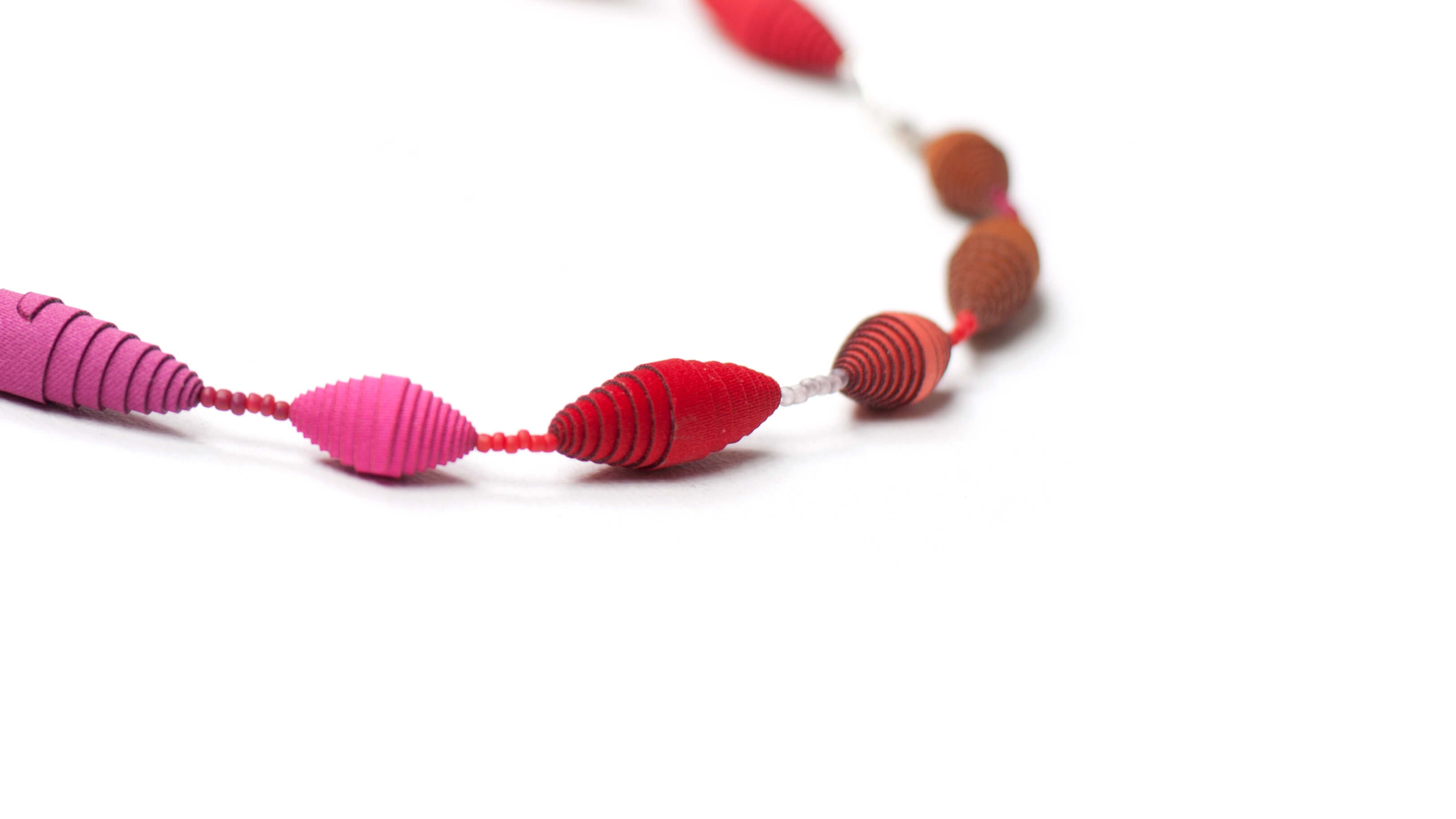 With unconventional materials, Diana Schimmel creates a bold and colorful interpretation of a classic beaded necklace. In her Bicho Canasto Necklace, brightly-hued fabric is hand-rolled to form geometric beads for a dynamic piece of jewelry. The fabric beads are strung alongside small glass beads in complimenting colors for a unique necklace that conveys the wearer's appreciation for fashionable design. Recalling the culture of her homeland, Schimmel's designs incorporate craft and technology with exuberance. The designer was originally trained as an architect where she gained a new respect for materials and construction that continue to impact her work. Capturing the textural nature of the material, the Bicho Canasto Necklace is a stunning way to elevate any outfit.