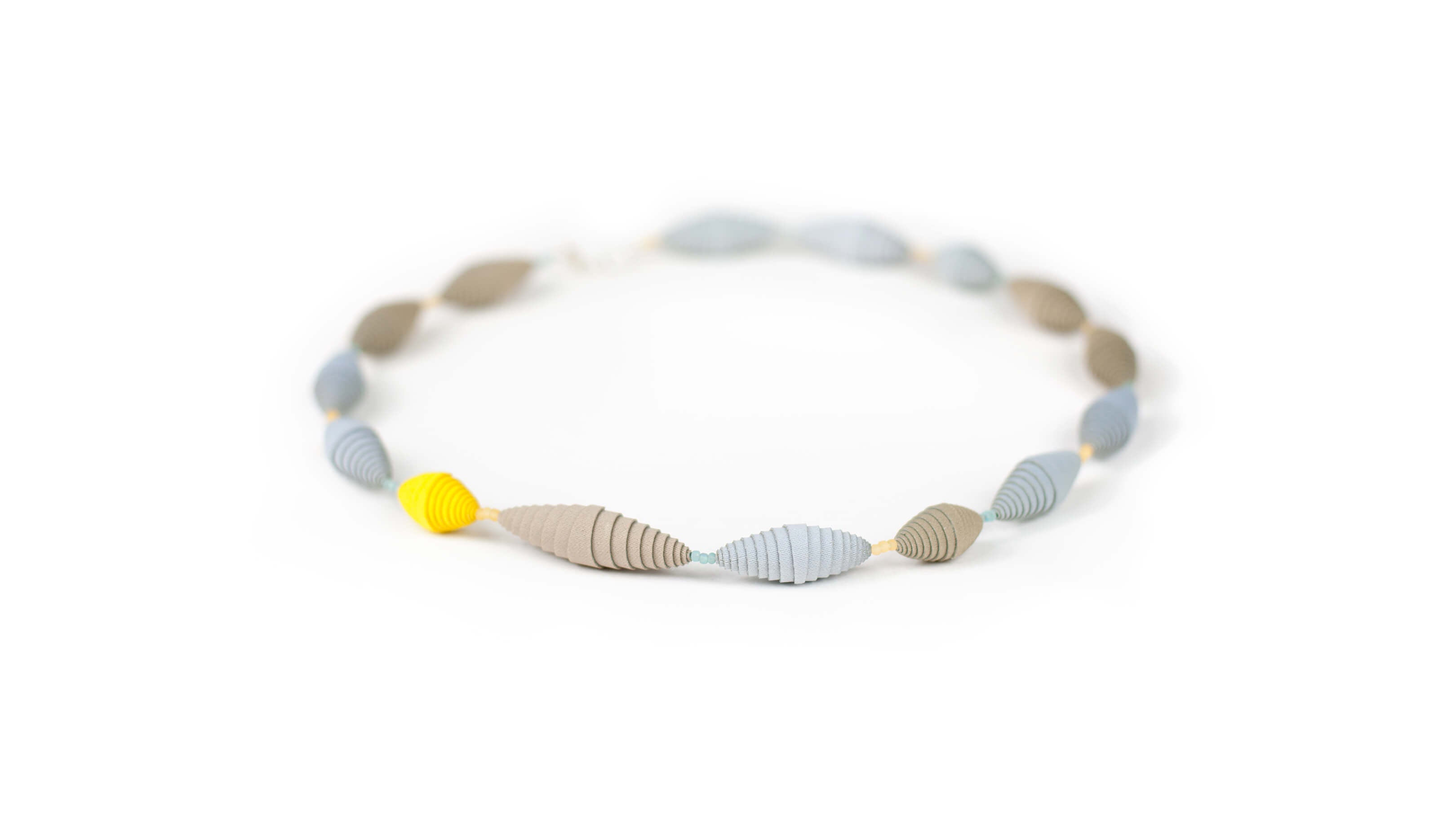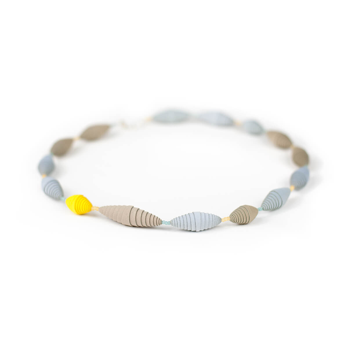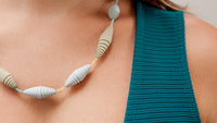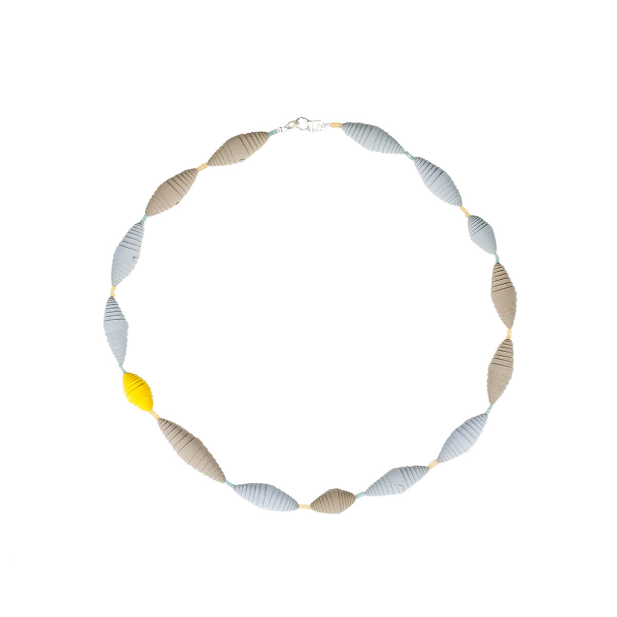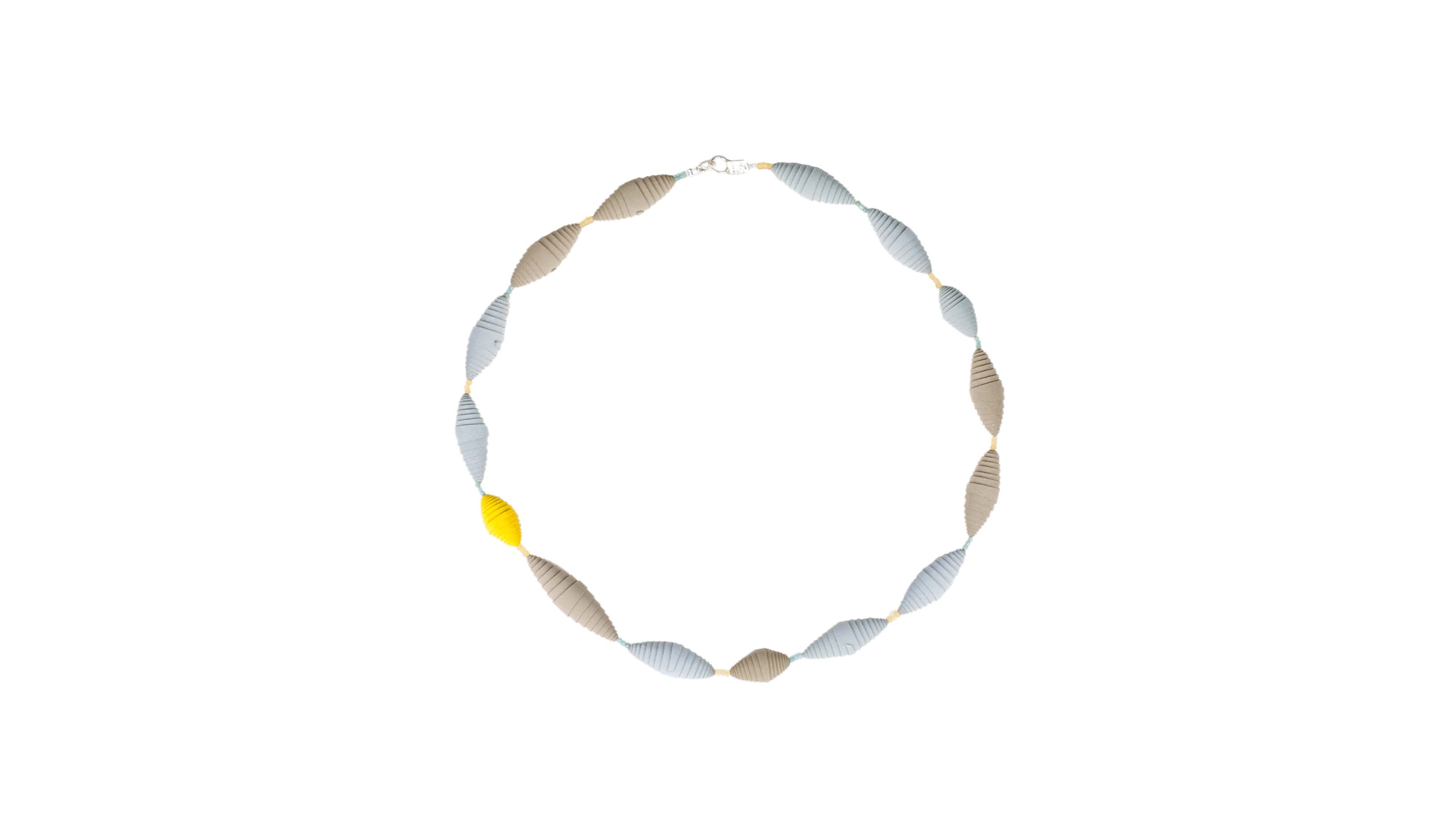 With unconventional materials, Diana Schimmel creates a bold and colorful interpretation of a classic beaded necklace. In her Bicho Canasto Necklace, brightly-hued fabric is hand-rolled to form geometric beads for a dynamic piece of jewelry. The fabric beads are strung alongside small glass beads in complimenting colors for a unique necklace that conveys the wearer's appreciation for fashionable design. Recalling the culture of her homeland, Schimmel's designs incorporate craft and technology with exuberance. The designer was originally trained as an architect where she gained a new respect for materials and construction that continue to impact her work. Capturing the textural nature of the material, the Bicho Canasto Necklace is a stunning way to elevate any outfit.