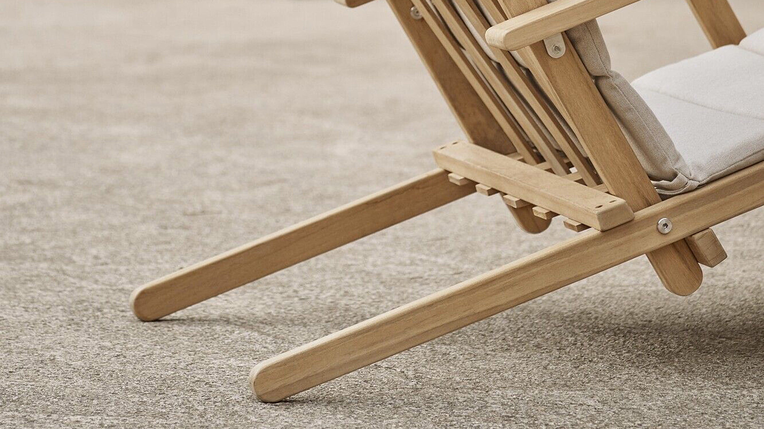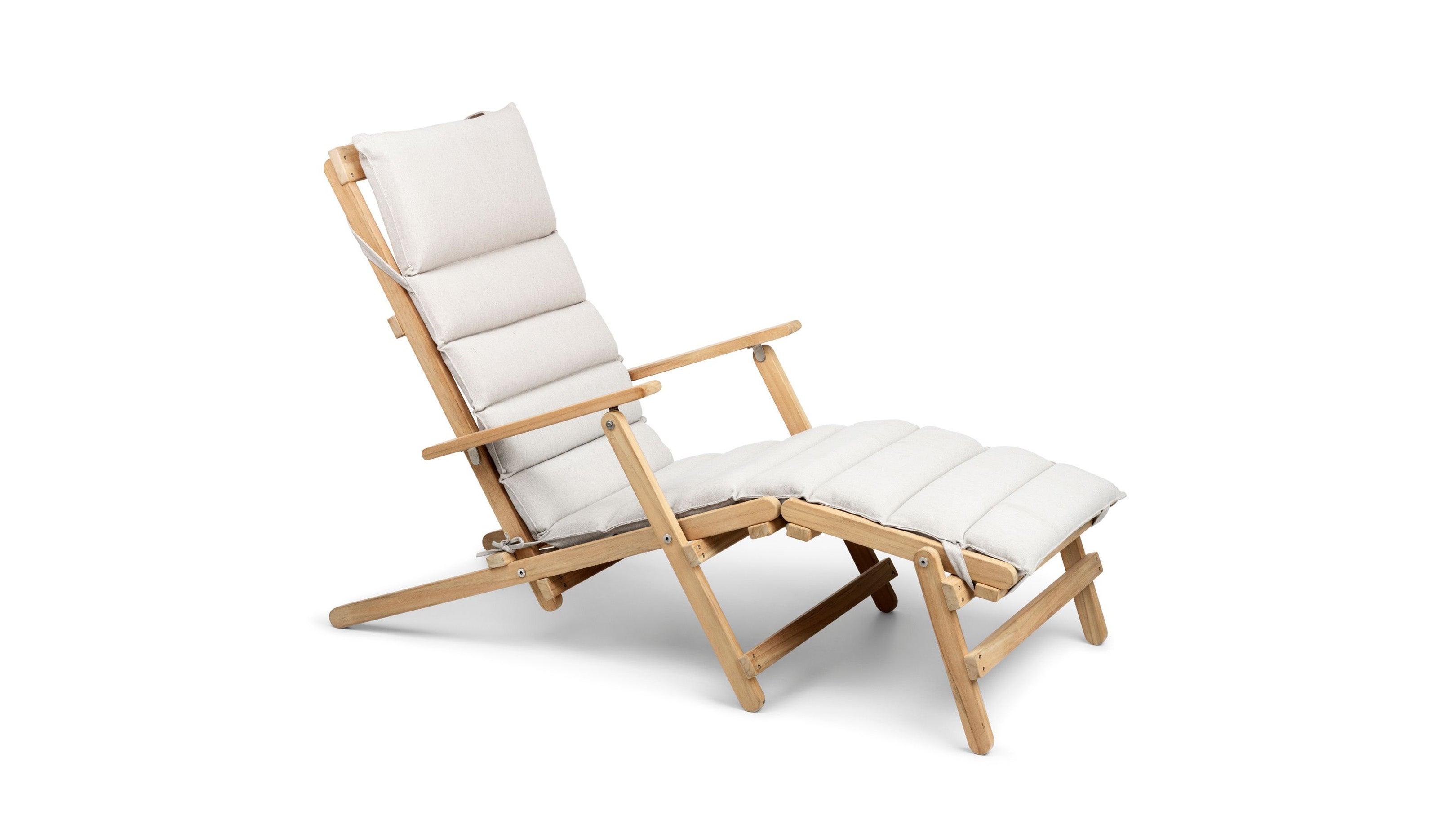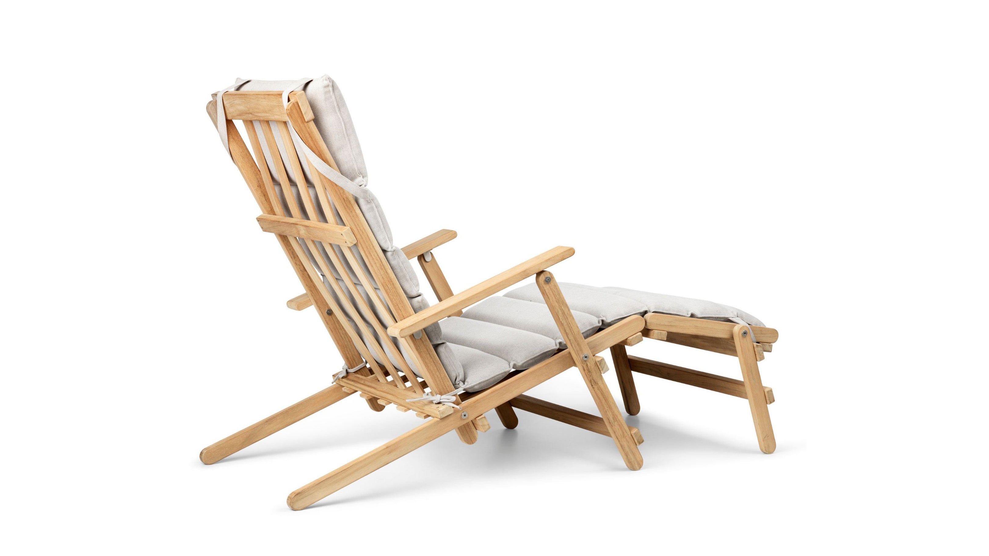 The BM5568 Deck Chair with Footrest and Cushion, designed by Børge Mogensen for Carl Hansen & Søn, epitomizes functional elegance for outdoor relaxation. Crafted from untreated, FSC®-certified teak, the chair and its accompanying footrest feature slatted designs that naturally conform to the body's contours, ensuring optimal comfort. The addition of a padded cushion, upholstered in weather-resistant Sunbrella fabric, enhances the seating experience. Both the chair and footrest are foldable for convenient storage, making them versatile additions to any outdoor space.