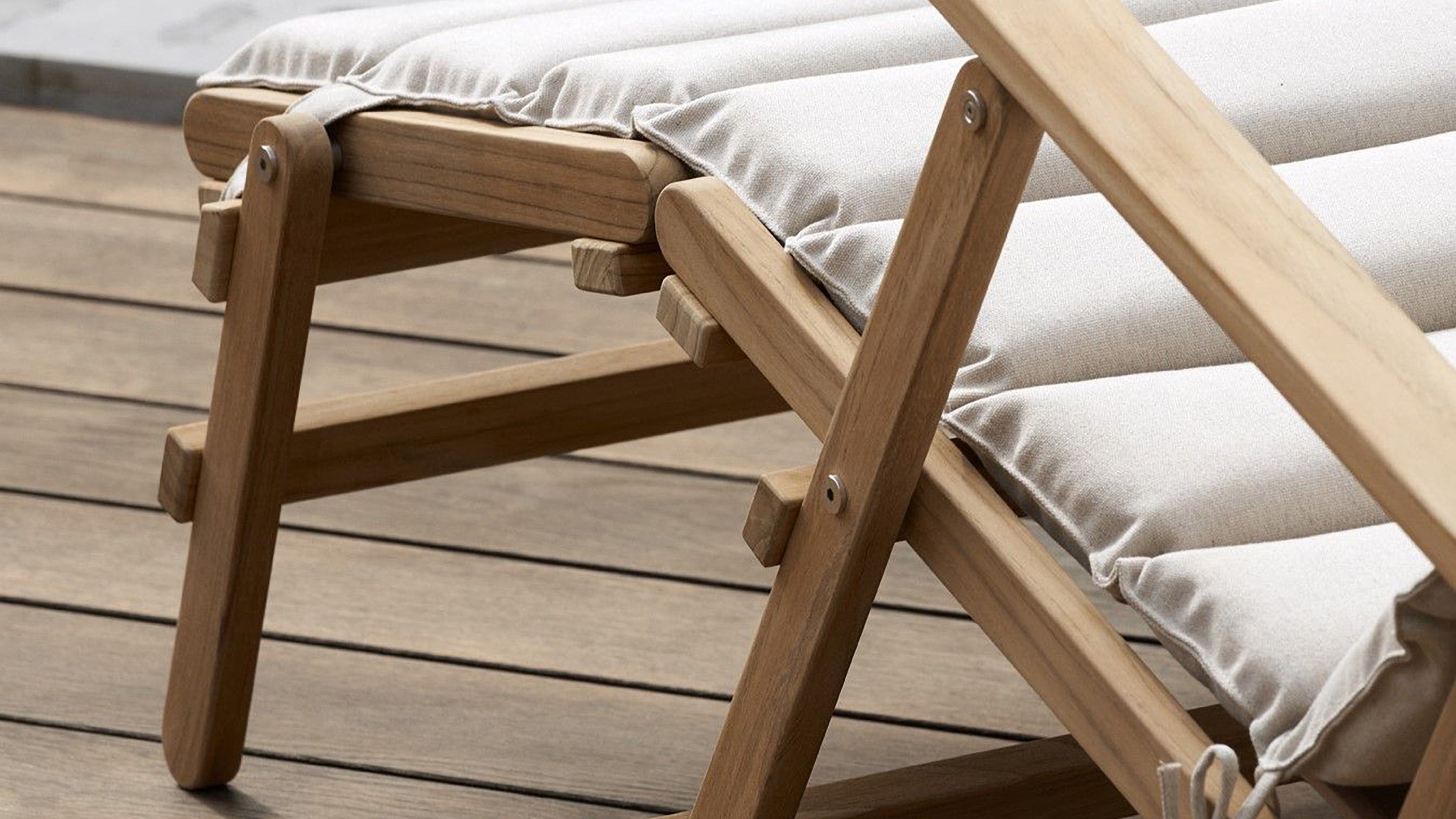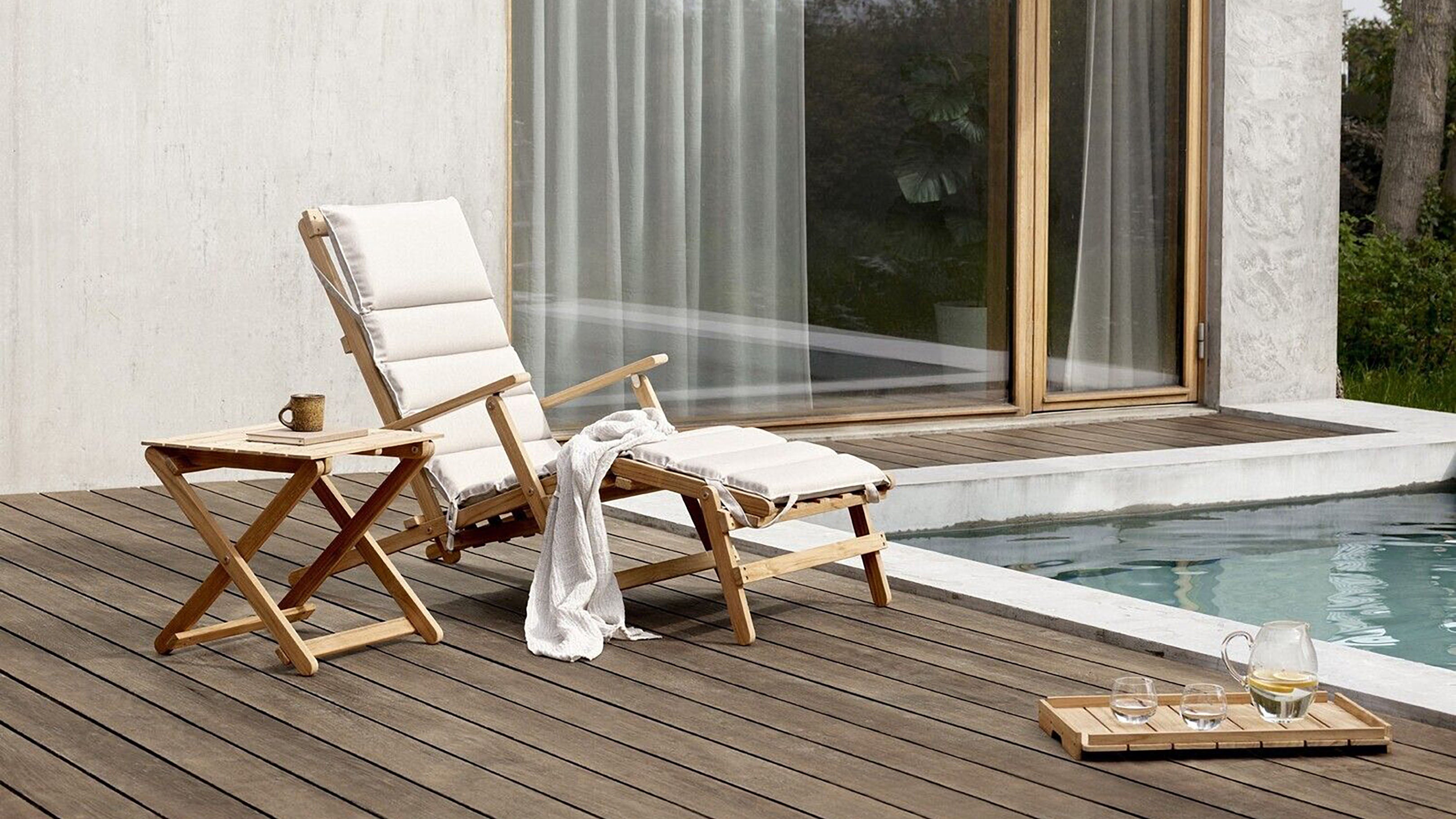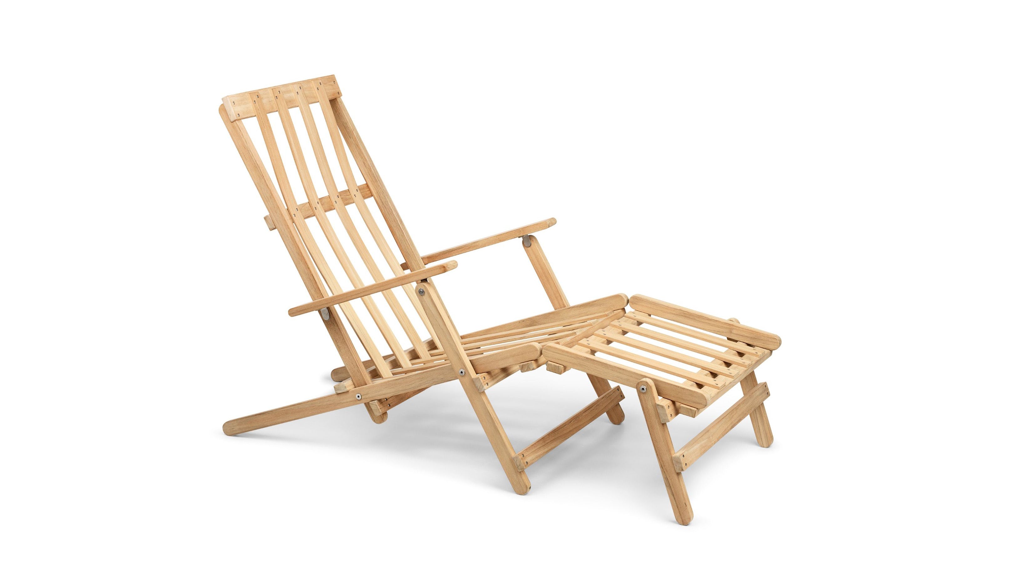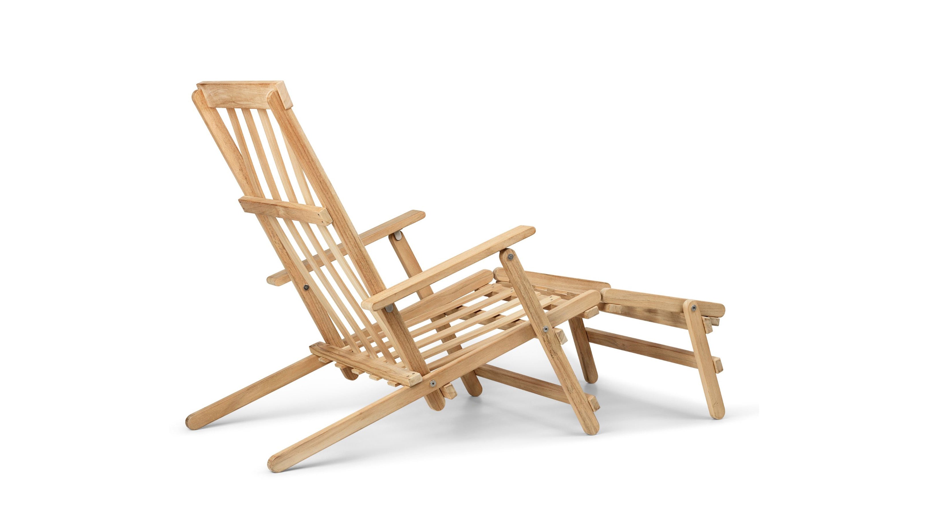 The BM5568 Deck Chair with Footrest and Cushion, designed by Børge Mogensen for Carl Hansen & Søn, epitomizes functional elegance for outdoor relaxation. Crafted from untreated, FSC®-certified teak, the chair and its accompanying footrest feature slatted designs that naturally conform to the body's contours, ensuring optimal comfort. The addition of a padded cushion, upholstered in weather-resistant Sunbrella fabric, enhances the seating experience. Both the chair and footrest are foldable for convenient storage, making them versatile additions to any outdoor space.