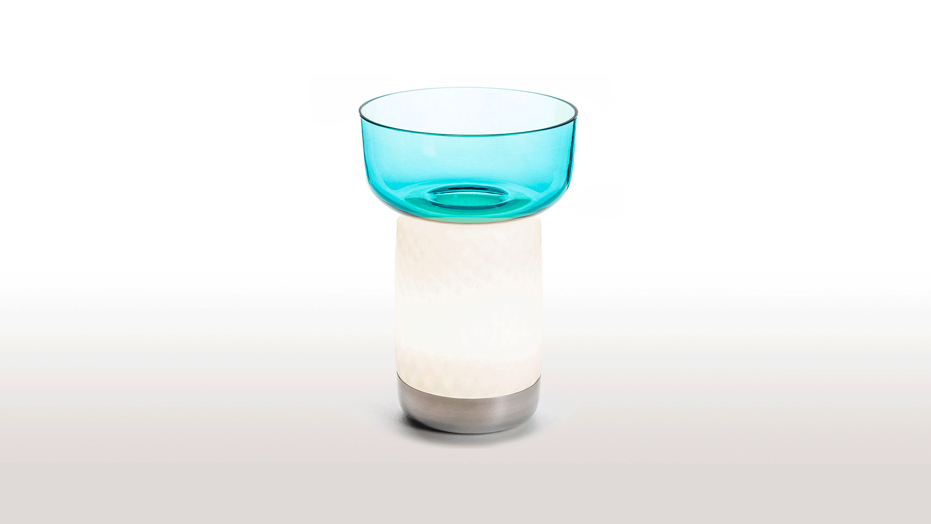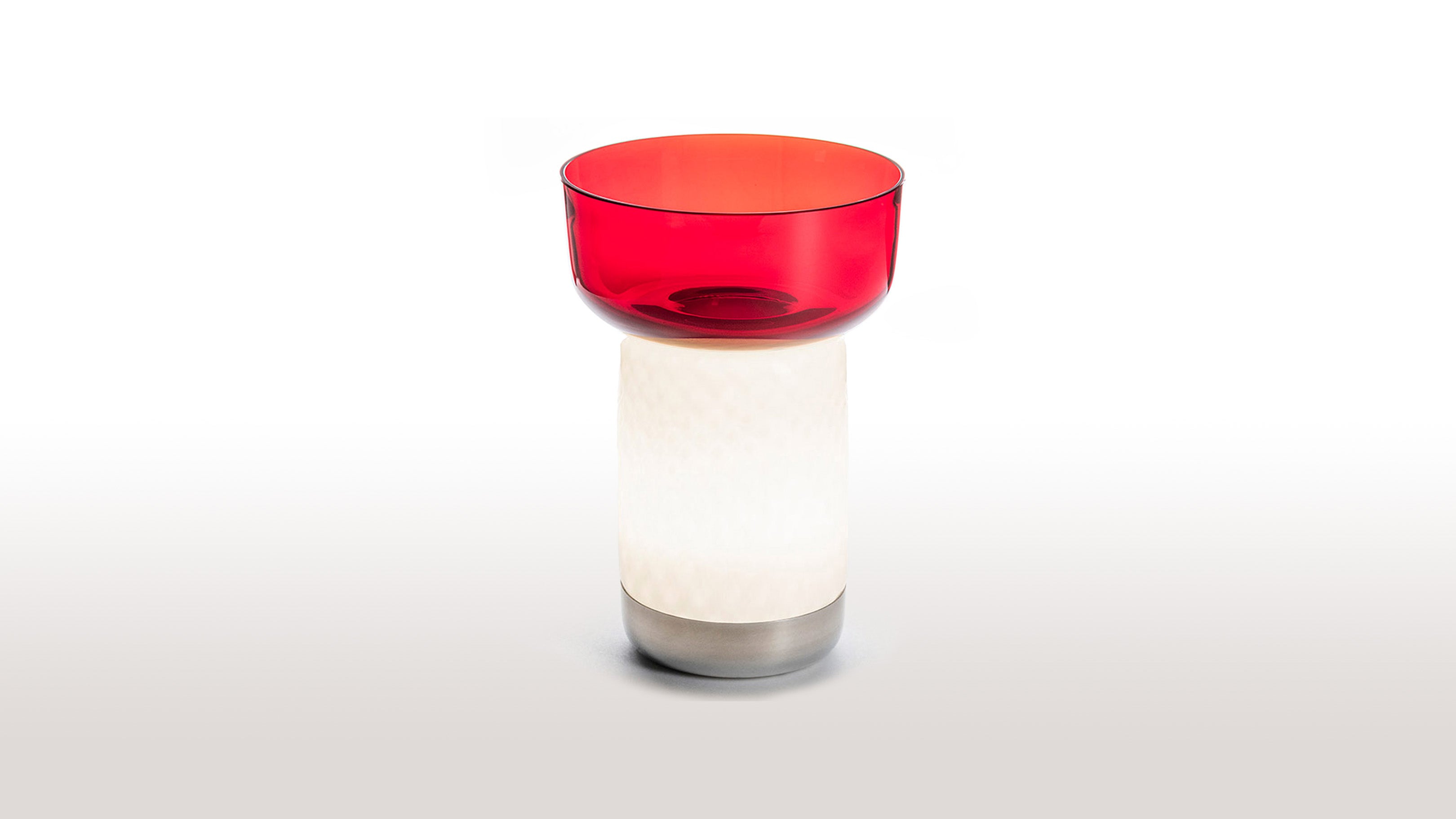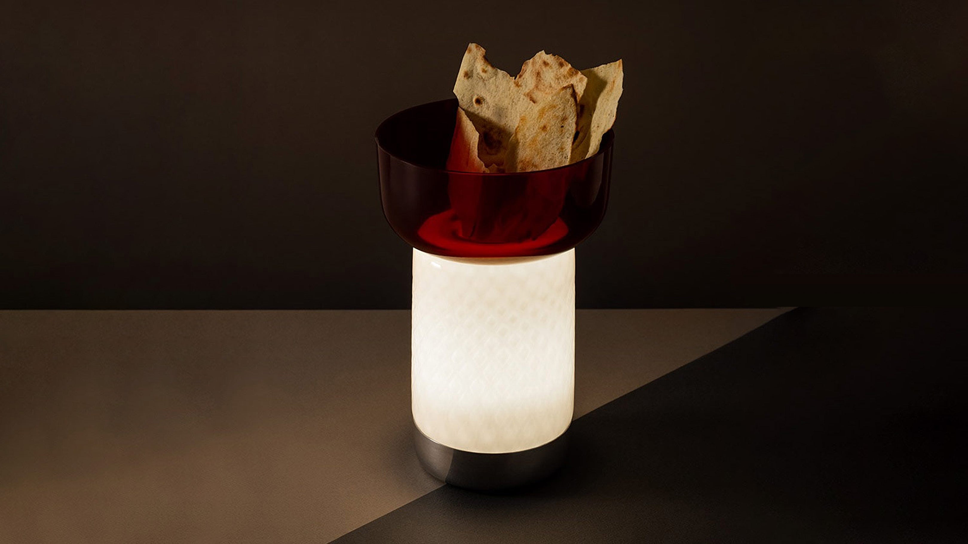 The Artemide Bontà Lamp, designed by Attila Veress and Davide Oldani, beautifully merges light with the art of sharing food. This portable lamp, crafted from white textured milk glass, softly diffuses light to create a warm and inviting atmosphere. Its innovative design includes an upper recess that holds a glass bowl for sharing food, which can be alternated with taller or wider bowls. Handcrafted from glass, both the bowls and the lamp become unique, one-of-a-kind pieces that interact harmoniously with light and food, blurring the boundaries between them. Perfect for enhancing convivial moments, the Bontà Lamp adds elegance and warmth to any table setting.