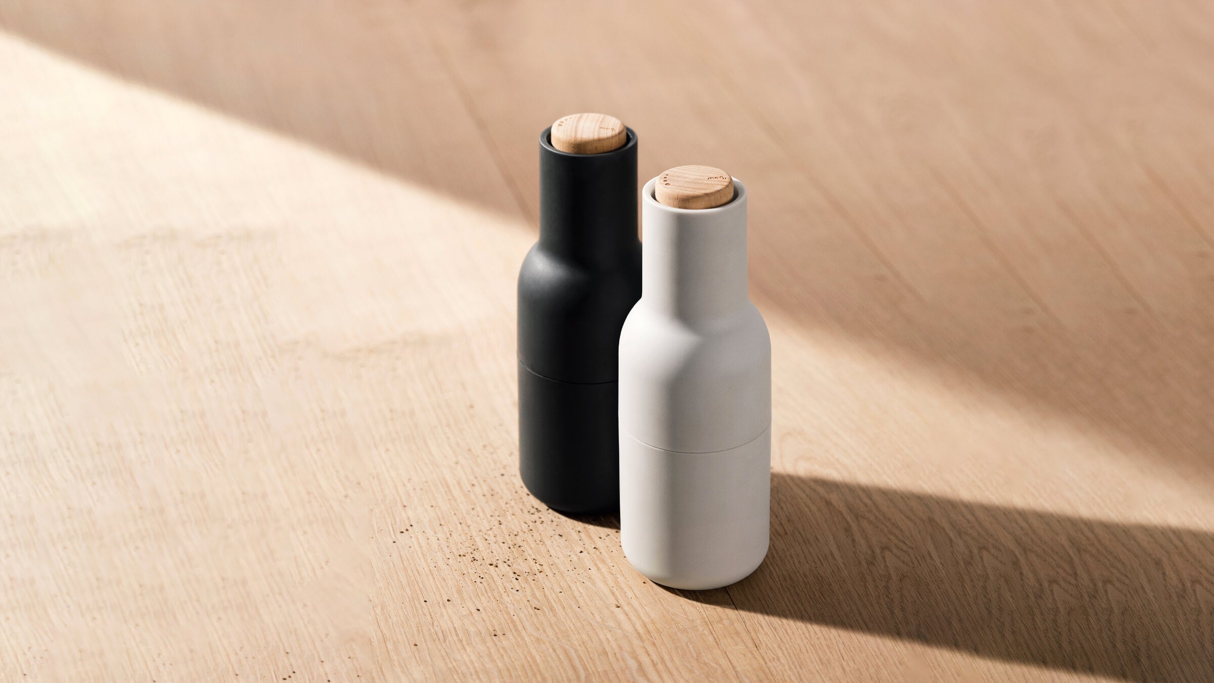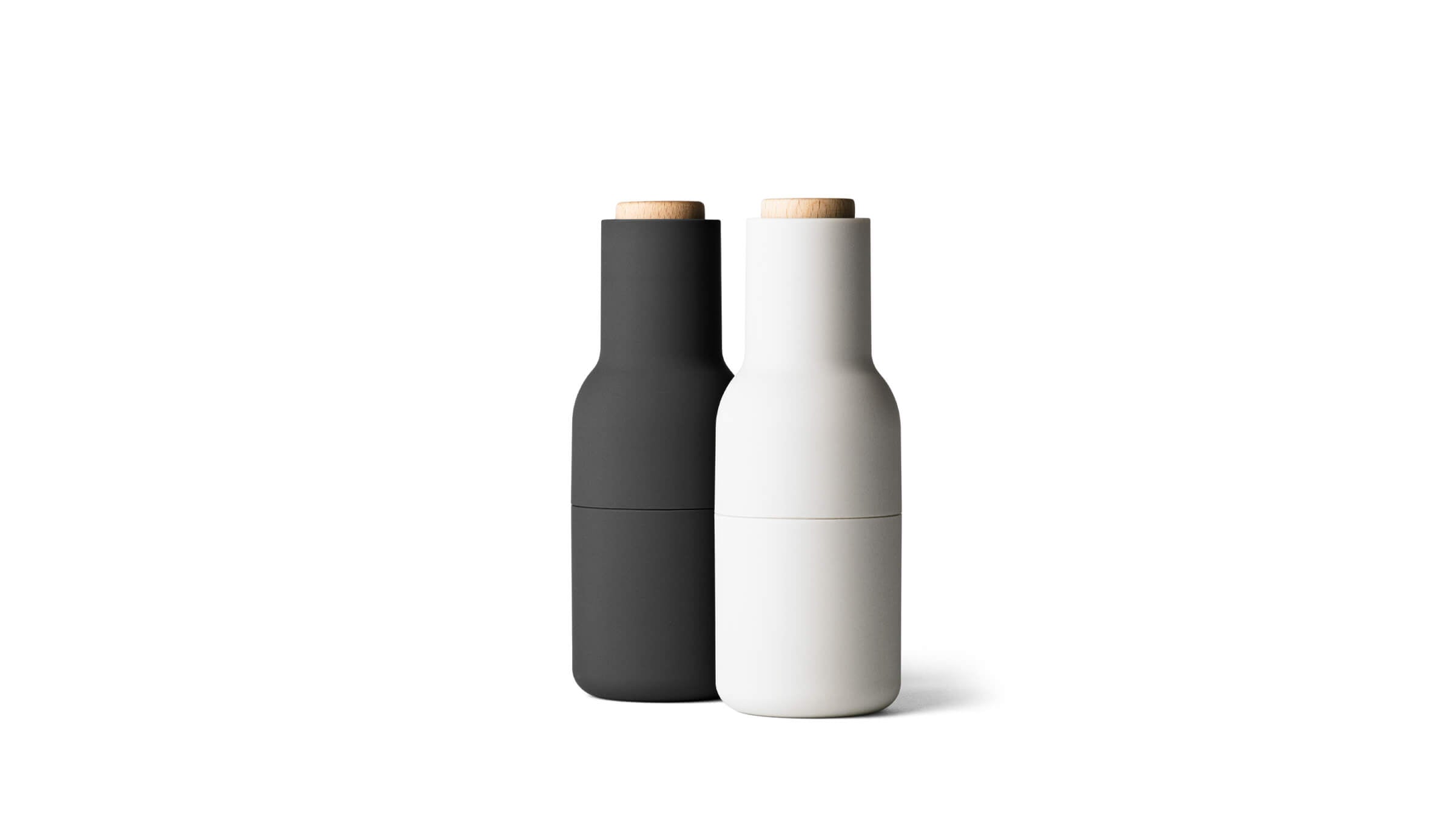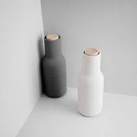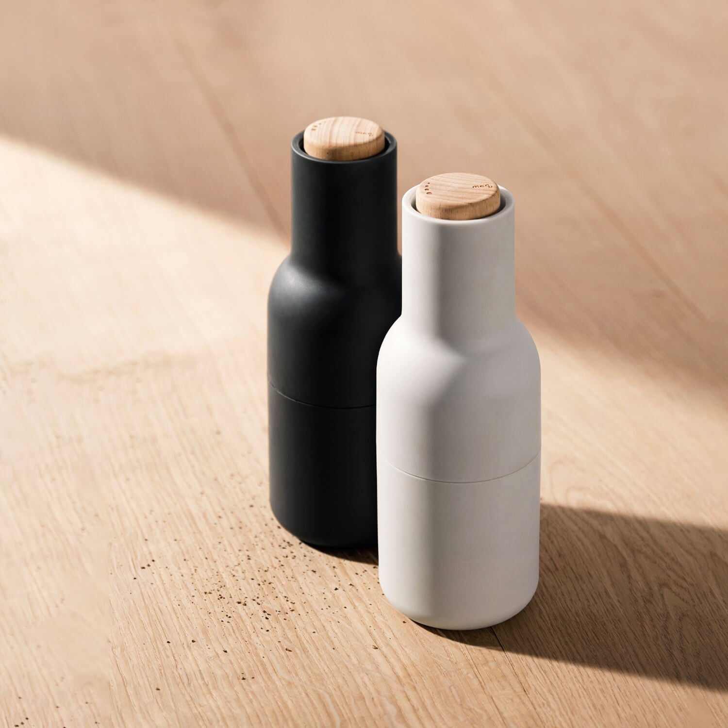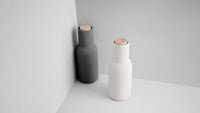 The minimal grinder form is universal, but with the Bottle Grinder, Norm has turned it on its head: the ceramic salt or pepper grinder is located on the top and does not spill on the table. The Scandinavian design references the archetypal form of a water bottle.