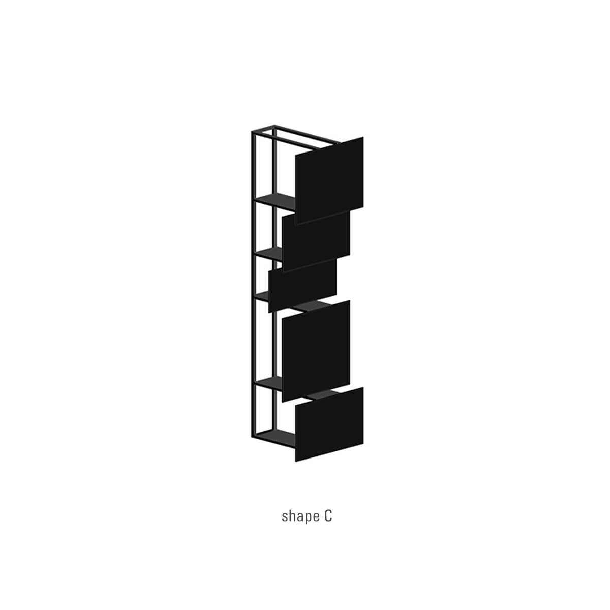 • Bookcase made of vertical modules composed by 5 panels of different sizes and depth with supporting frame in square section tubular steel