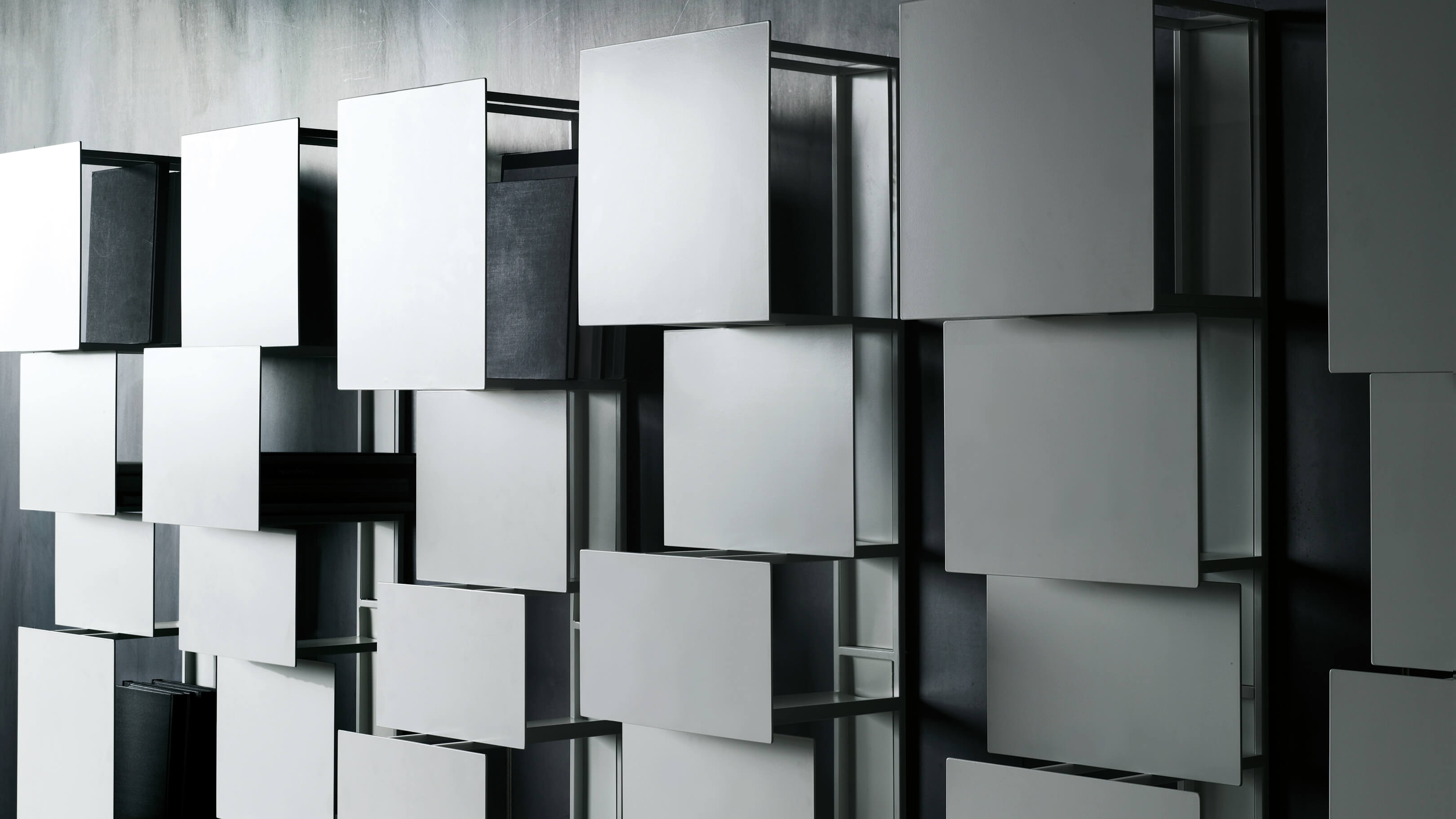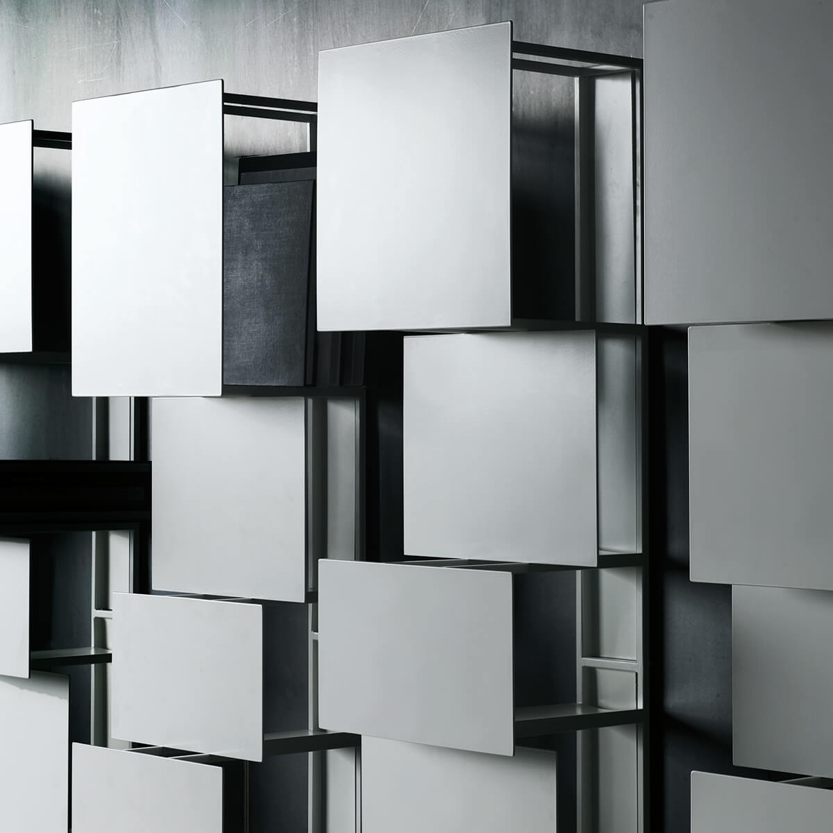 Dynamic as well as avant garde, the bookcase features a series of steel shelves with painted fronts that looks like drawers of different depths coming out of the face of the wall. In each vertical unit, five panels of different dimensions and depths serves as end caps for the book storage which is accessible from each side.
