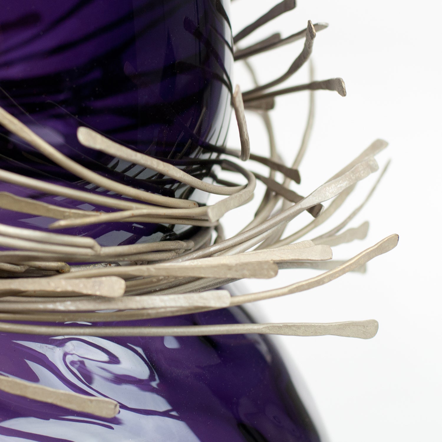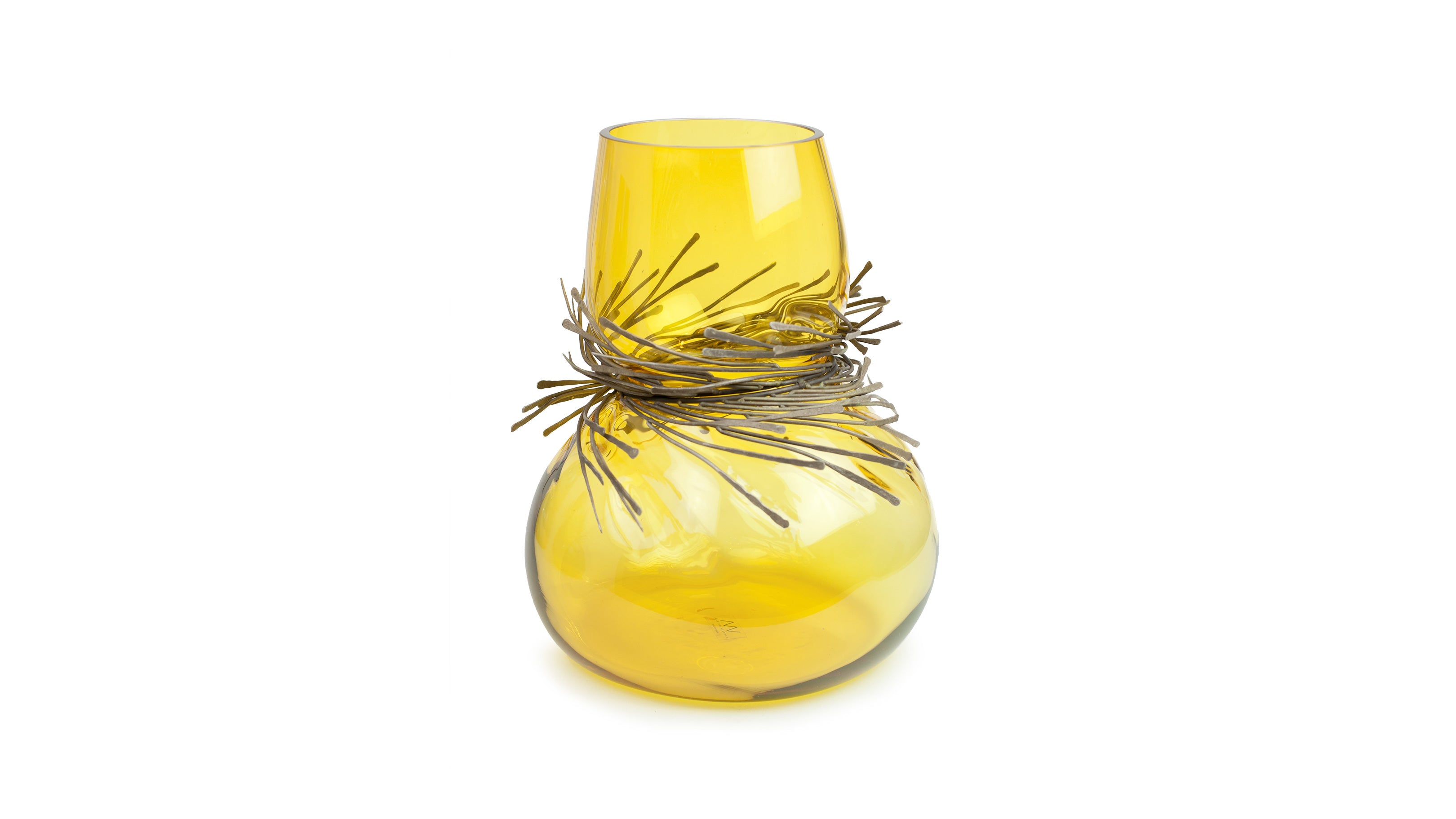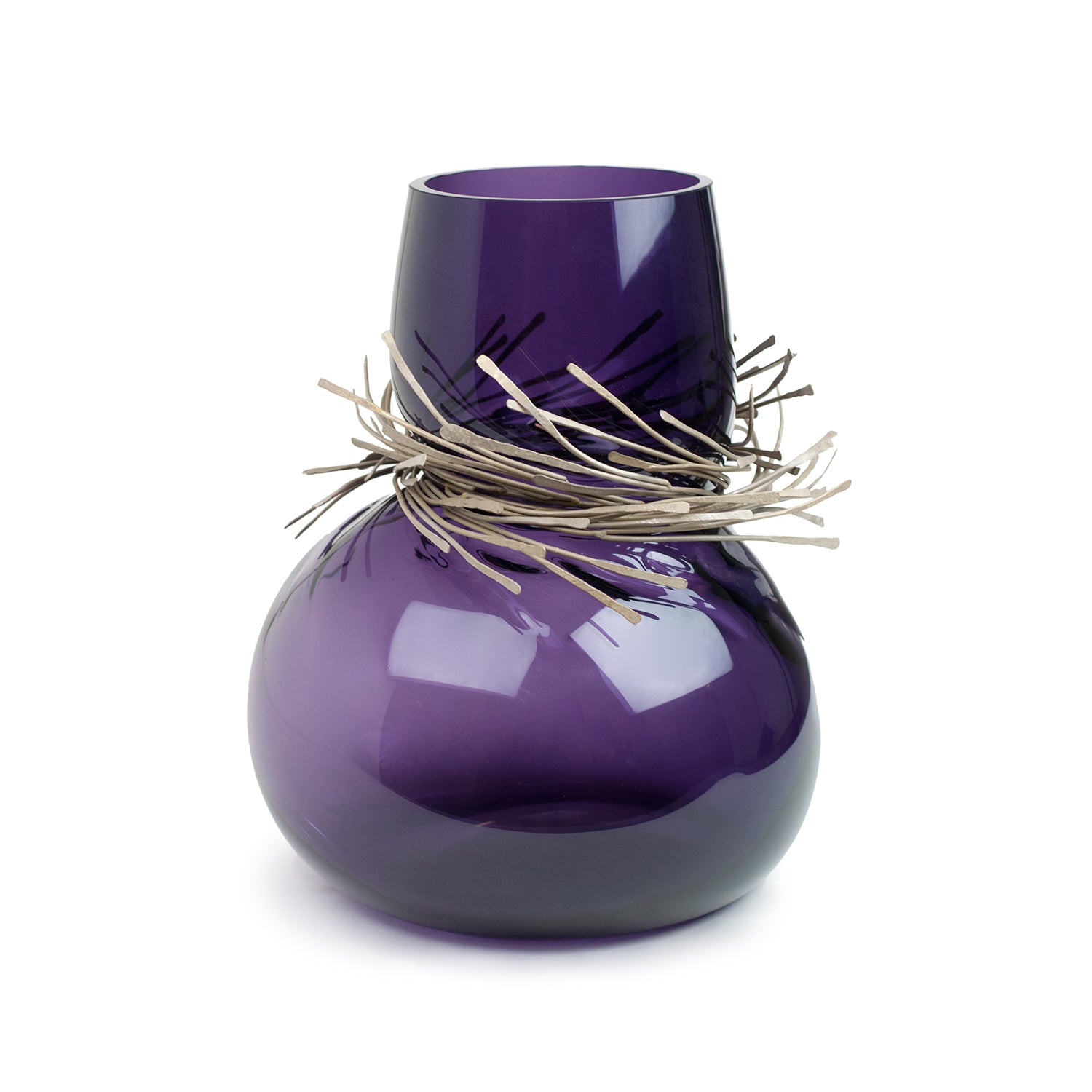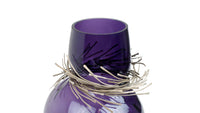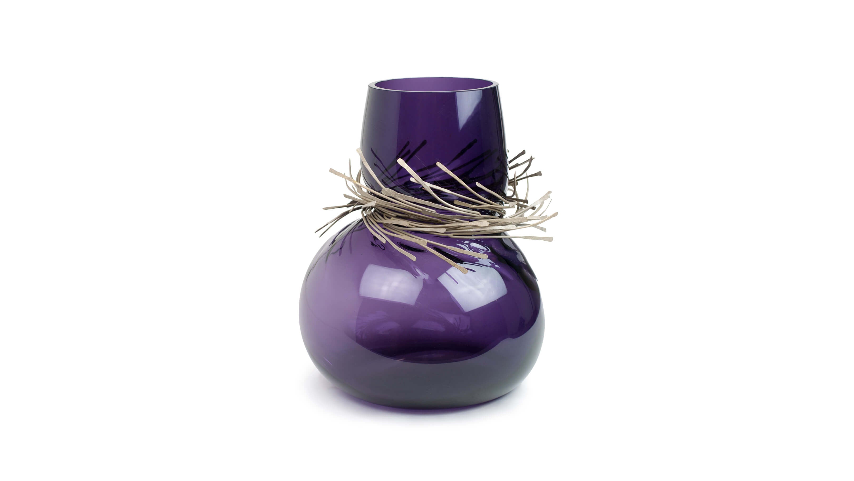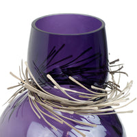 Wisps of sculpted metal envelope the neck of Vanessa Mitrani's Cabaret vase to create a stunning glass art object for display in the home. The sinuous and organic form of the glass is juxtaposed by the array of metal bands resulting in an interesting and unique piece of glass sculpture.