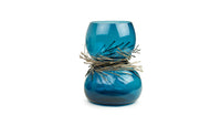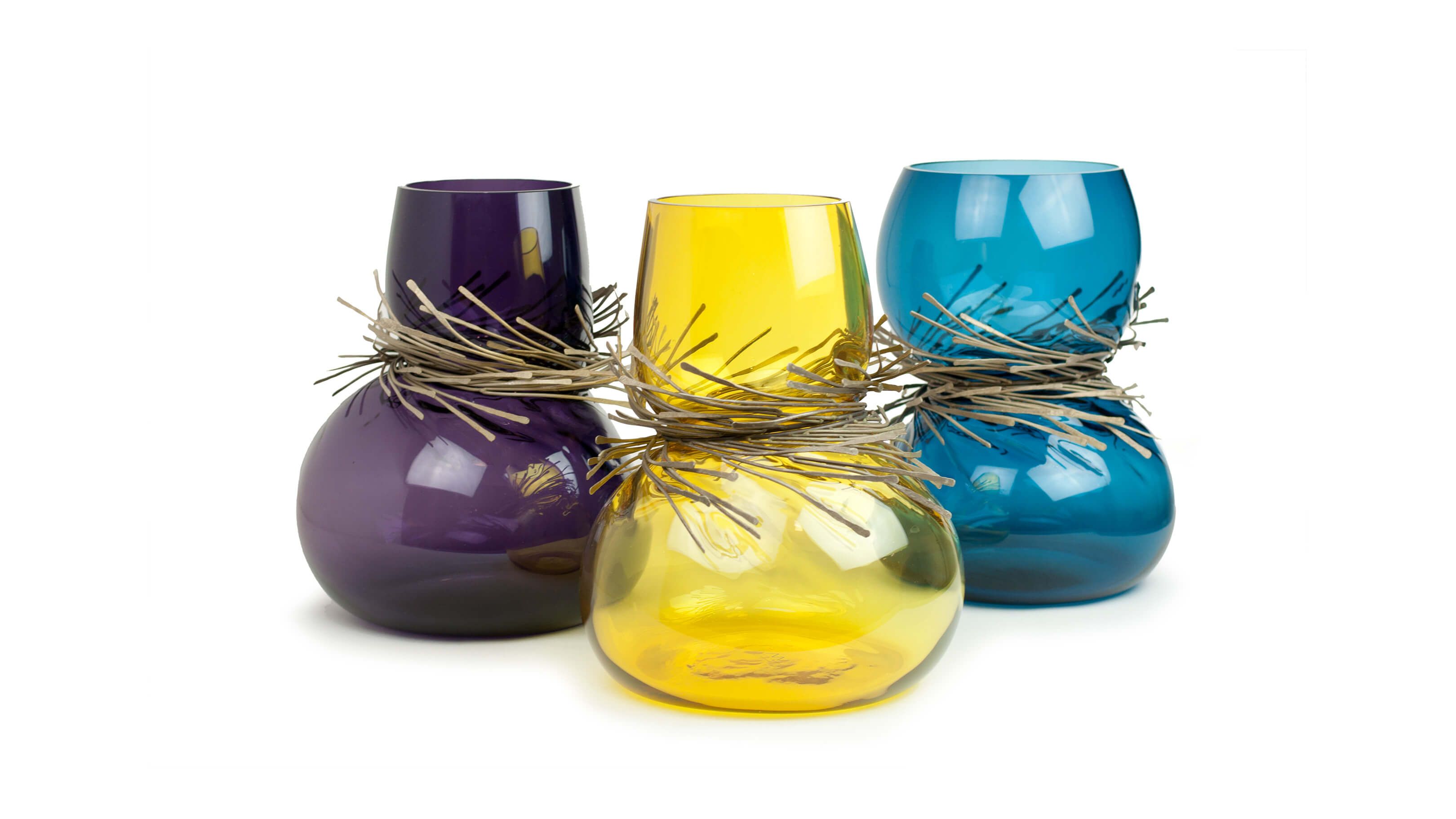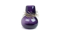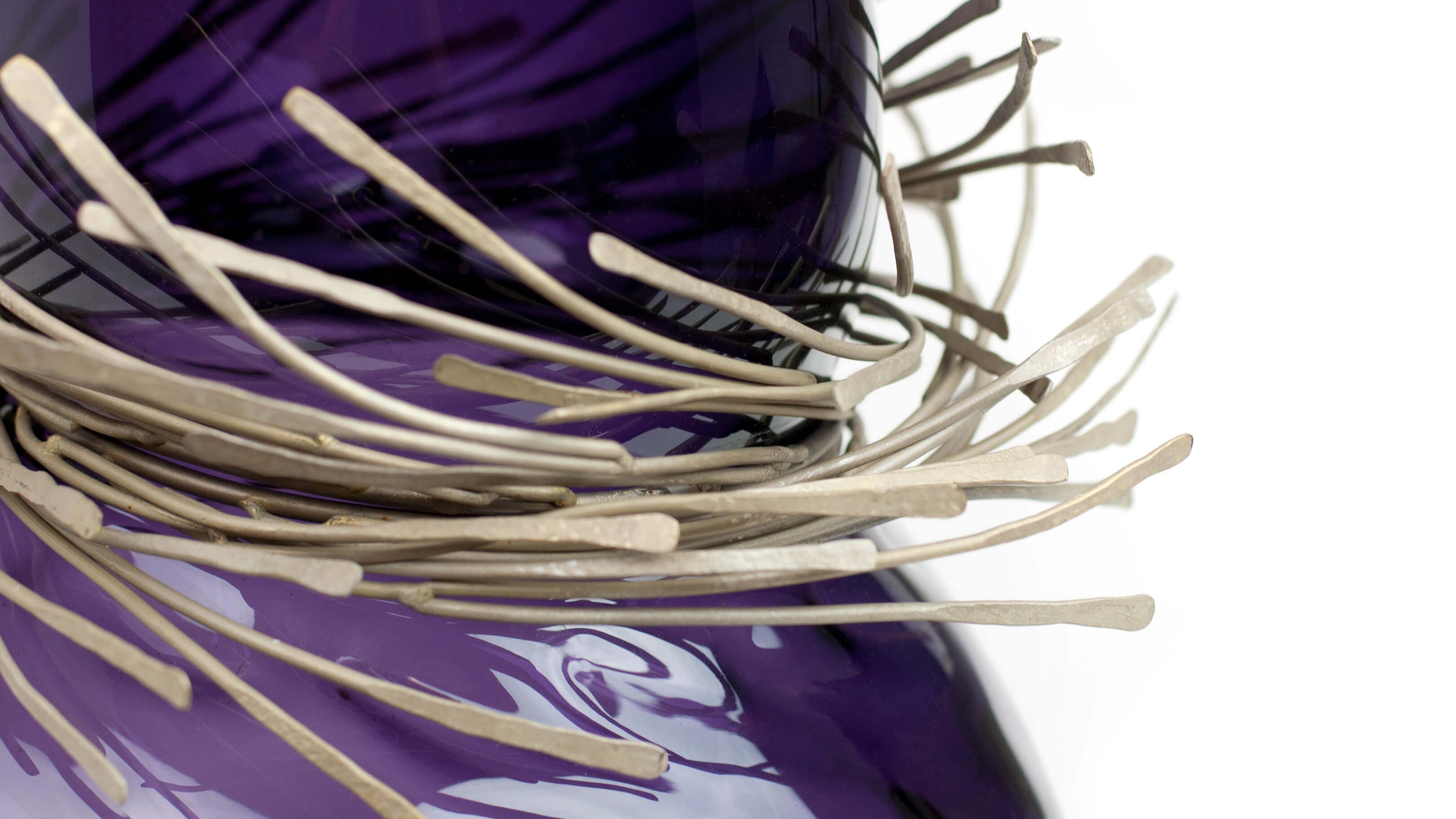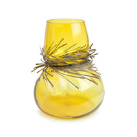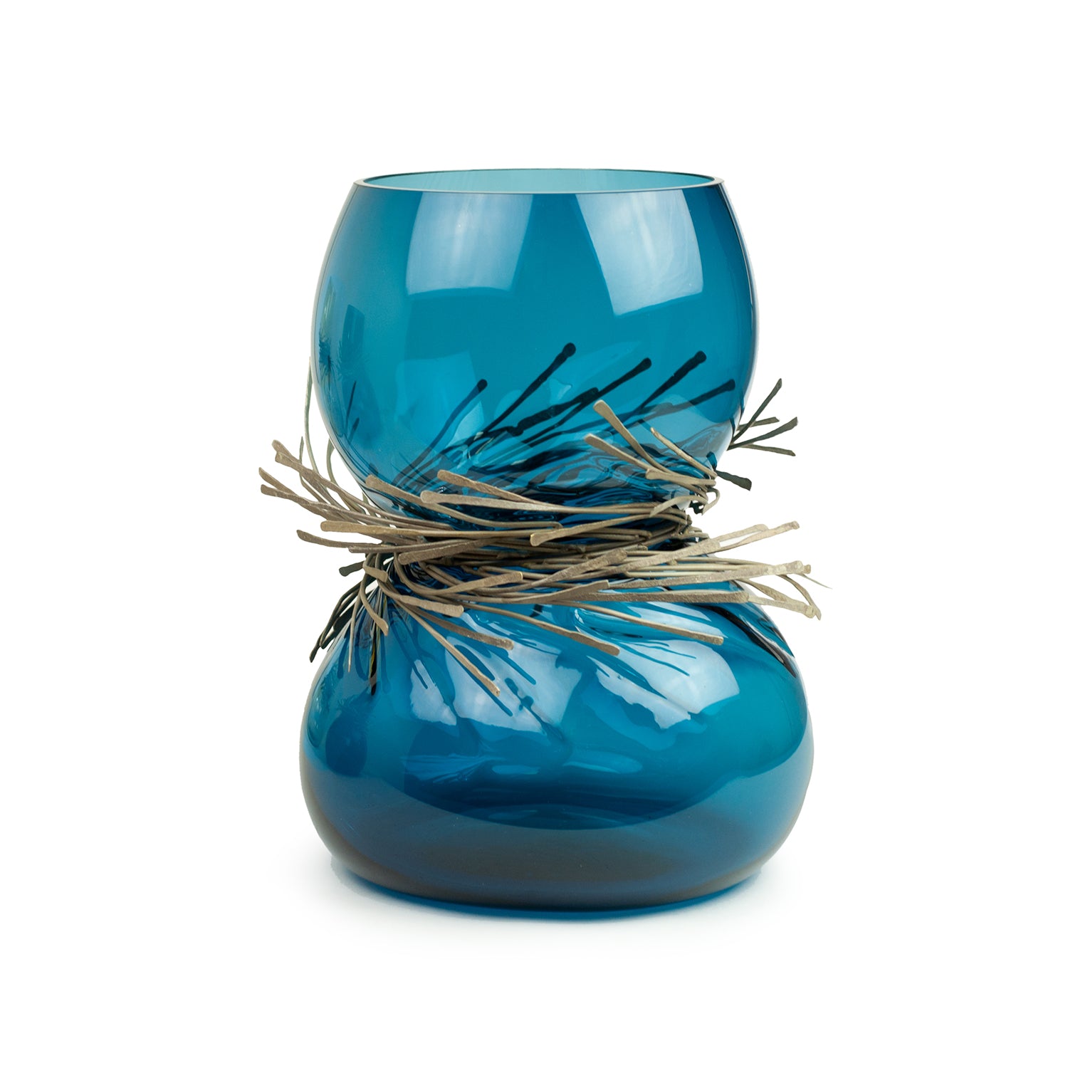 Wisps of sculpted metal envelope the neck of Vanessa Mitrani's Cabaret vase to create a stunning glass art object for display in the home. The sinuous and organic form of the glass is juxtaposed by the array of metal bands resulting in an interesting and unique piece of glass sculpture.