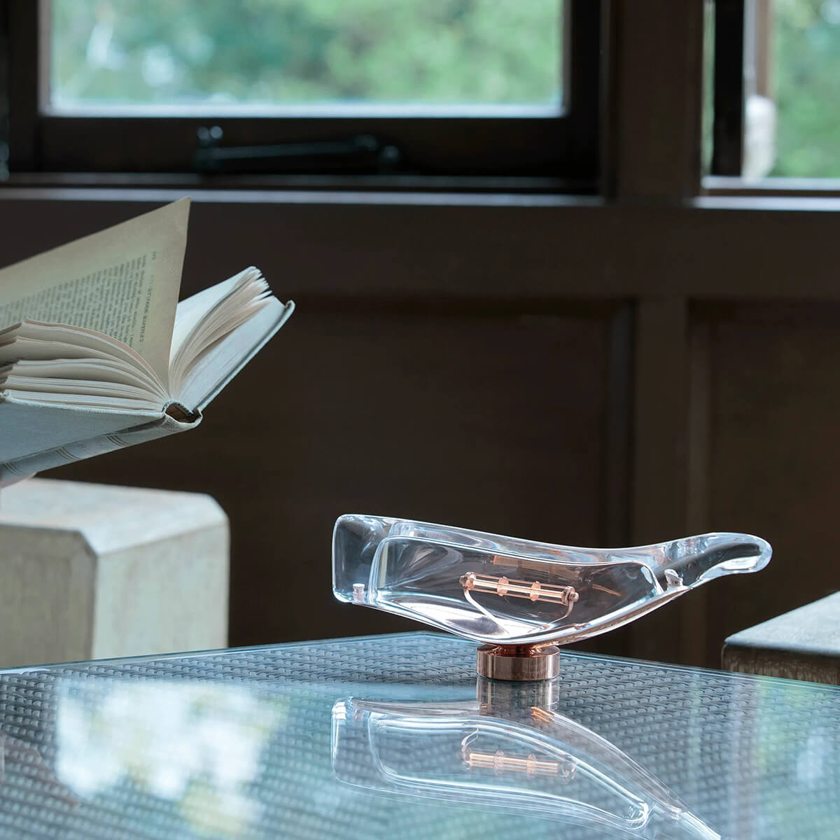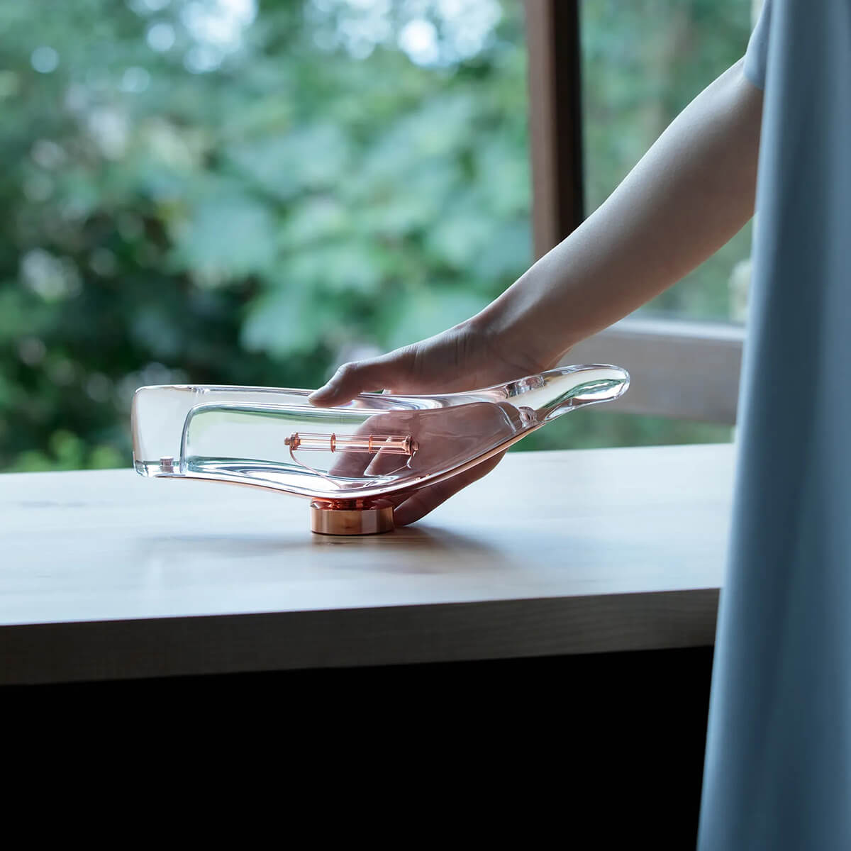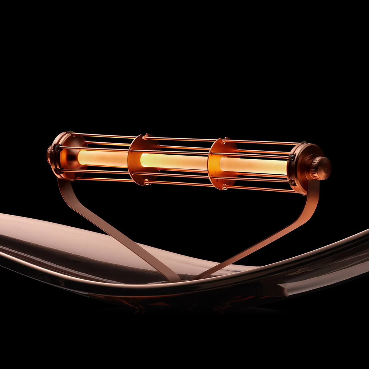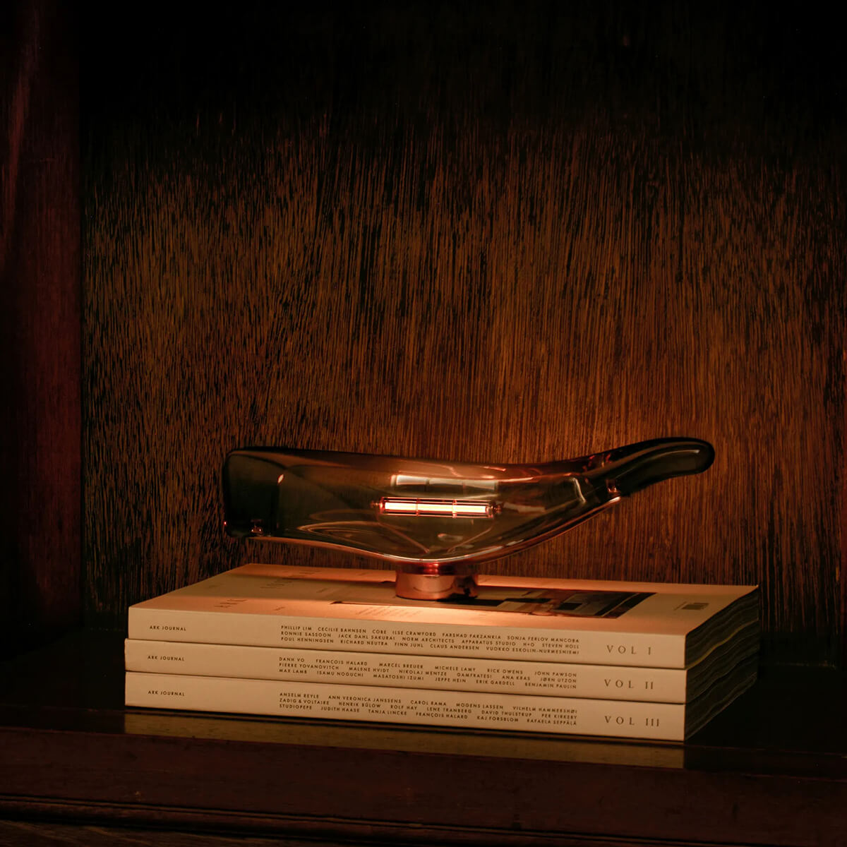 Portable, wireless, and rechargeable, these lamps appear restful and elegant sitting charmingly on a bedside table, on a bookshelf, to accompany a blissful meal at the dining table, or resting contentedly wherever a tender light is welcomed. With a base made of die-cast zinc with a warm copper finish, and a shade made of enduring acrylic in clear or dark grey, the Cachalot is visually arresting and emotionally comforting, an inviting addition to any room where sensuous congeniality meets modern charm.