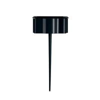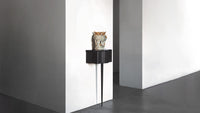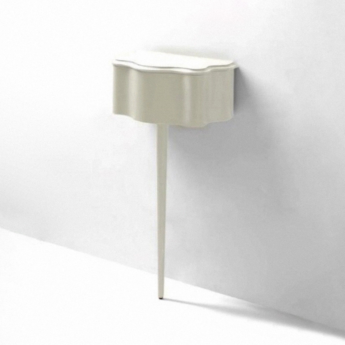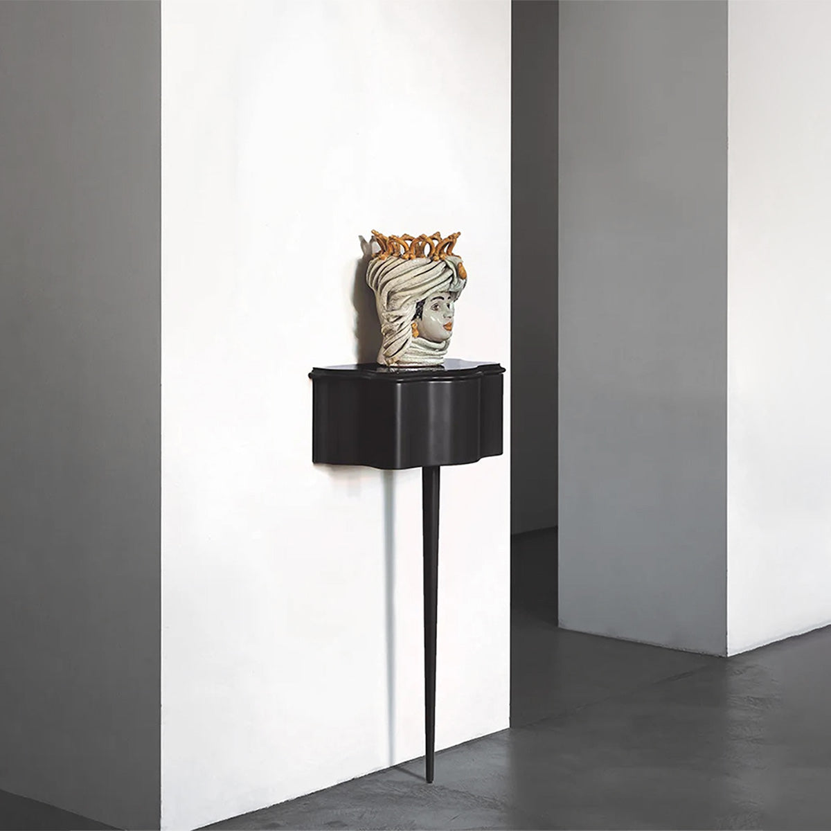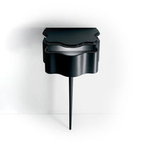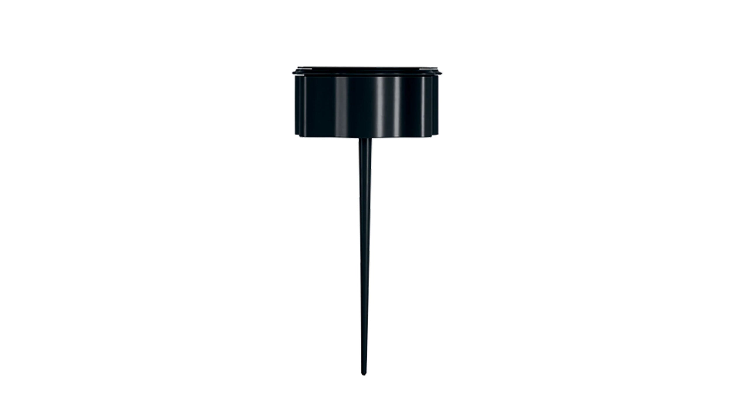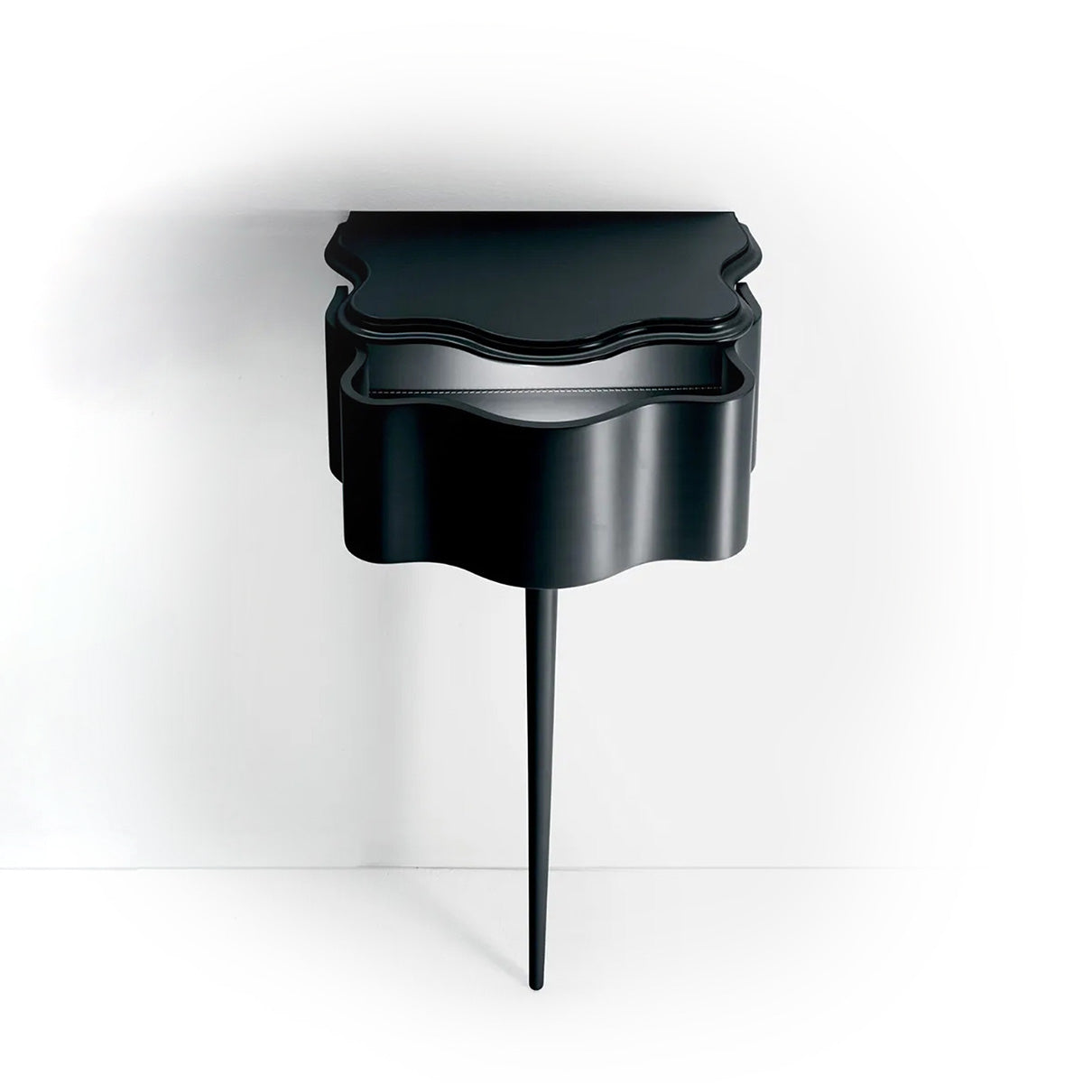 The Carlino CM Service Storage Unit features a sleek design crafted from solid wood with a black or talc lacquered finish, balanced elegantly on a single tapered leg. Its drawer glides smoothly along an internal wooden track and includes a leather-lined base for a touch of refinement. The tabletop is made from back-painted glass, offered in matching black or talc tones for a cohesive, minimalist look.
