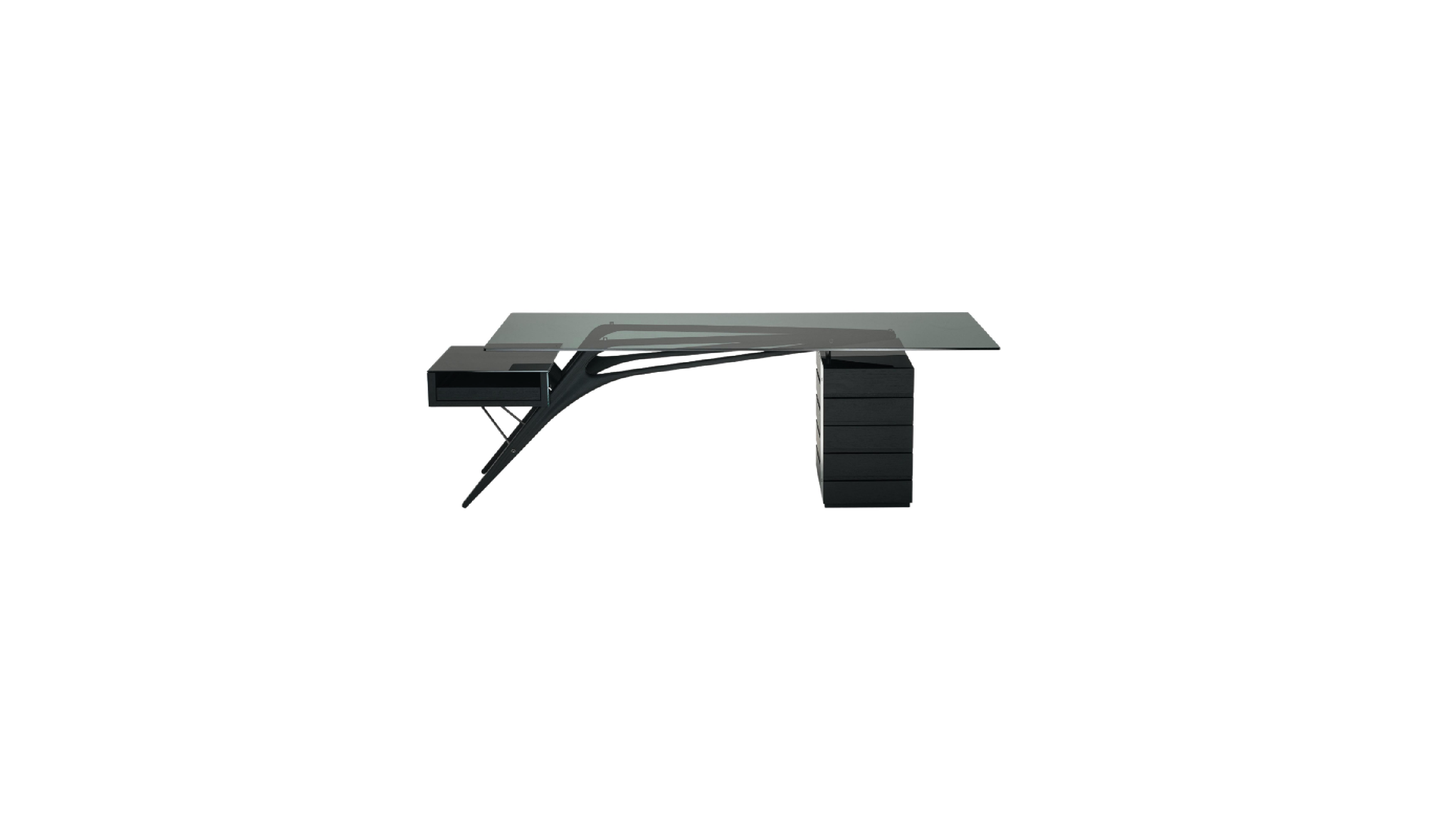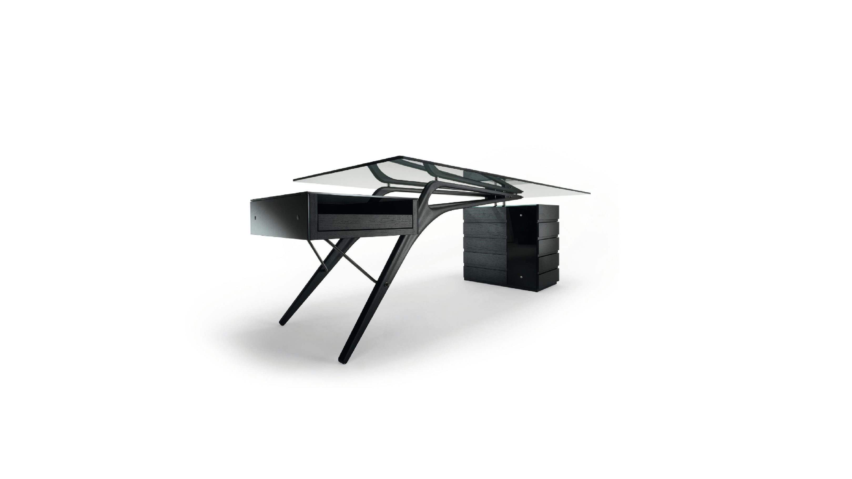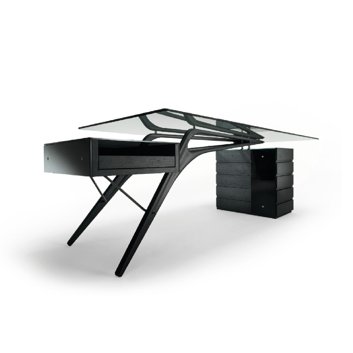 Cavour is an exquisite home-office desk, born from extensive research on the perfect structural shape, inspired by Carlo Mollino's work at the ski station. The desk flawlessly combines organic and dynamic lines in the structure with the clean and static volumes of the storage compartment and chest of drawers, creating a perfect balance between contrasting elements.