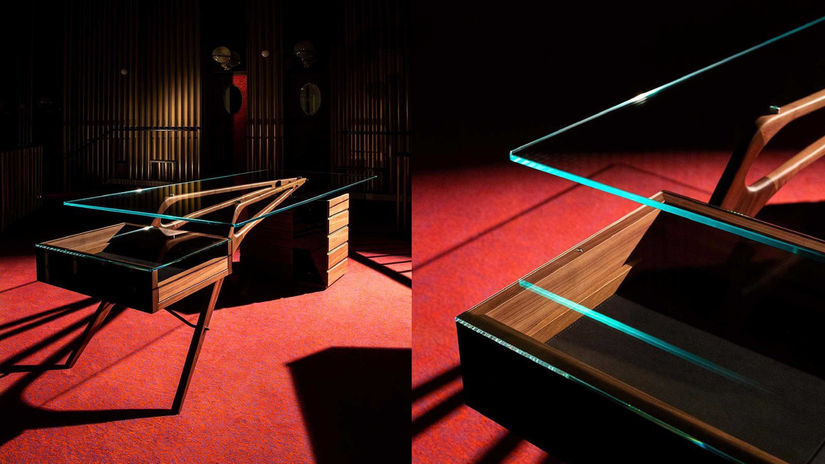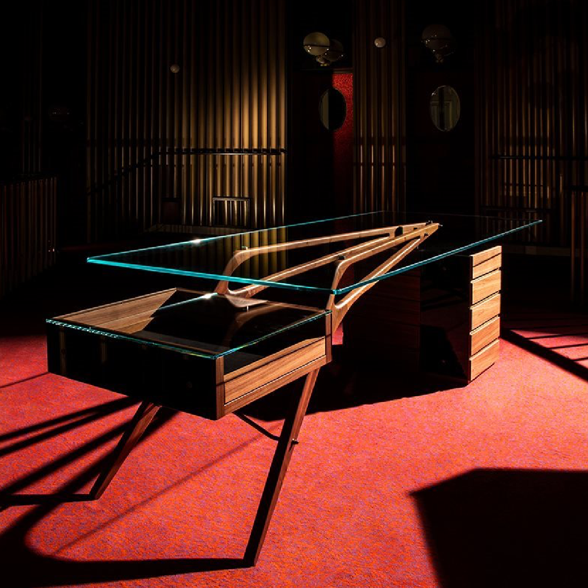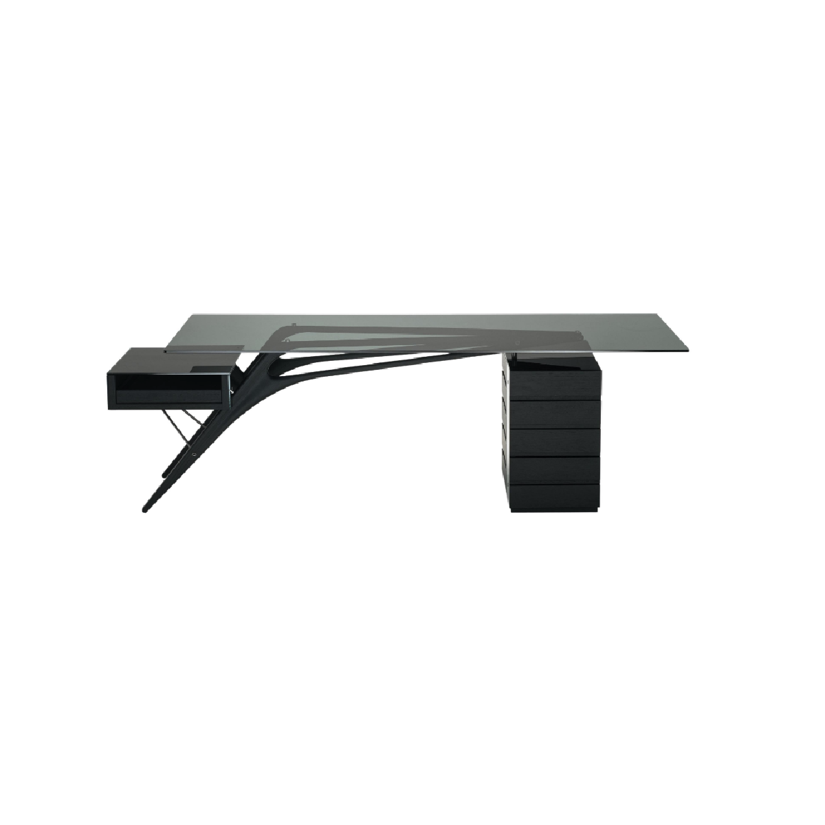 Cavour is an exquisite home-office desk, born from extensive research on the perfect structural shape, inspired by Carlo Mollino's work at the ski station. The desk flawlessly combines organic and dynamic lines in the structure with the clean and static volumes of the storage compartment and chest of drawers, creating a perfect balance between contrasting elements.