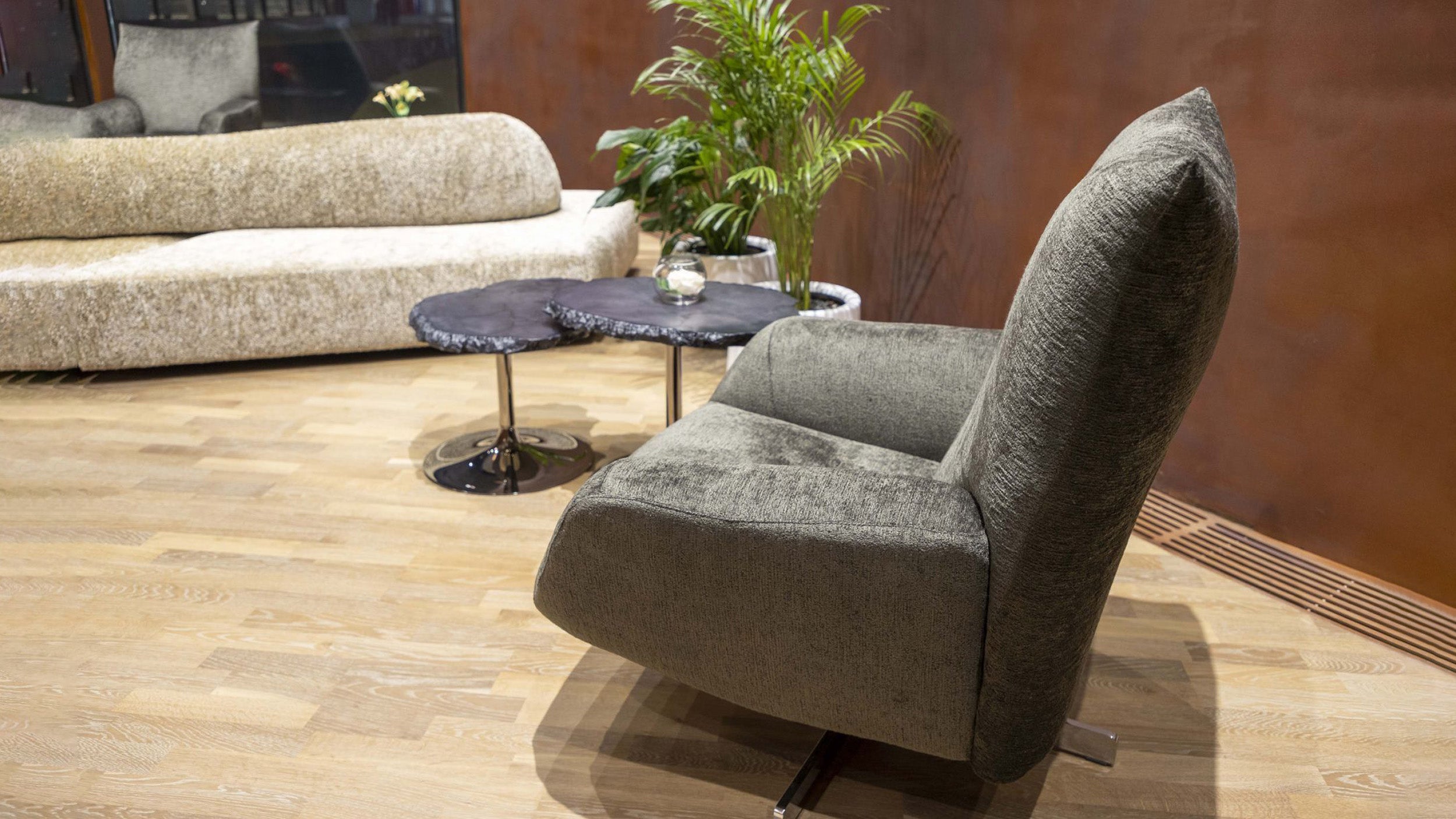 Crafted with a tubular steel and extrusions structure, this chair is both sturdy and durable. The pedestal that enables the swivel system is made of brushed and finished glossy chrome-plated nickel, giving it a sleek and modern look.