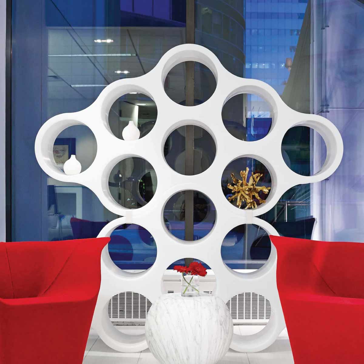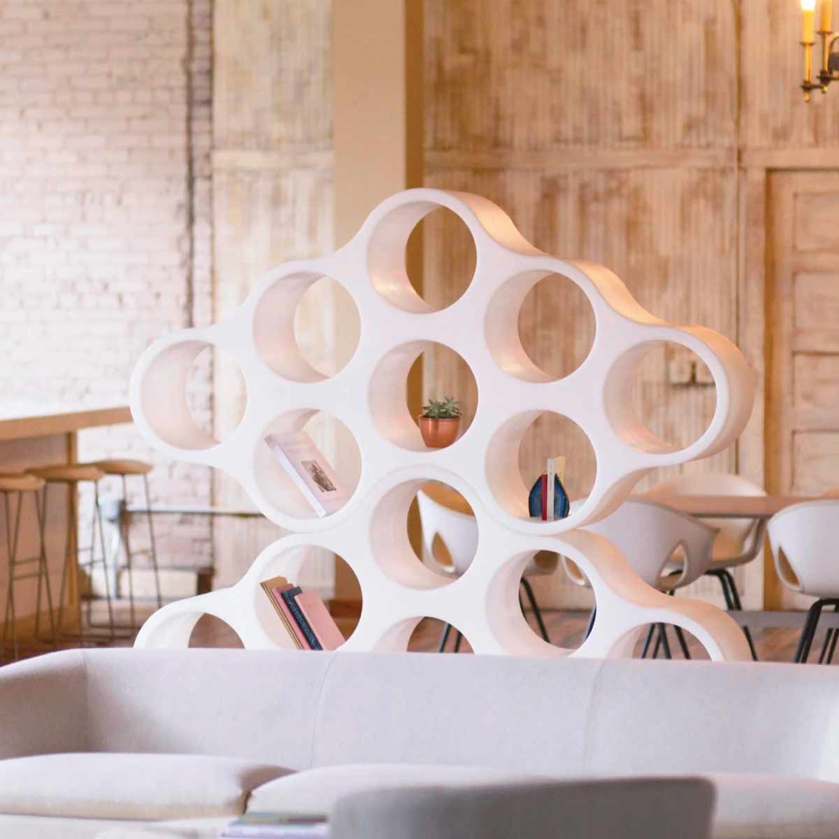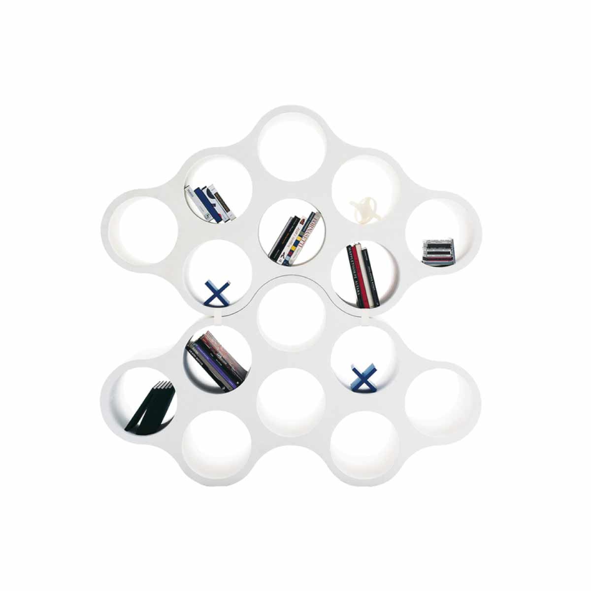 Cloud is a versatile and modular bookcase that is crafted from durable white polyethylene. Created using advanced rotational technology, each element of the bookcase can be used horizontally or vertically and can be combined with other Cloud units to form unique cloud-like structures. The elements come equipped with two white metal pressure clips that allow for easy joining of multiple modules. Furthermore, this bookcase is suitable for outdoor use, providing endless possibilities for design and decoration.